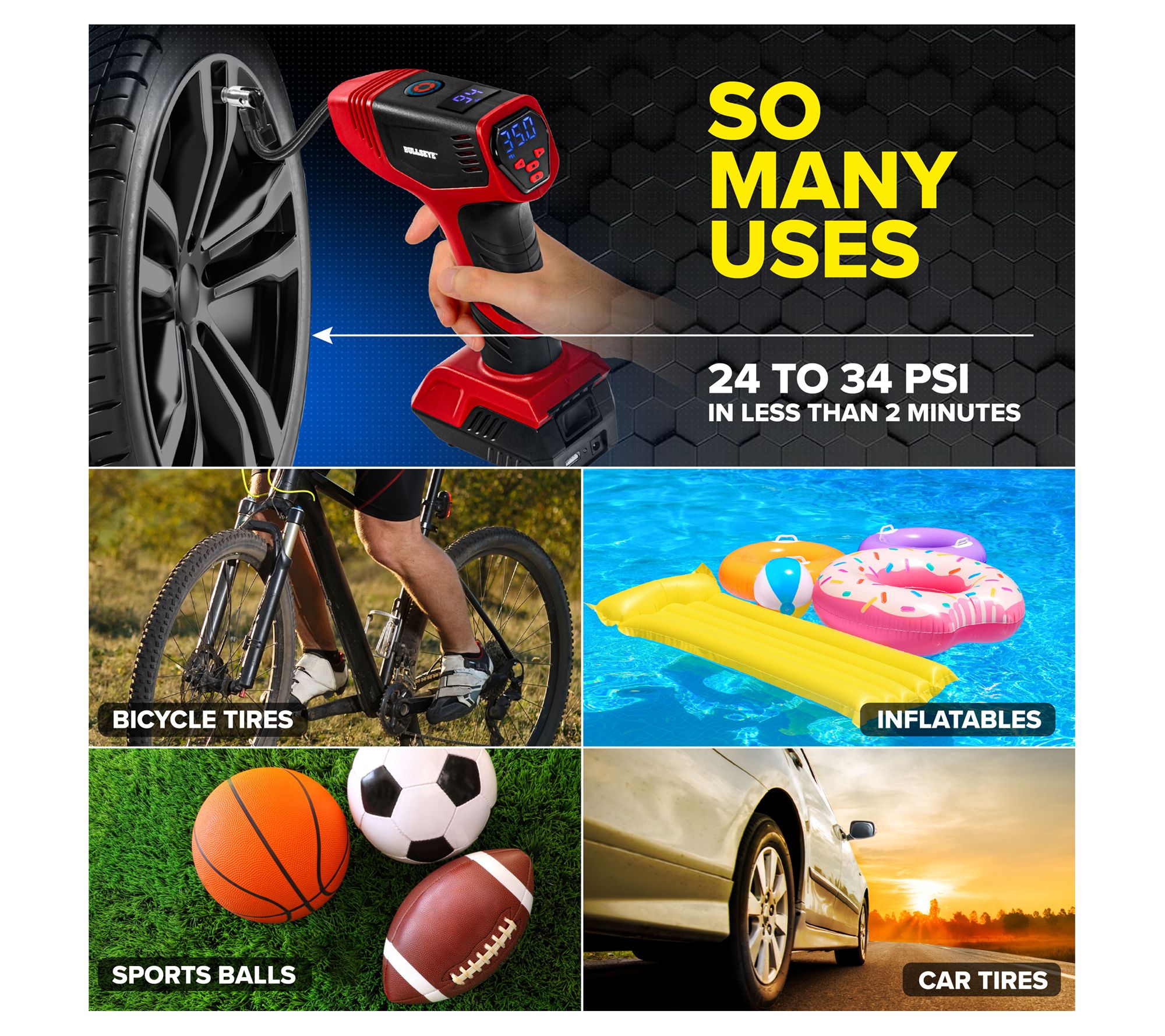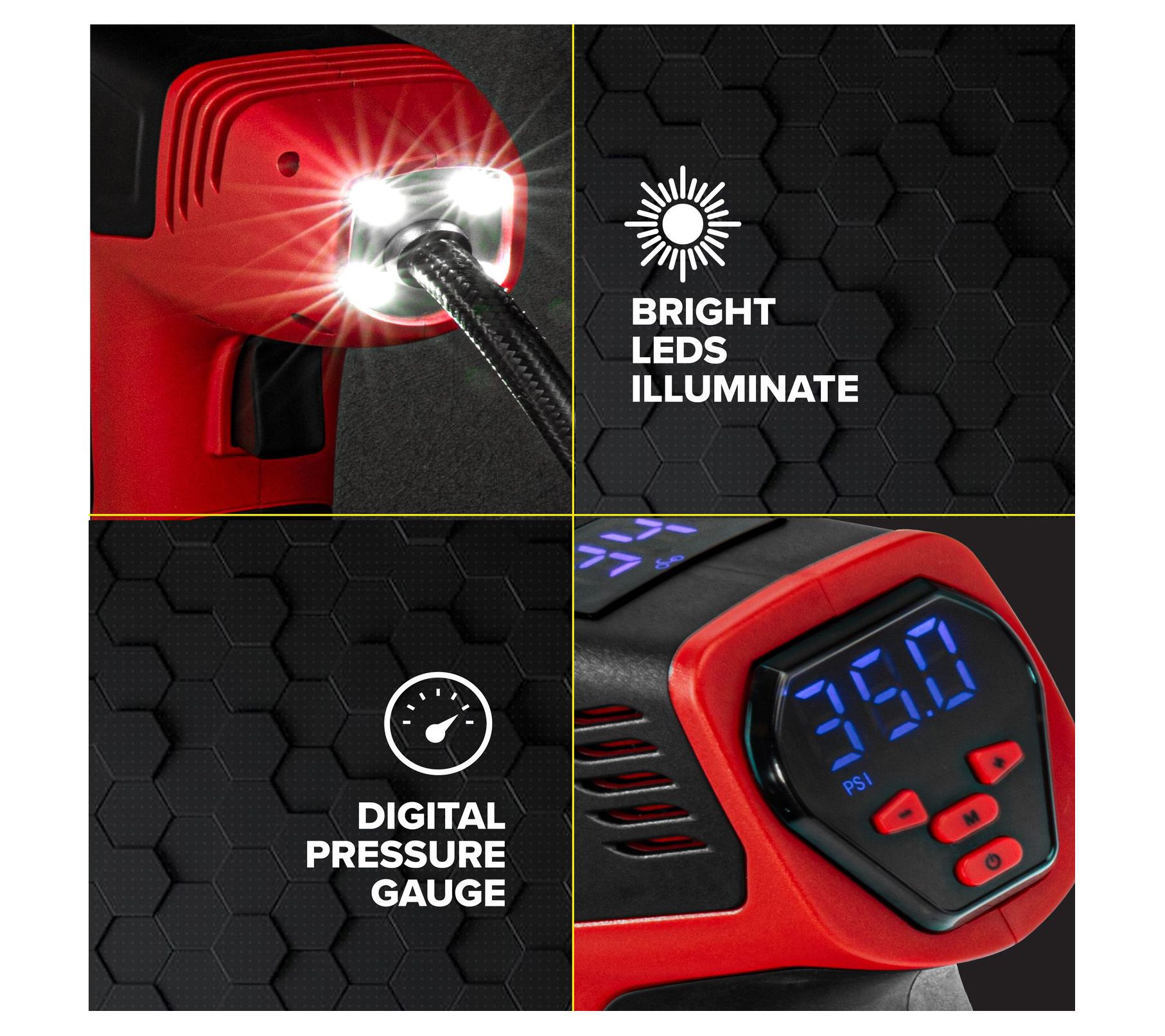 Ensure your vehicle's tires are always at the perfect pressure with this compact, portable compressor. It not only inflates tires quickly but also features an auto shutoff function for precise inflation. Whether you're in your garage or on a dark road, the built-in LED lights ensure visibility and accuracy. From Bullseye Pro.