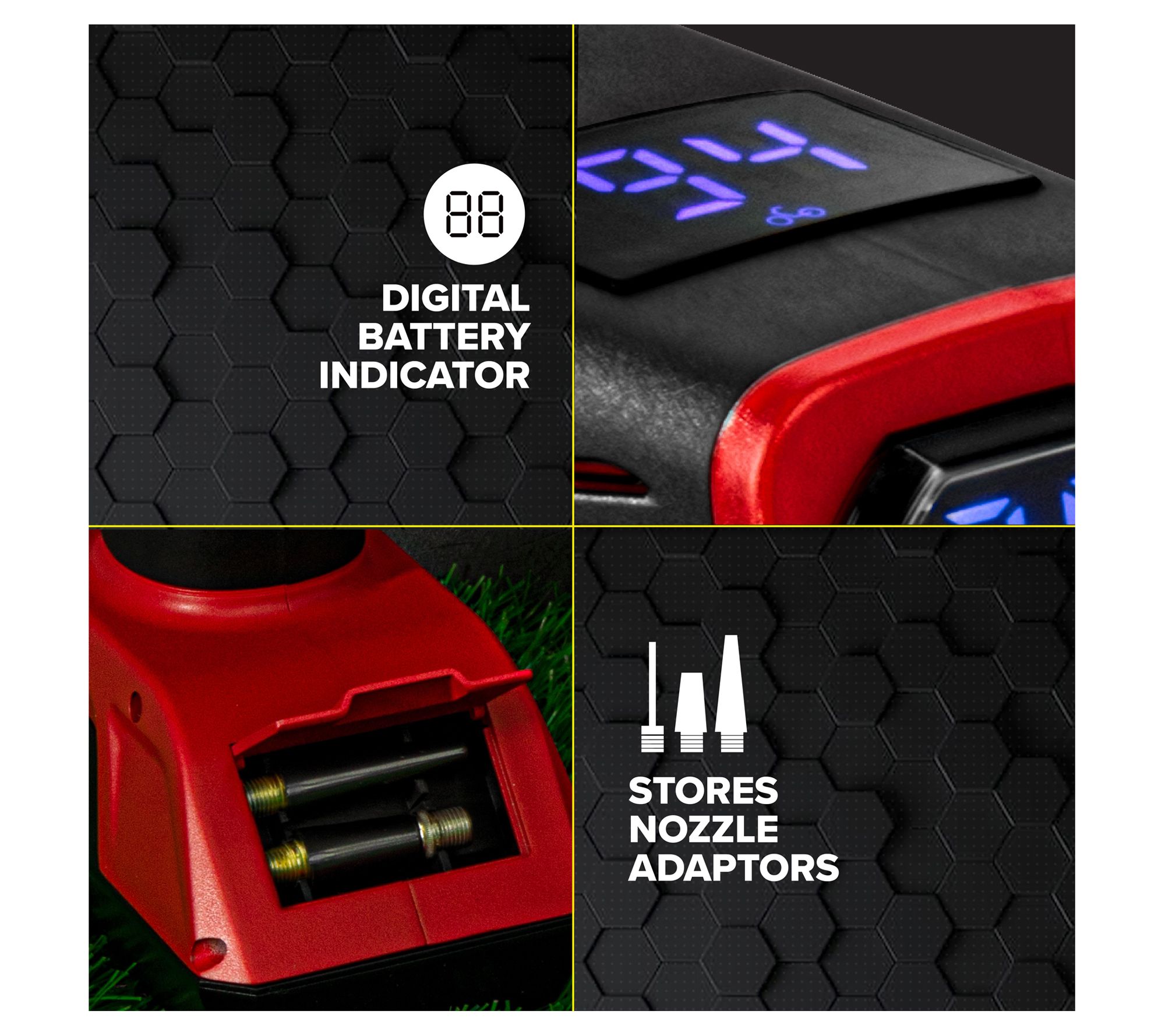• Includes compressor, three nozzle attachments, 15A spare fuse, USB home charger, and car charger