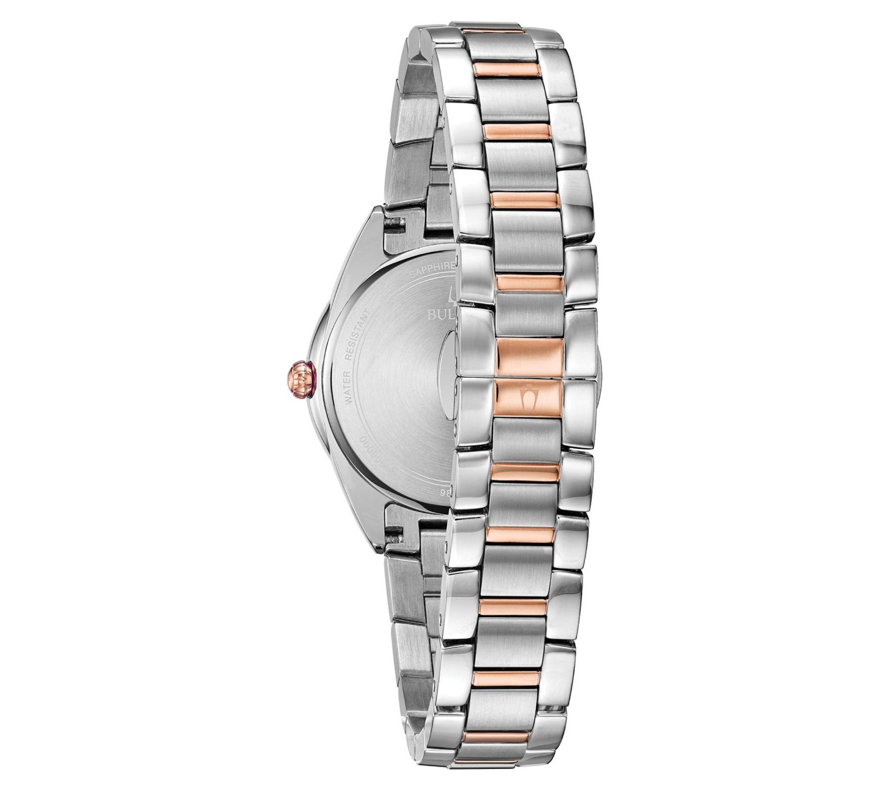 • Round, two-tone stainless steel and rosetone stainless steel case; mineral crystal; push down crown