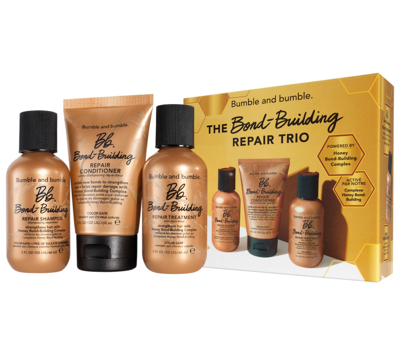 Heat-styling enthusiast? Hair color chameleon? Help strengthen hair with this powerful Bumble and bumble set. Bond-Building Repair Shampoo helps strengthen hair while adding shine and improving elasticity. Bond-Building Repair Conditioner also strengthens strands and instantly detangles, reduces frizz, and smoothes the cuticle for softness and shine. Last but not least, Bond-Building Repair Treatment goes deep to help reverse the look of past damage as well as fortifying hair fibers to protect against future damage.