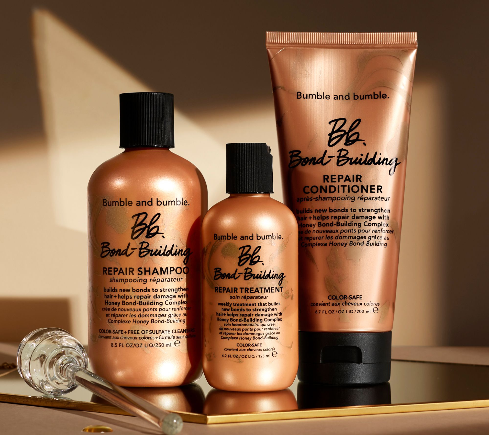 How do I use it: Massage shampoo throughout damp hair and rinse. After cleansing, apply conditioner and leave on for one to two minutes. Rinse. Once a week, after cleansing, apply Bond-Building Repair Treatment from roots to ends. Leave on for five minutes. Rinse.