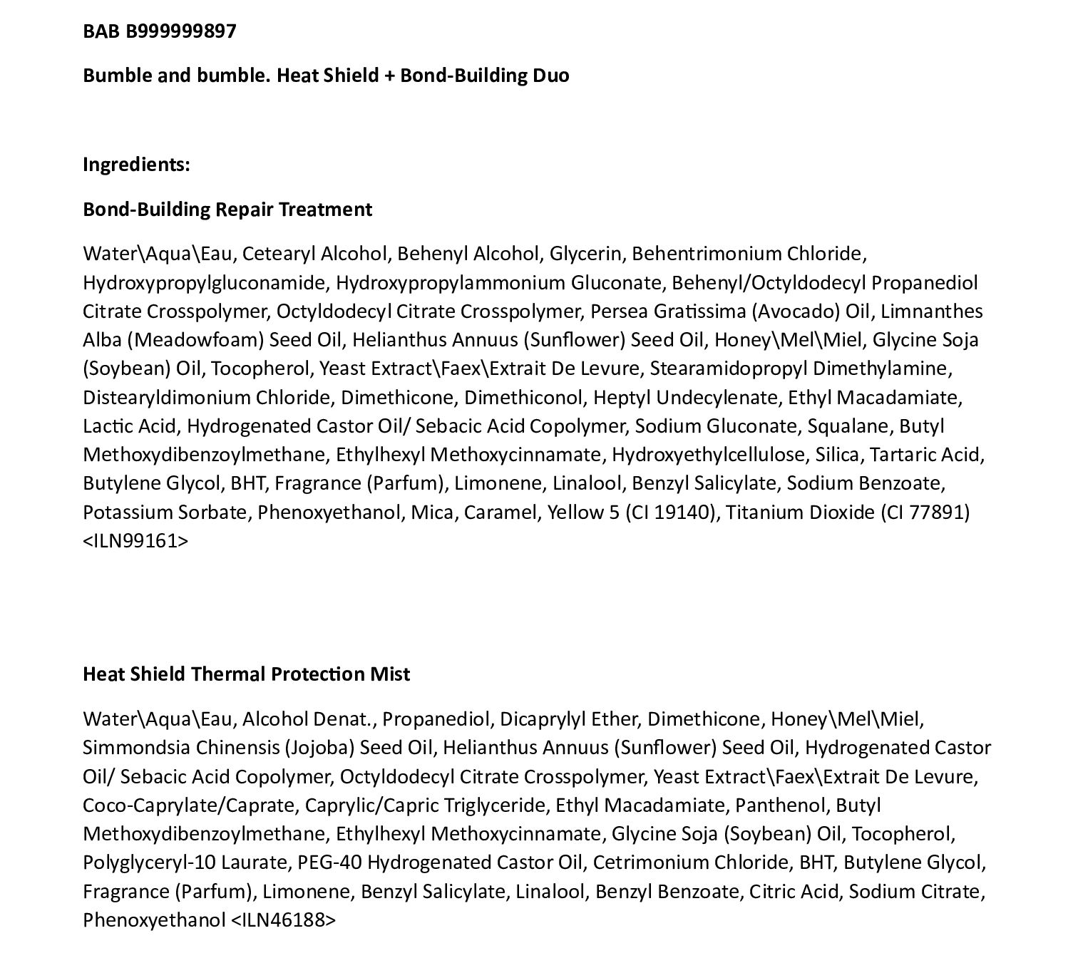 Style fearlessly with this Bumble and bumble. Heat Shield and Bond-Building set. Heat Shield Thermal Protection Mist shields dry hair against heat tools up to 450F, while Bond-Building Repair Treatment goes deep to help reverse the look of past damage, fortifies hair fibers to protect against future damage, and smoothes the cuticle-for shine and softness.