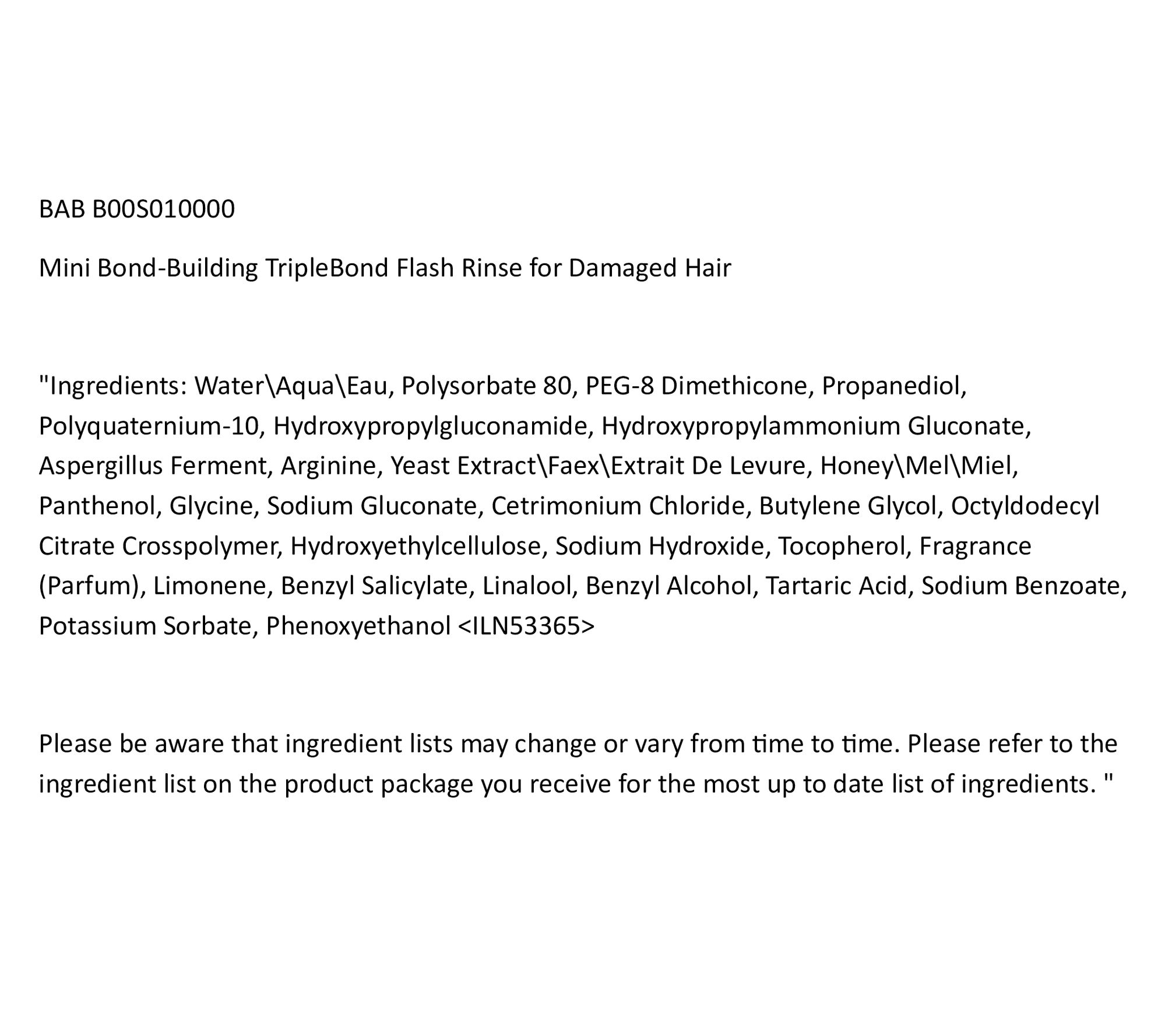 Bond-Building TripleBond Flash Hair Rinse is an instant hair treatment that builds the three essential bond types to help fortify strands. It provides lightweight hydration and leaves hair shiny, detangled, and soft. It helps combat dullness and dryness (a.k.a. visible signs of damaged hair). It's powered by Honey Bond-Building TripleBond Complex, which builds three types of bonds (hydrogen, ionic, and covalent) in the cortex to help fortify hair from the inside out. Micellar Conditioning Technology attracts and lifts away impurities while conditioning and adding shine.