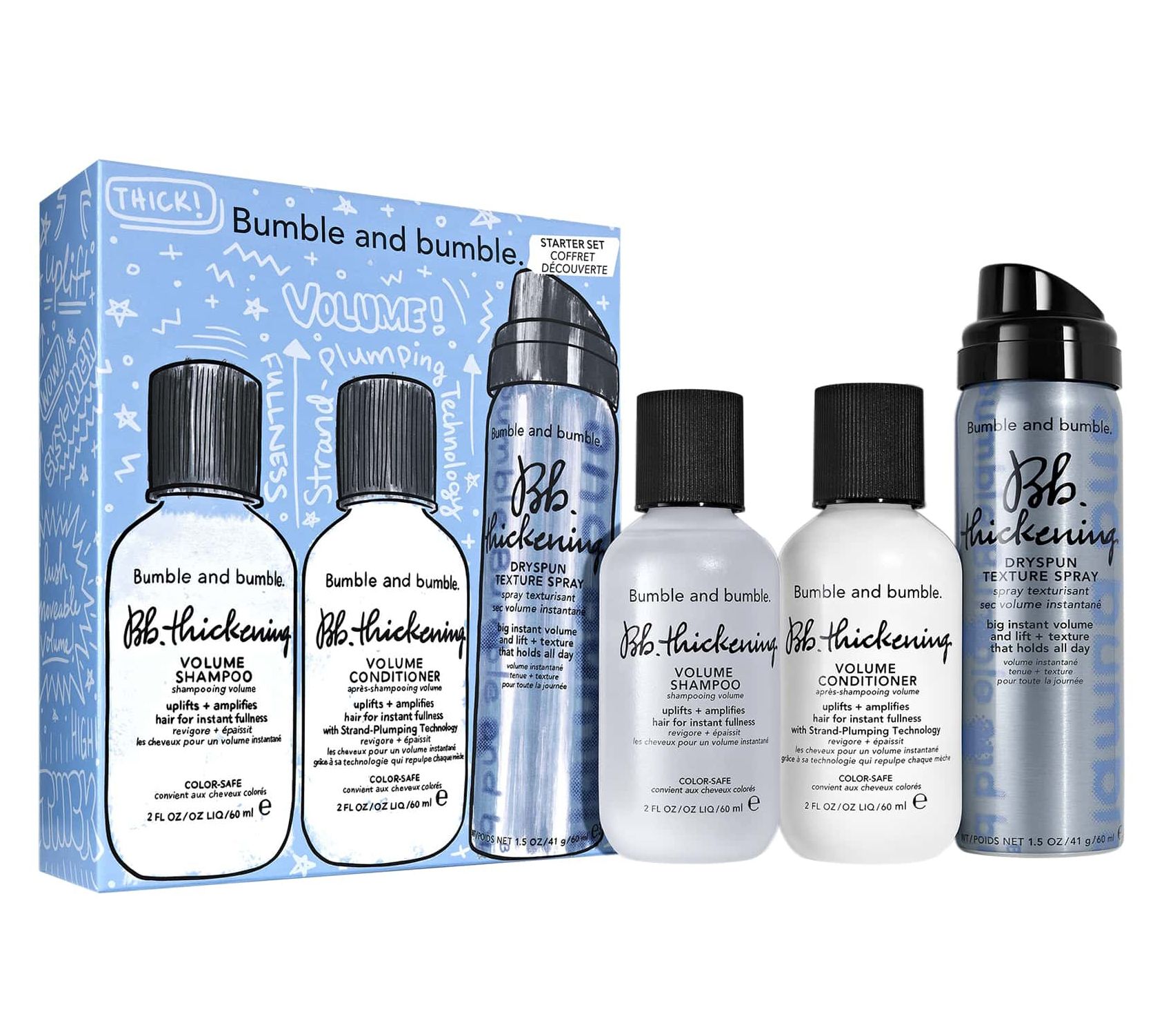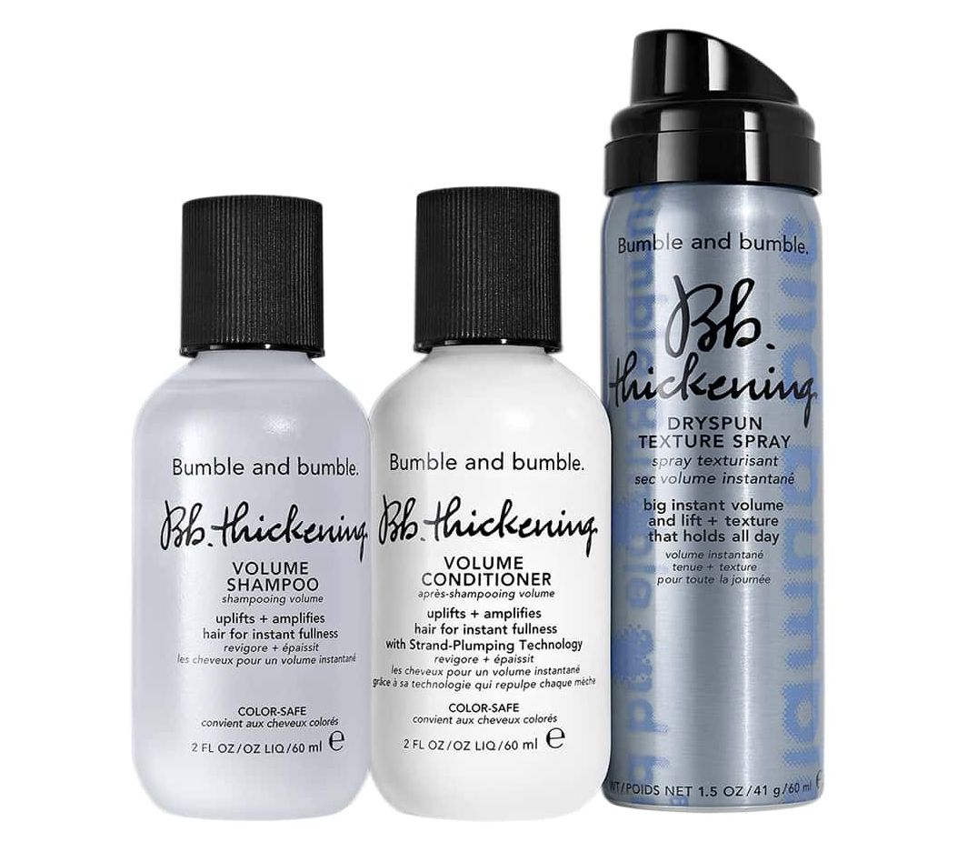 Bumble and bumble.'s travel-size set includes three volumizing hair products to help uplift and amplify hair while instantly plumping each strand. When used together, this thickening routine plumps strands for a thicker, fuller look.