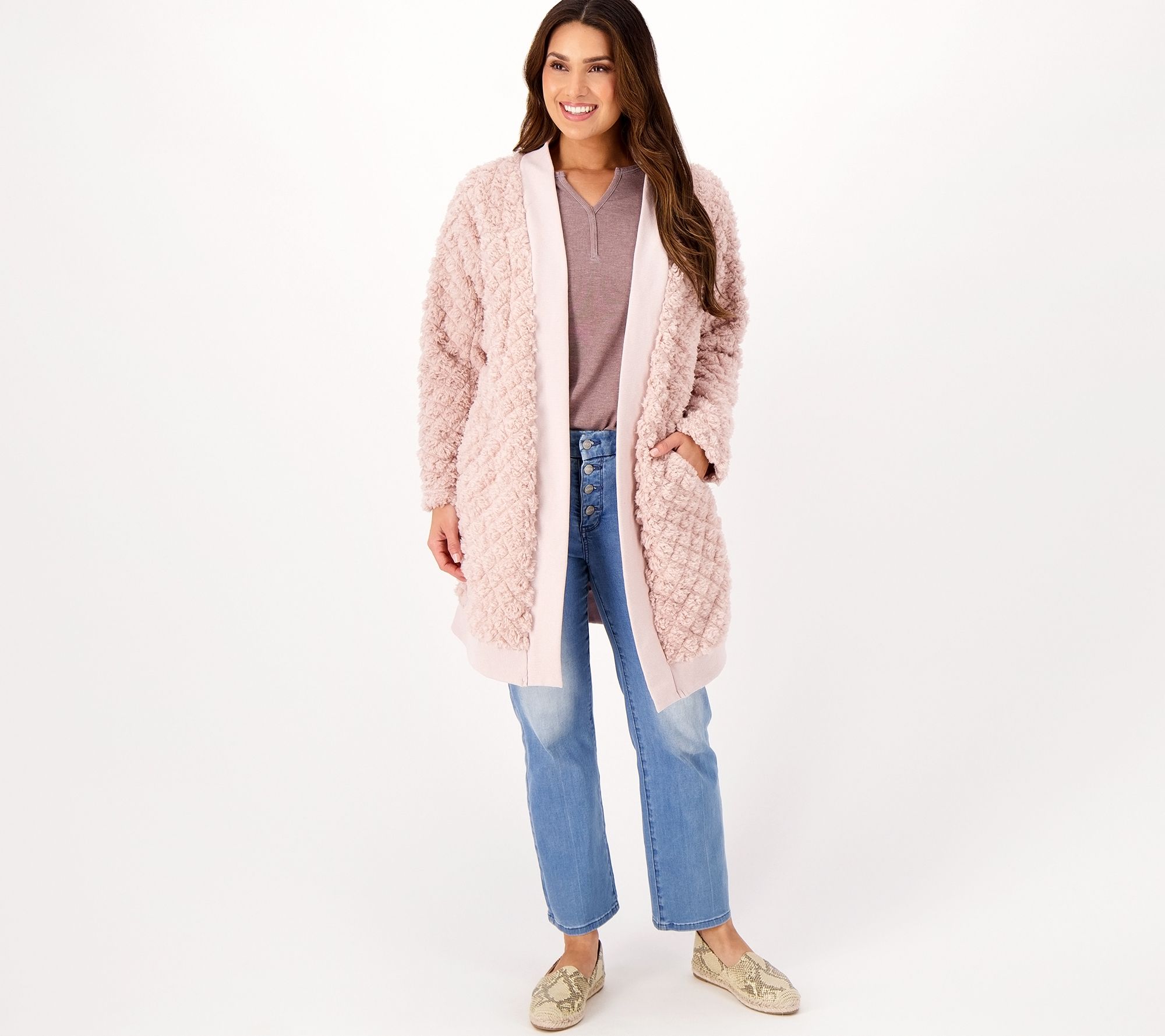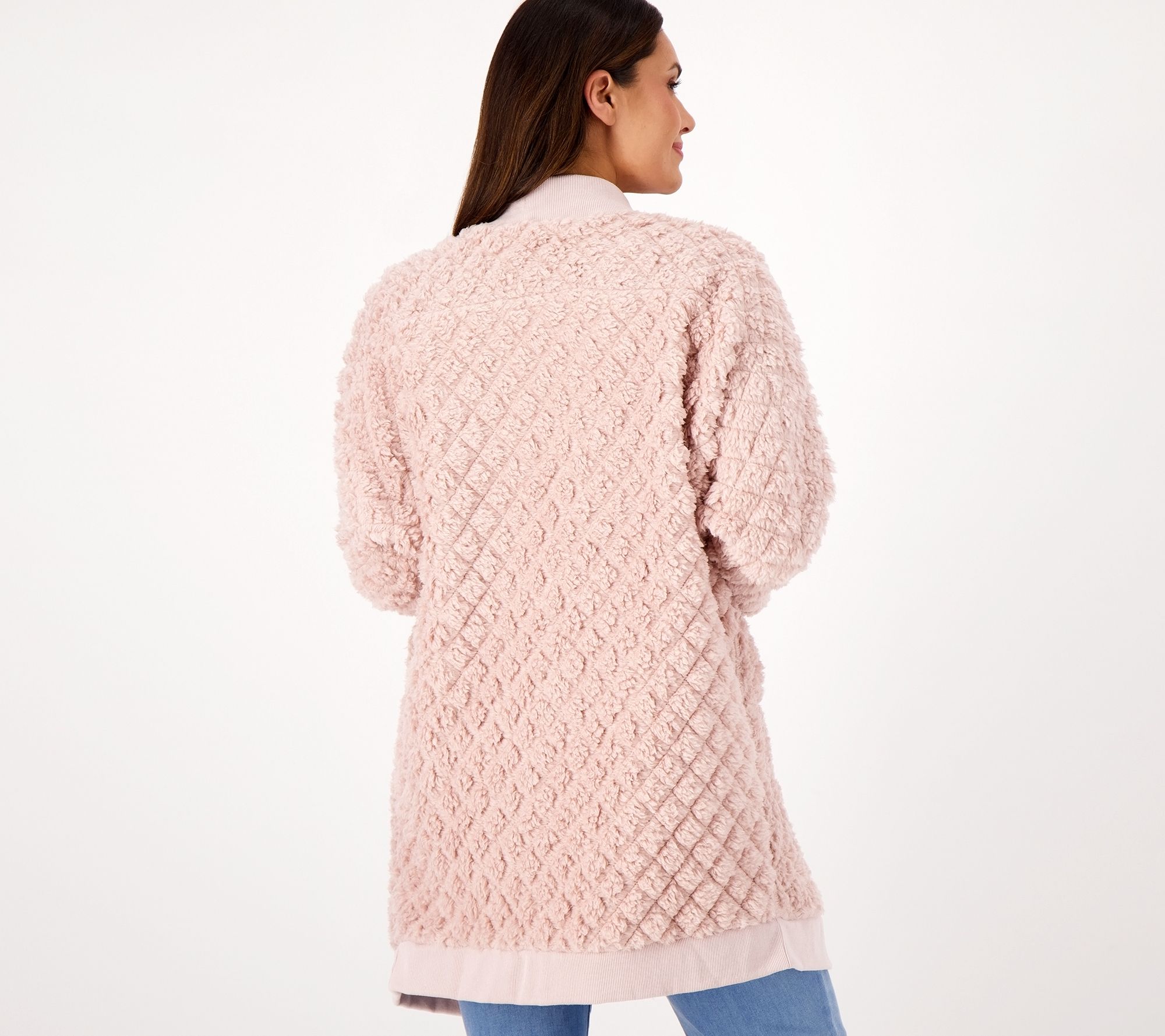 Where cozy meets stylish. A diamond pattern and open front make this faux-Sherpa cardigan a must-have from one season to the next. From BumbleBella by Jill Martin.