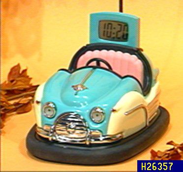 Wake up with a smile to this whimsical alarm clock, pop-up lighted LCD display, push the hood for alarm off and night light, blinking headlights synchronized with alarm, push-button sound activation, and a soft rubber bumper and seat. Turquoise and cream in color. Requires three "AA" batteries-not included. Approx. 4 3/4"W x 7"D x 9 1/2"H. Made in China.