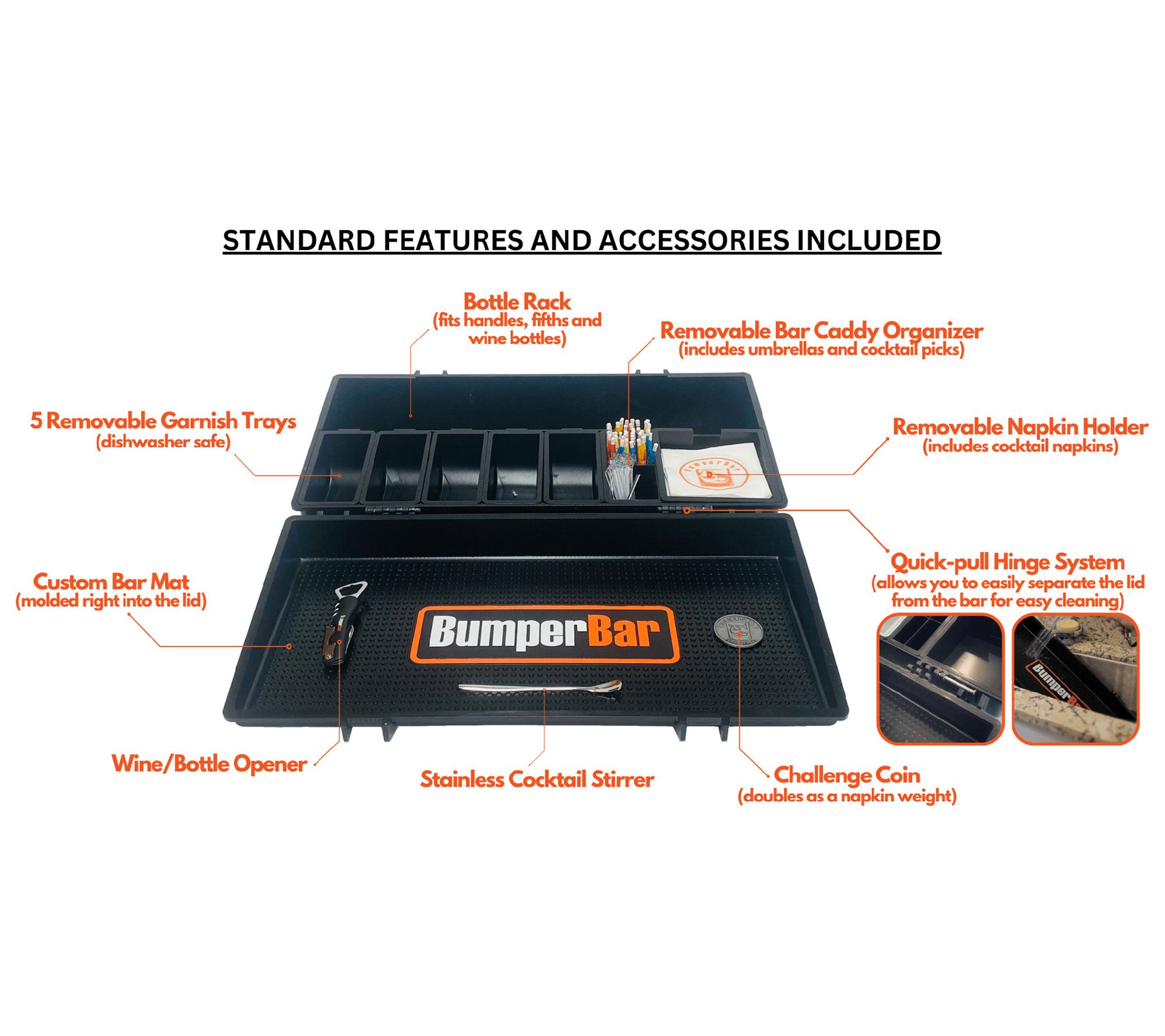 • Includes BumperBar with cutting board, shaker, jigger, muddler/stir spoon, five garnish trays with lids, four bottle spouts, removable bar caddy organizer, removable napkin holder, cocktail napkins, cocktail umbrellas, cocktail picks, wine/bottle opener, and a challenge coin