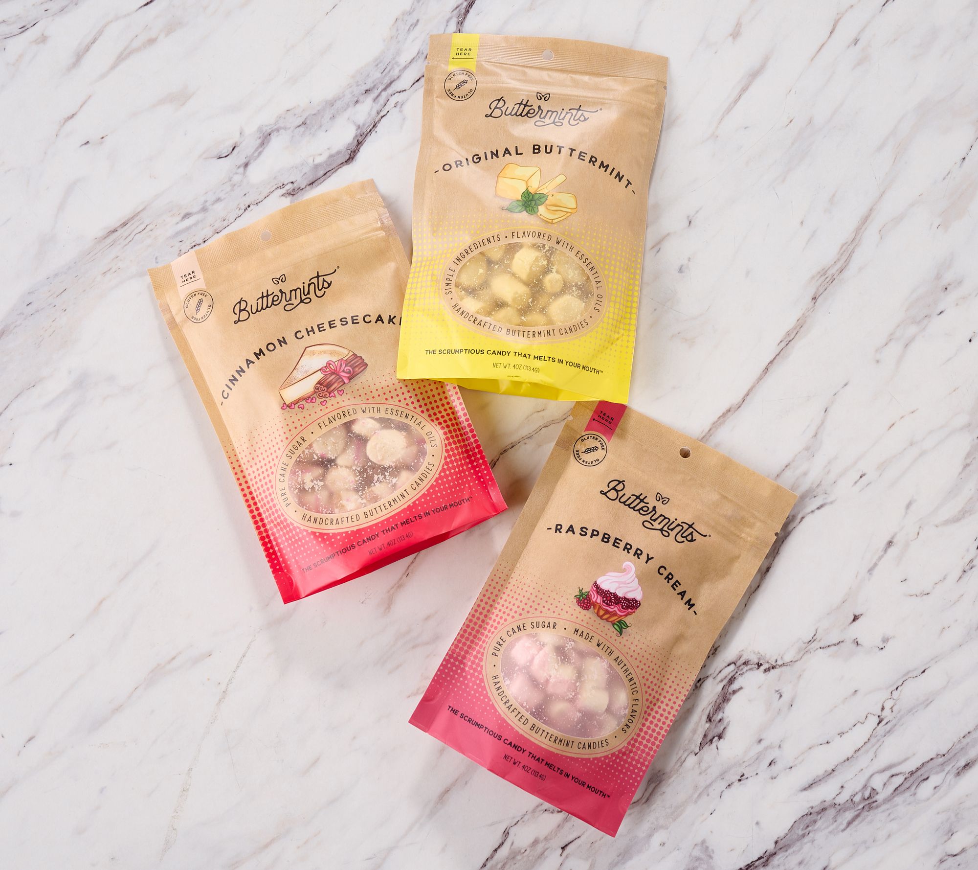 • Includes three 4-oz bags of soft Buttermints: one each of Raspberry Cream, Original Buttermint, and Cinnamon Cheesecake