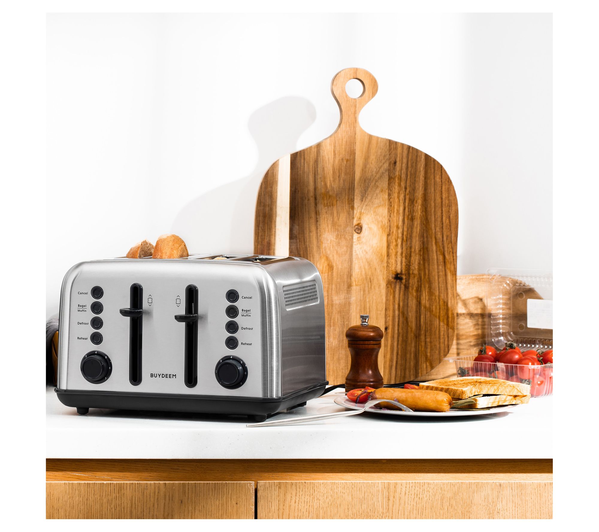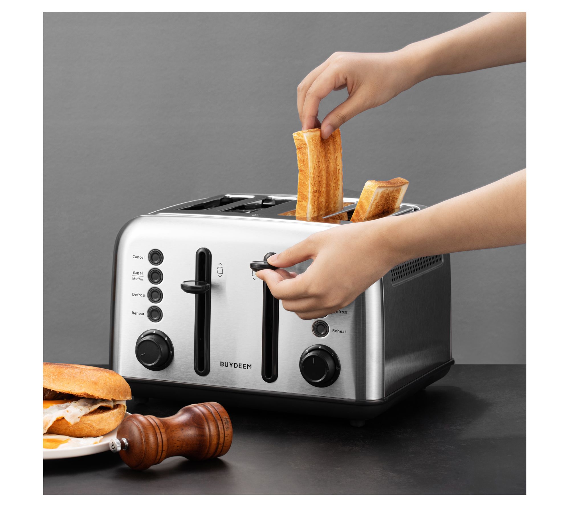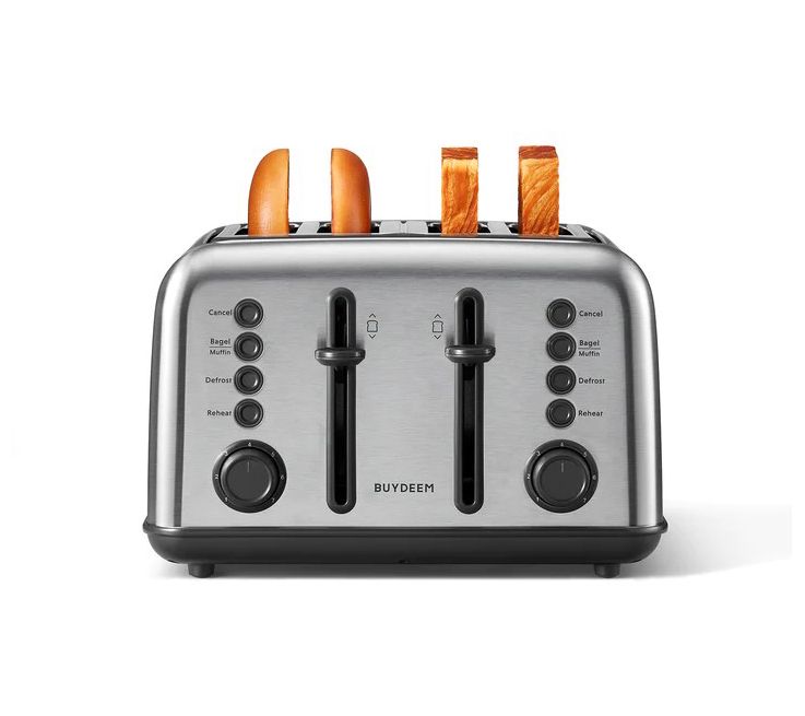 Start your day off right with this four-slice toaster, featuring a True Bagel toasting function that crisps the cut side while warming the other, ensuring a perfect bagel every time. Its extra-wide slots accommodate various bread types, while the dual independent control panels offer a customized toasting experience with seven shade settings. From BUYDEEM.