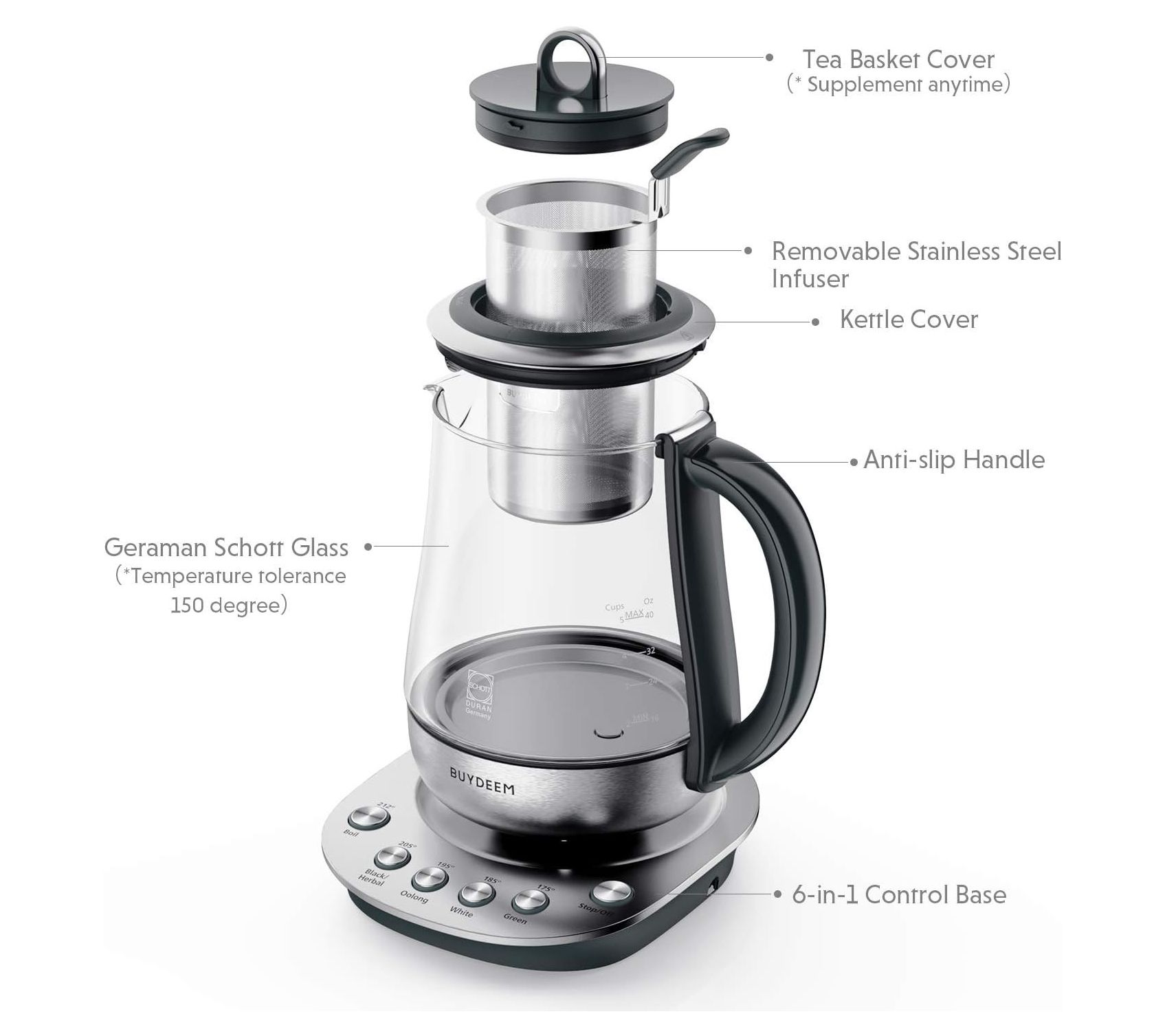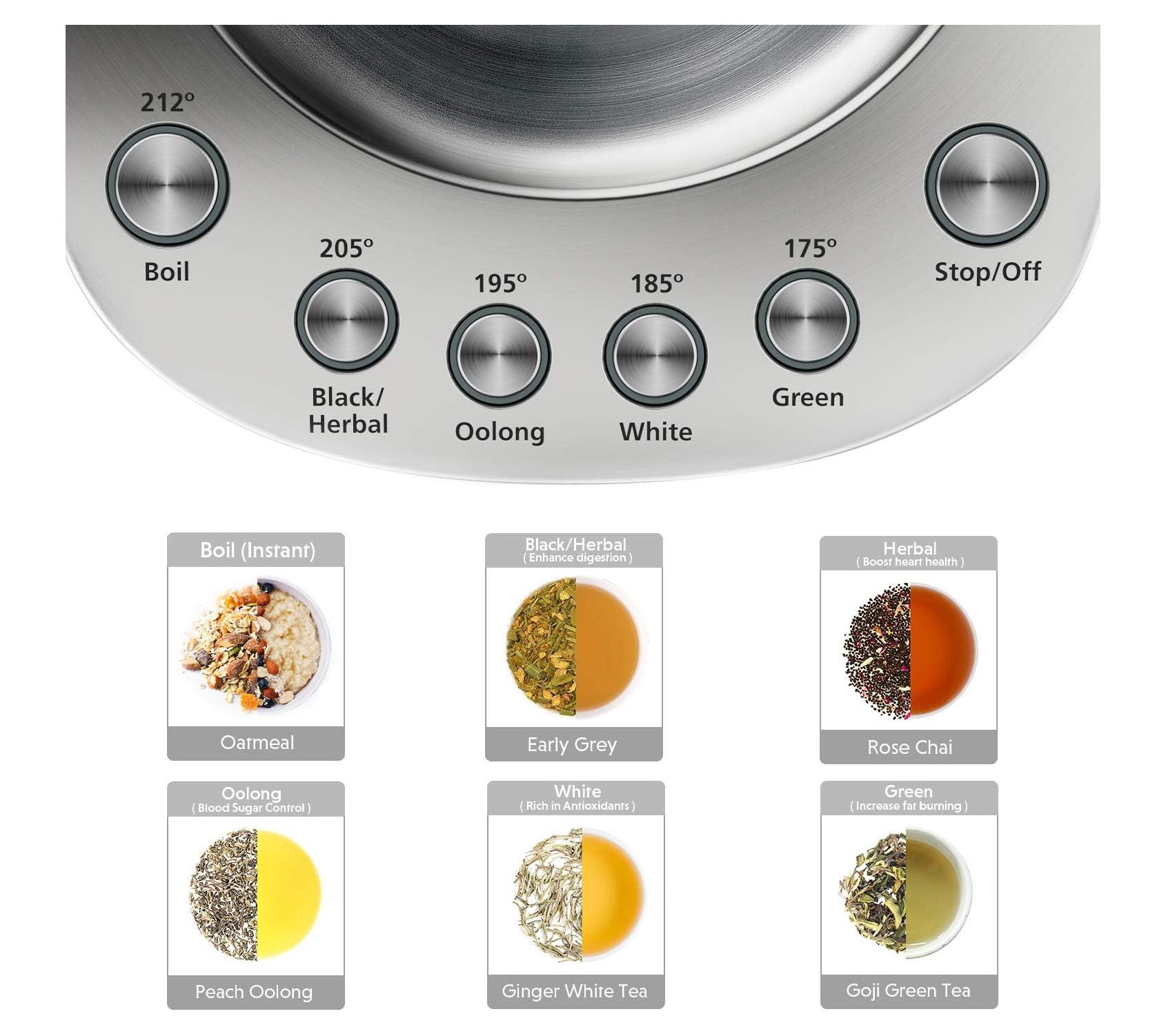 6-in-1 control base: boil, black/herbal, oolong, white, green, and stop/off