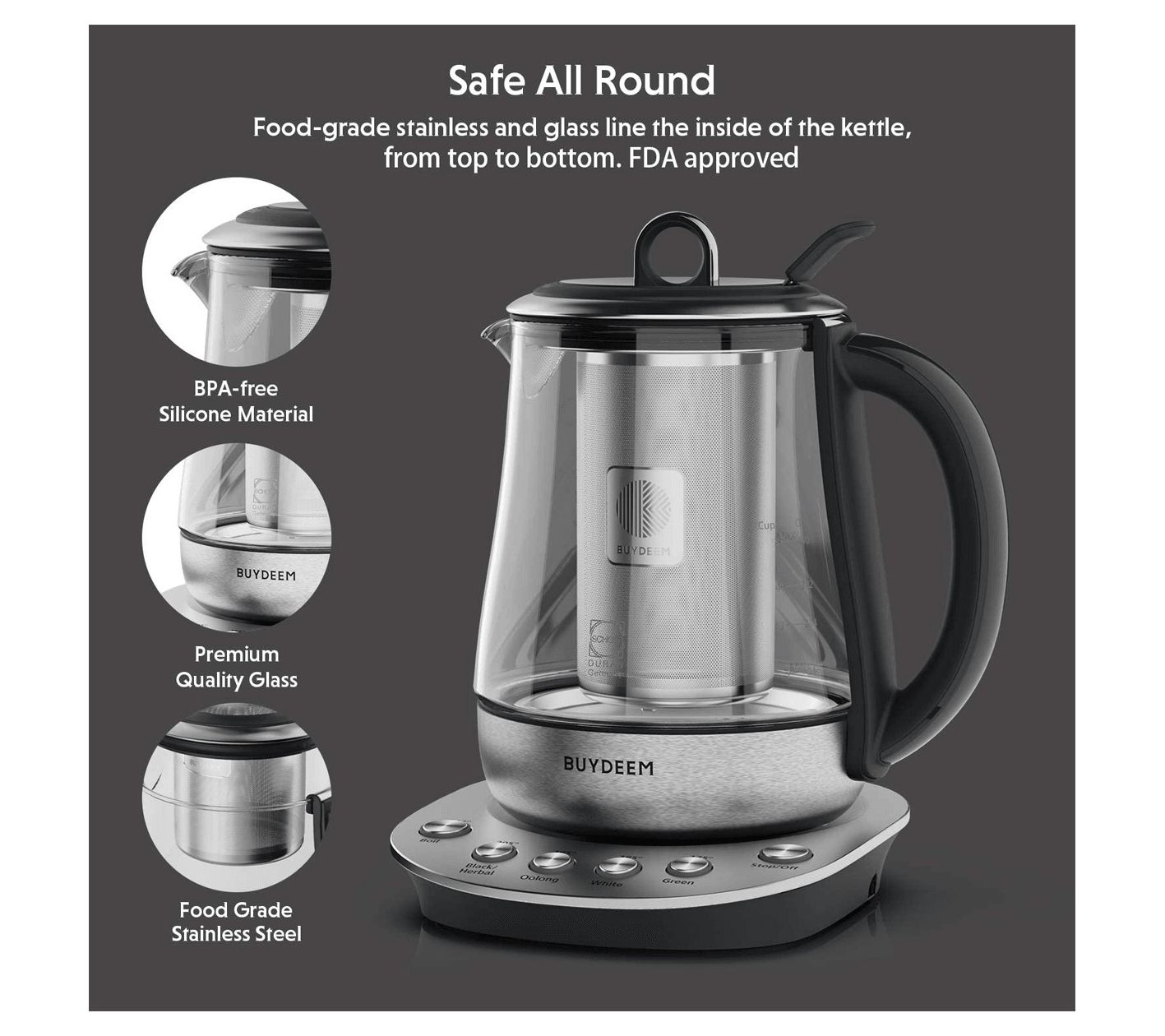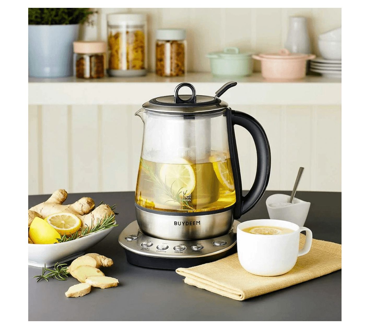 Elevate your sipping experience with this clever electric kettle, designed for the discerning tea lover. With six pre-programmed settings, achieving the perfect temperature for each tea type is just a click away. The kettle also features an auto keep-warm function that maintains your brew at the ideal temperature for up to an hour, plus a user-friendly design with a stainless steel removable infuser and sleek glass construction. From BUYDEEM.