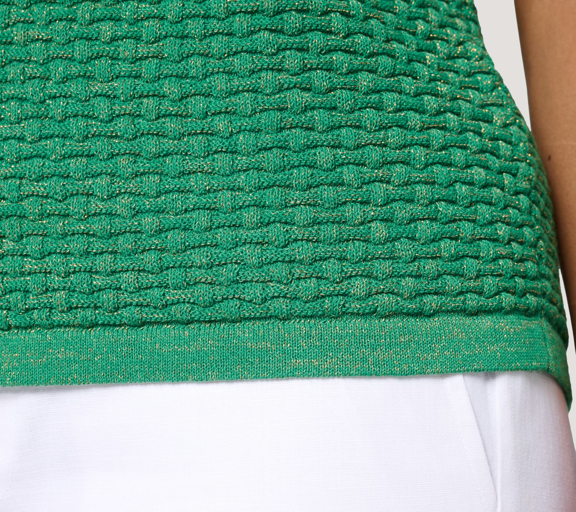Features: metallic Lurex detailing; basketweave body; jersey tubular trim at neckline, sleeveless armholes, and hem
