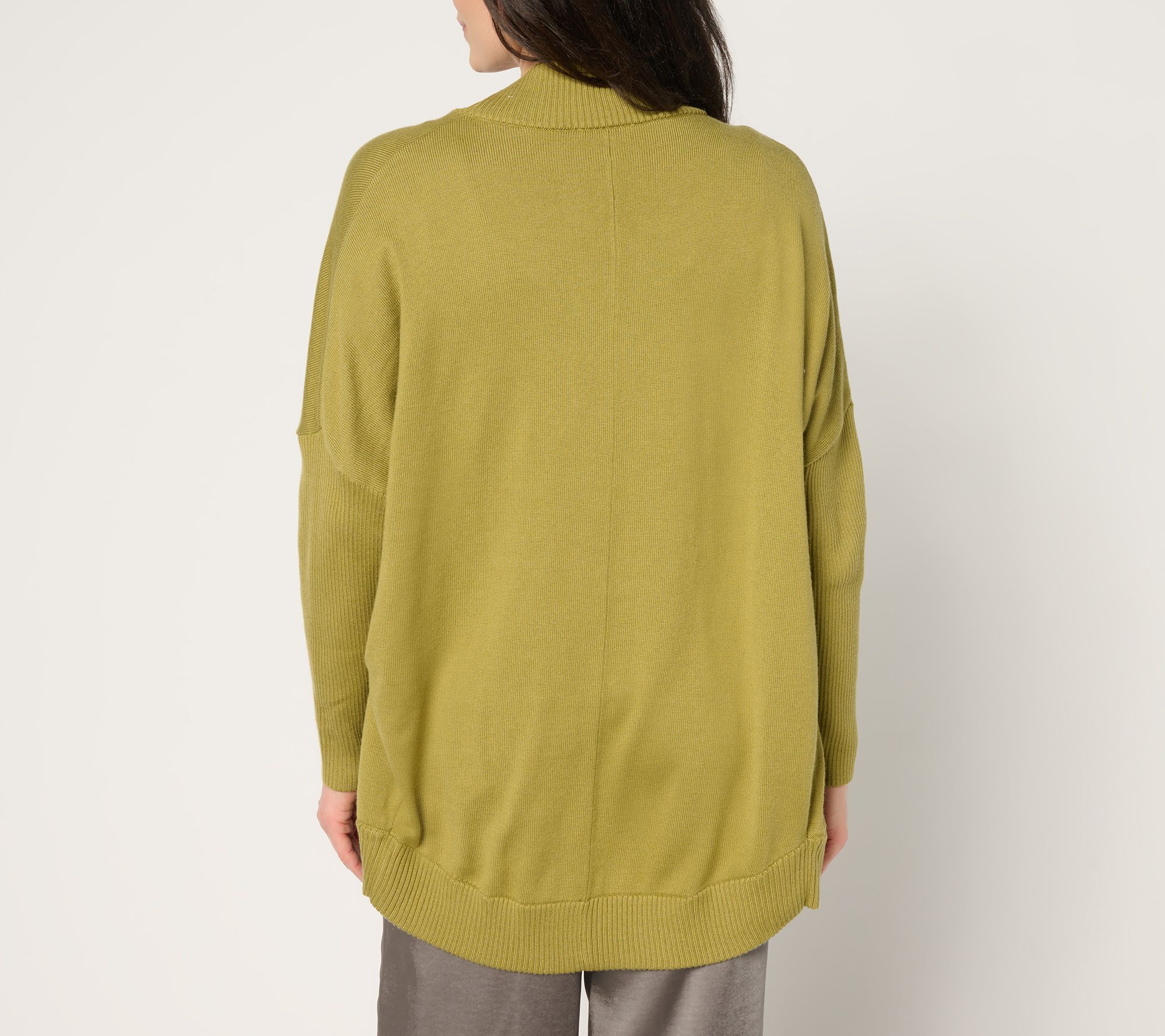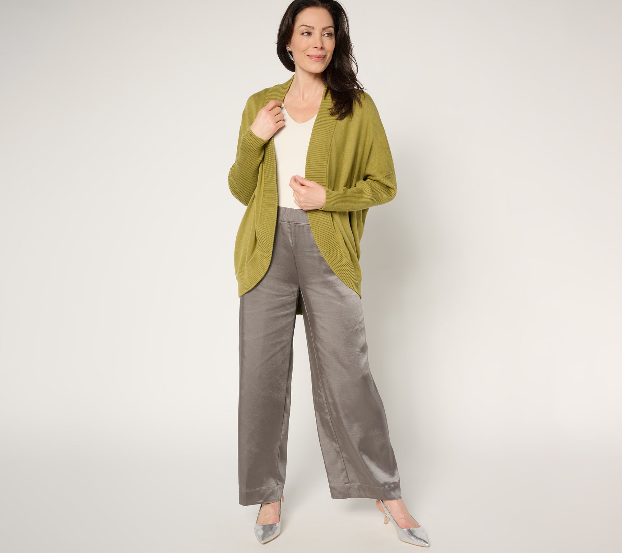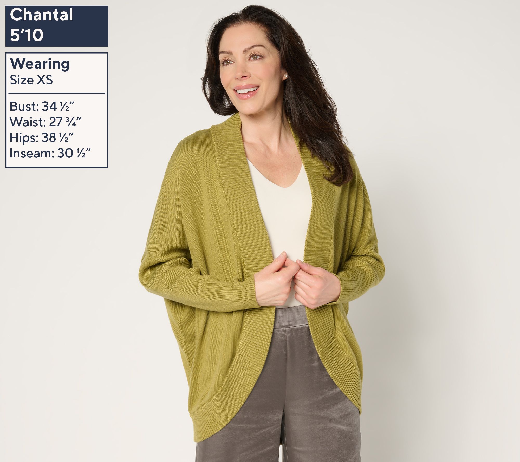 Simply effortless, this draped cocoon cardigan gives you an effortlessly chic layer that provides cozy comfort (love the double rib trim!) in a stylish silhouette. From by Stacy London.