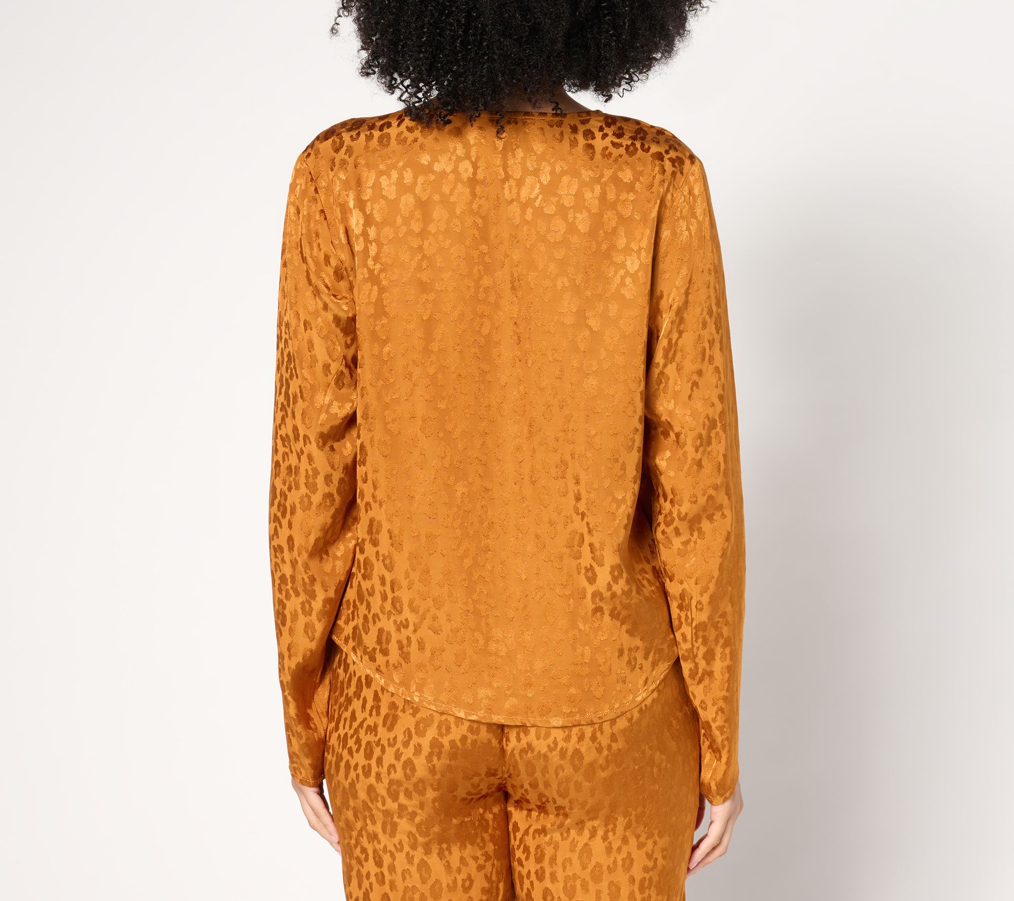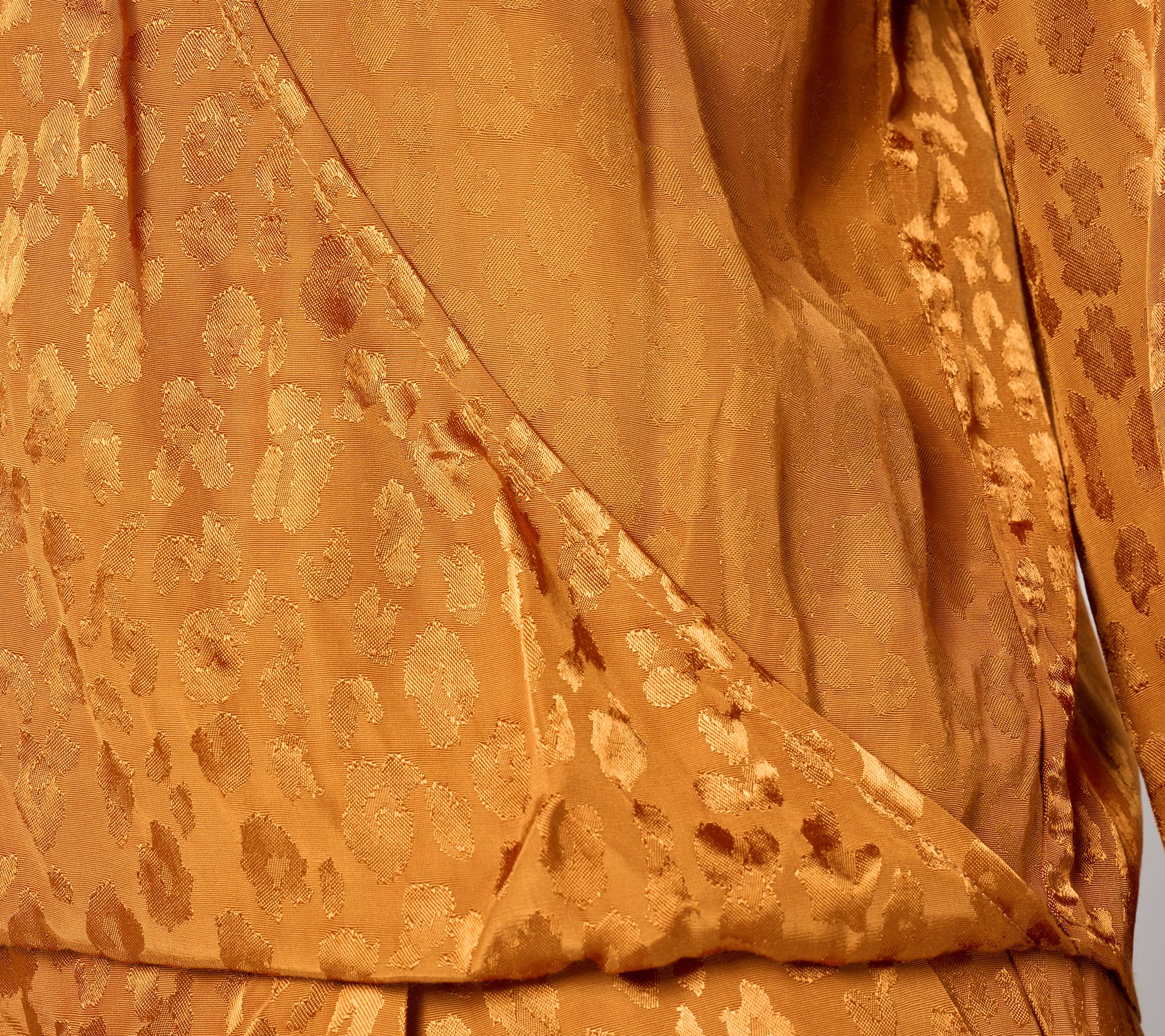 Features: long sleeves, twisted draped front, V-neck, turnback hem