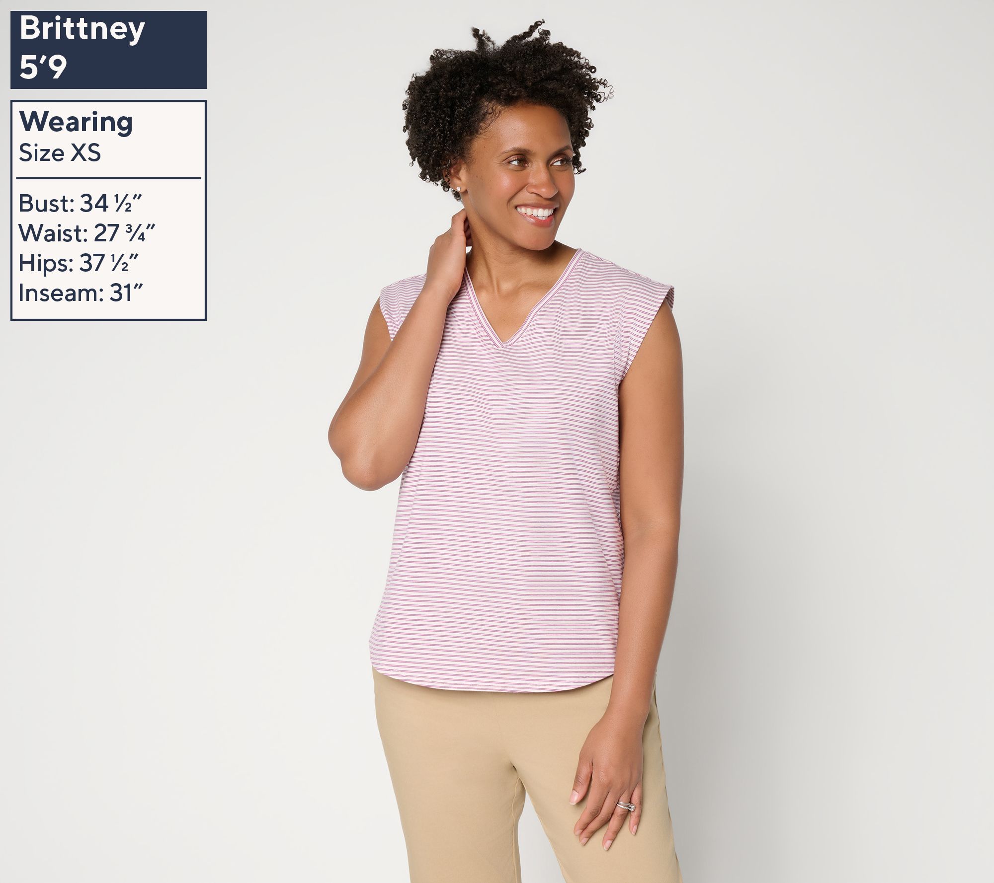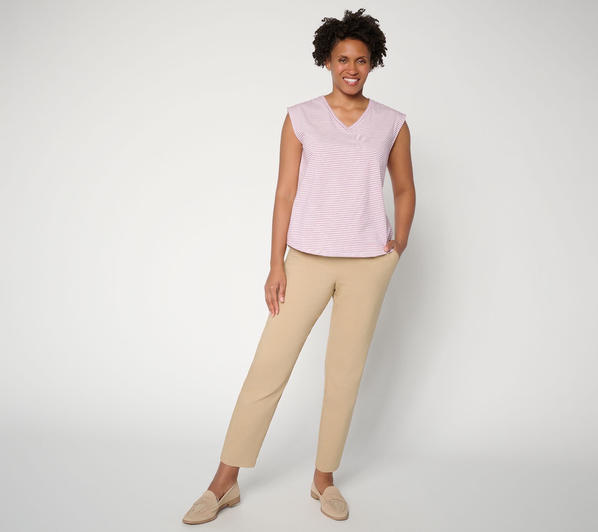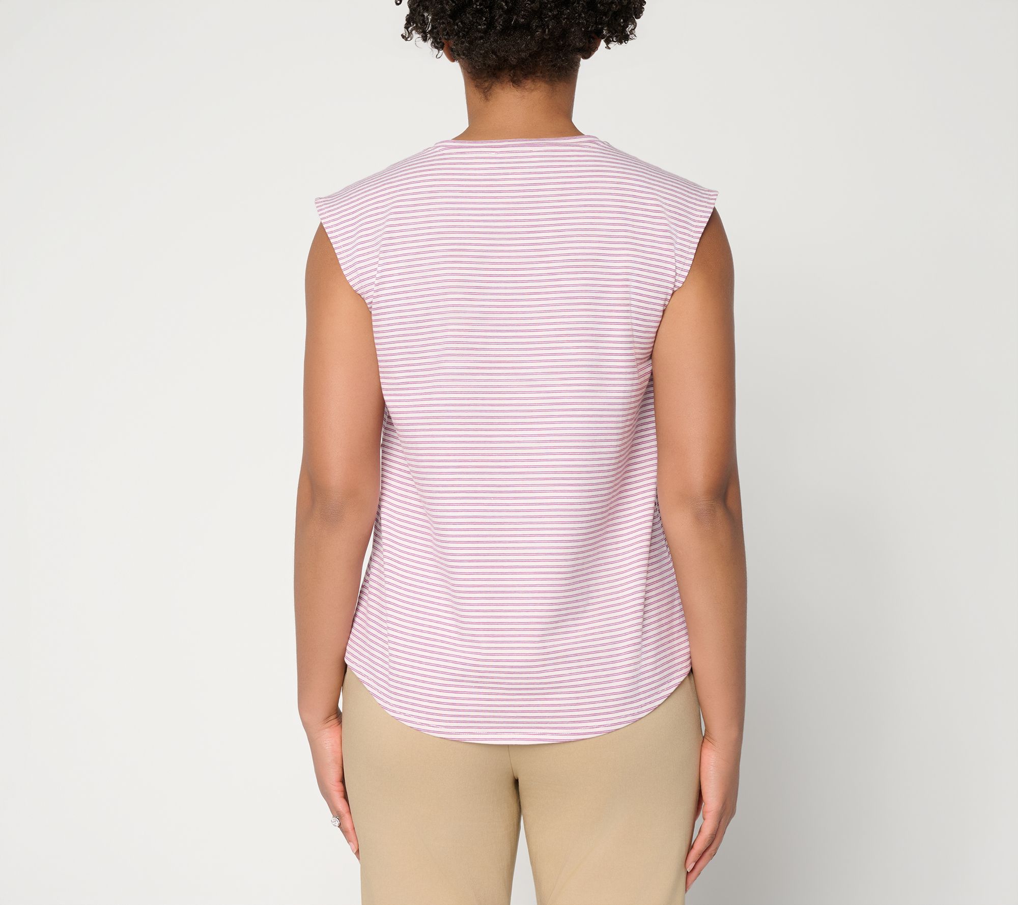 Grab and go, go go! Shopping runs, lunch dates, or spontaneous outings are made simple with this knit tank top. The clean-finished V-neckline and armholes add a crisp look, while the curved hem softly frames your layers -- style it under a blazer or wear on its own with casual pants for easygoing polish. From by Stacy London.
