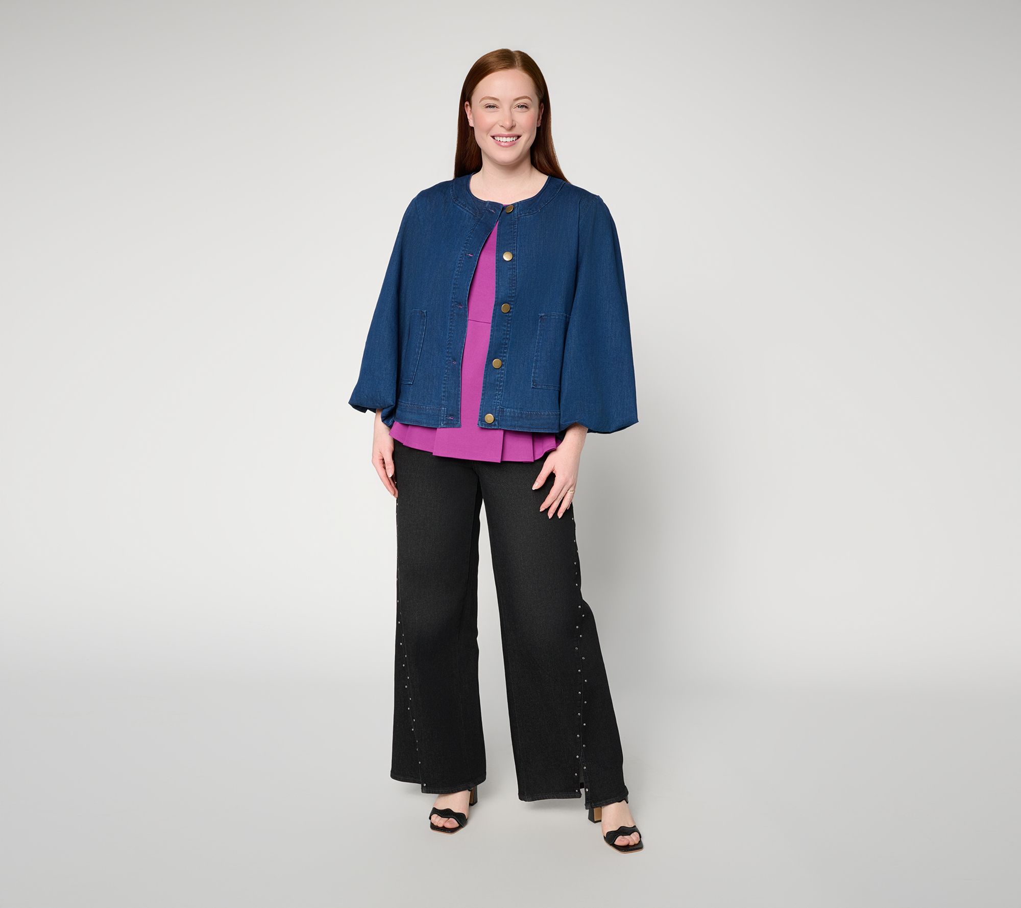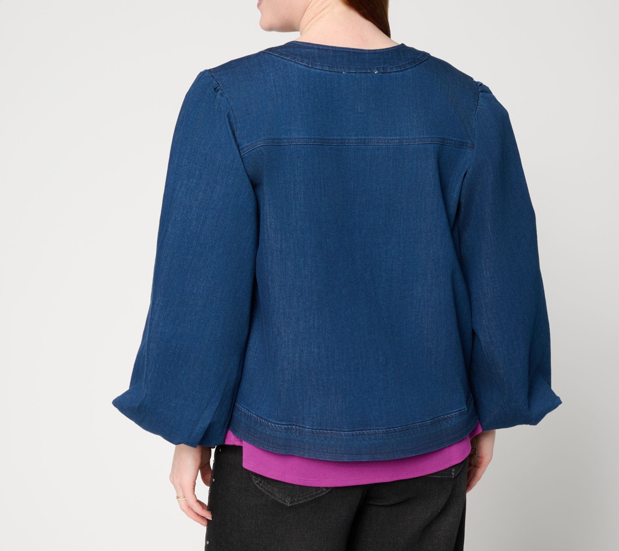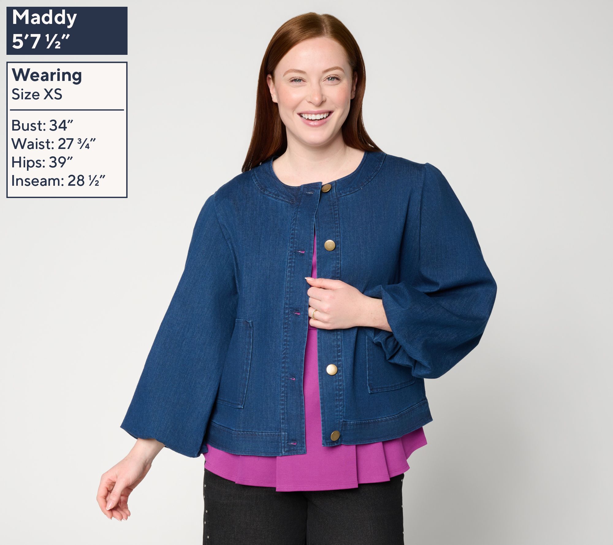 The perfect topper, this denim jacket is fashioned with bracelet-length bubble sleeves with shirring, a front button closure, and patch pockets. Pair it with anything from tanks to tees to sundresses. From by Stacy London.