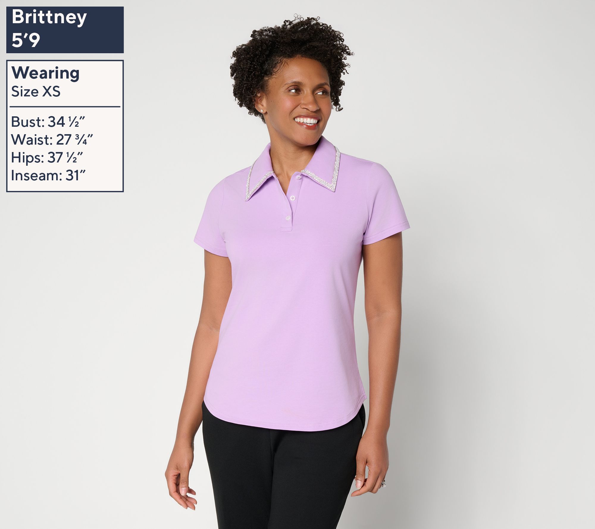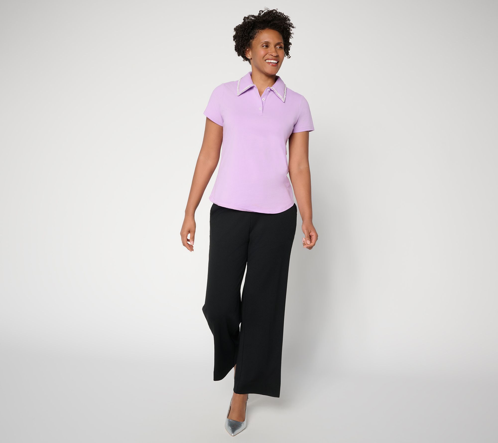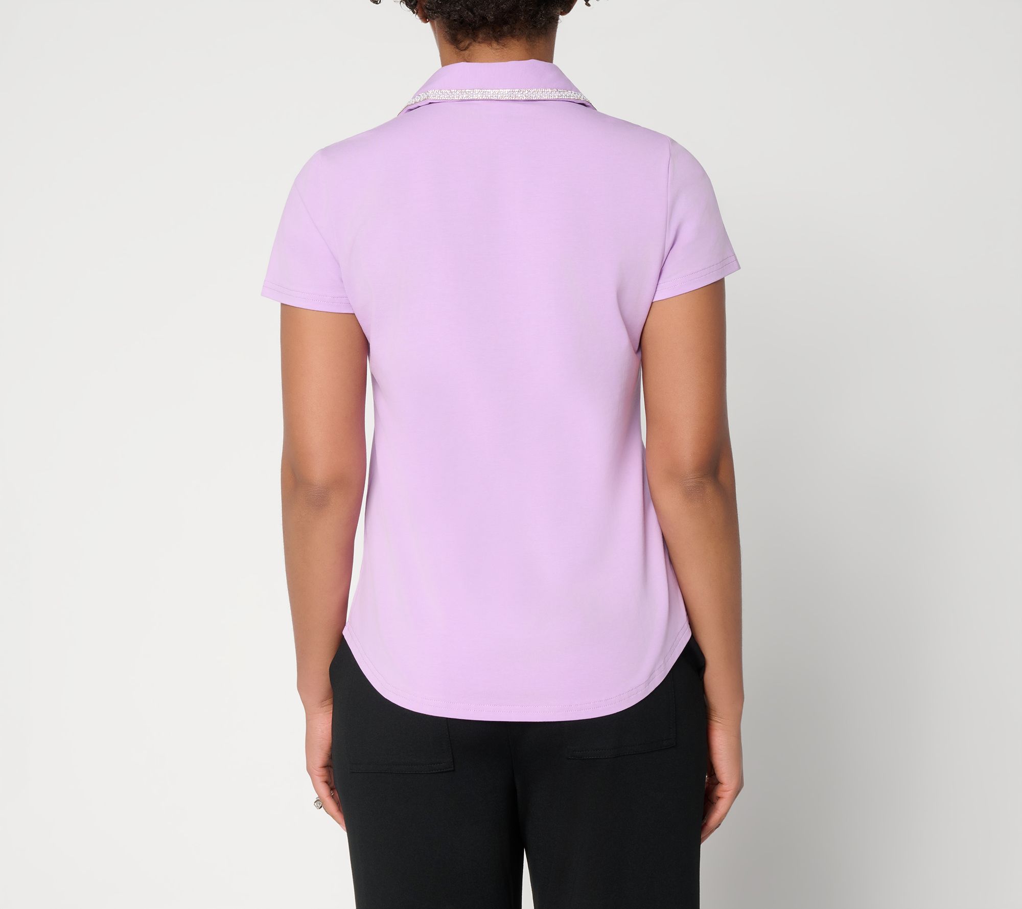 Outings become more memorable in this jersey polo blouse, highlighted by a jeweled collar that sparkles with every movement. The soft-knit design offers daylong comfort, making it a stylish choice for business lunches or meeting friends over brunch. From by Stacy London.