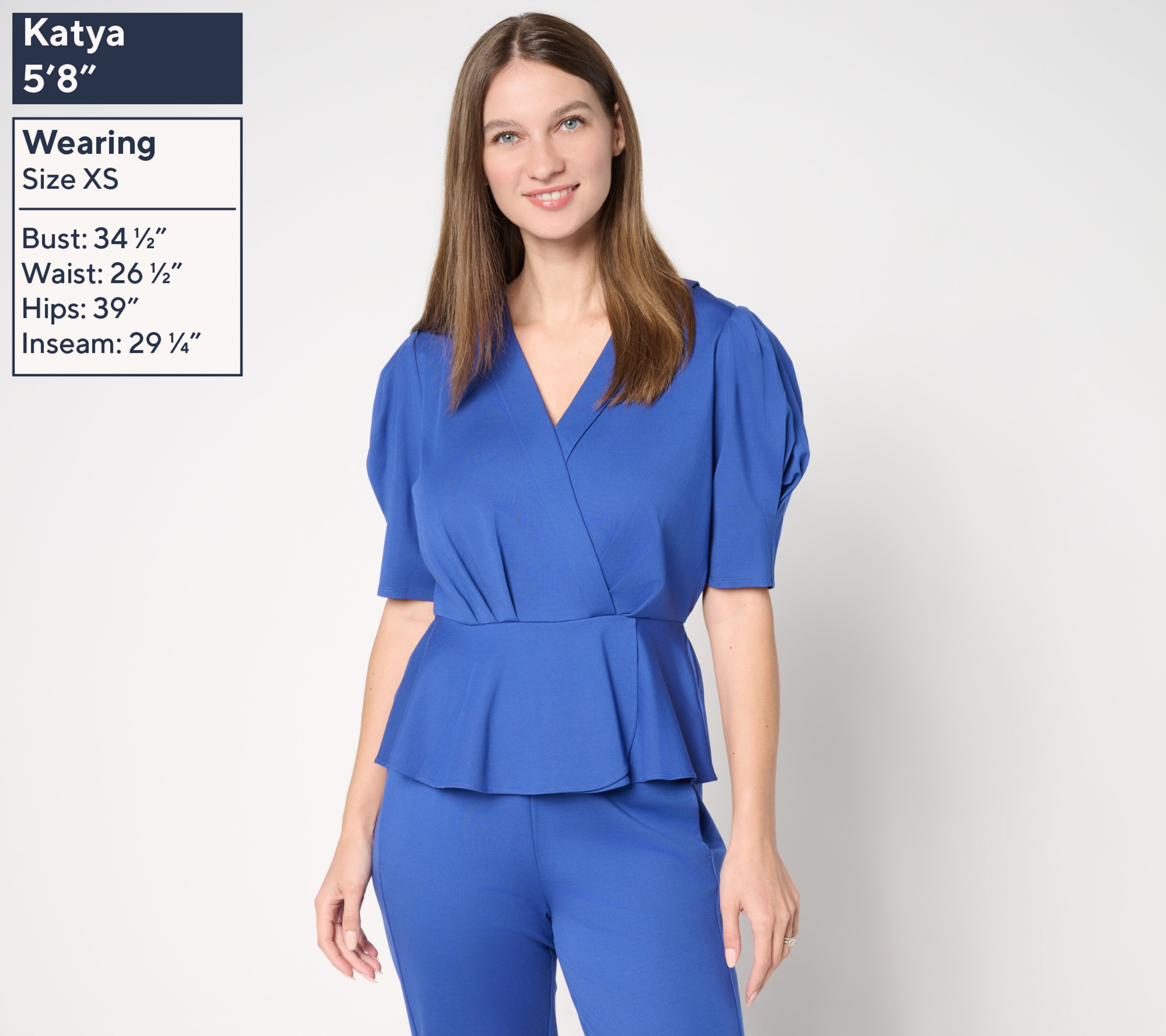 Features: faux-wrap front, pleating details, inverted pleat short sleeves, peplum waist, encased elastic at back seam