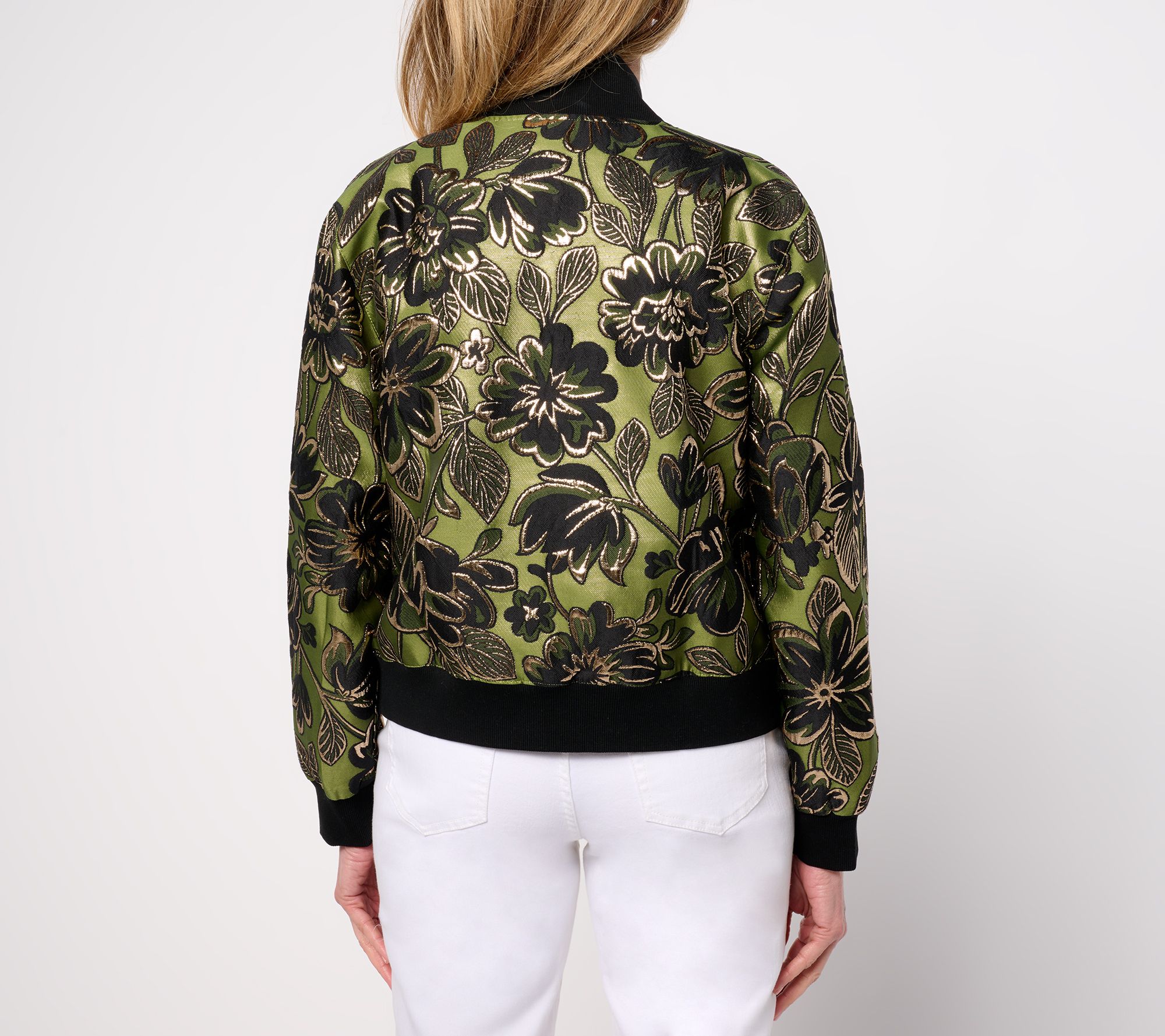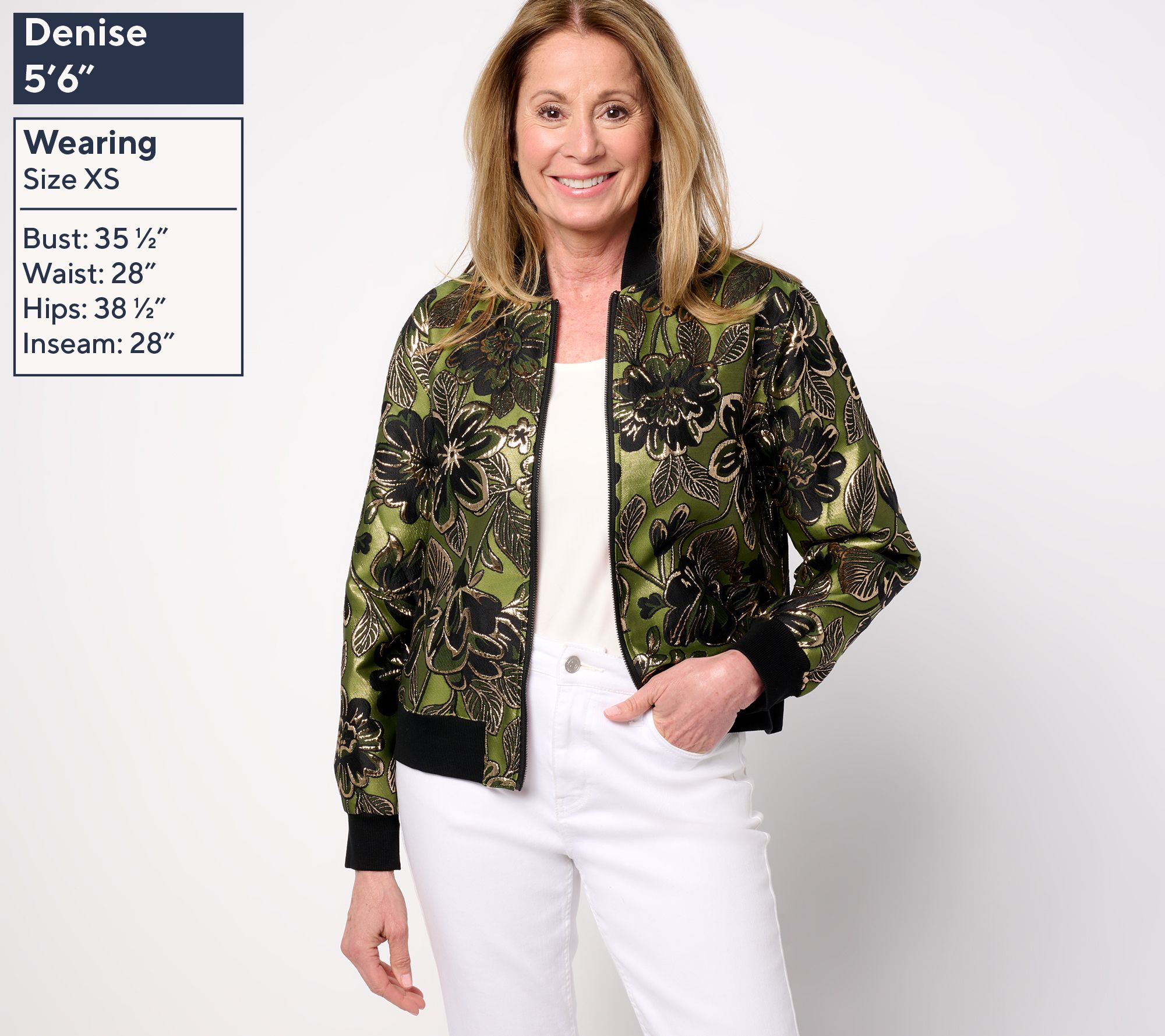 Caution: Heads will turn! This metallic floral brocade bomber jacket has major-impact status written all over it. Don it when drama is the mood of the moment. But on days when your vibe is more low-key, don't put this one in the closet. The jacket reverses to a solid option, so you can still carry that cool-girl chic in a more laid-back version. From by Stacy London.