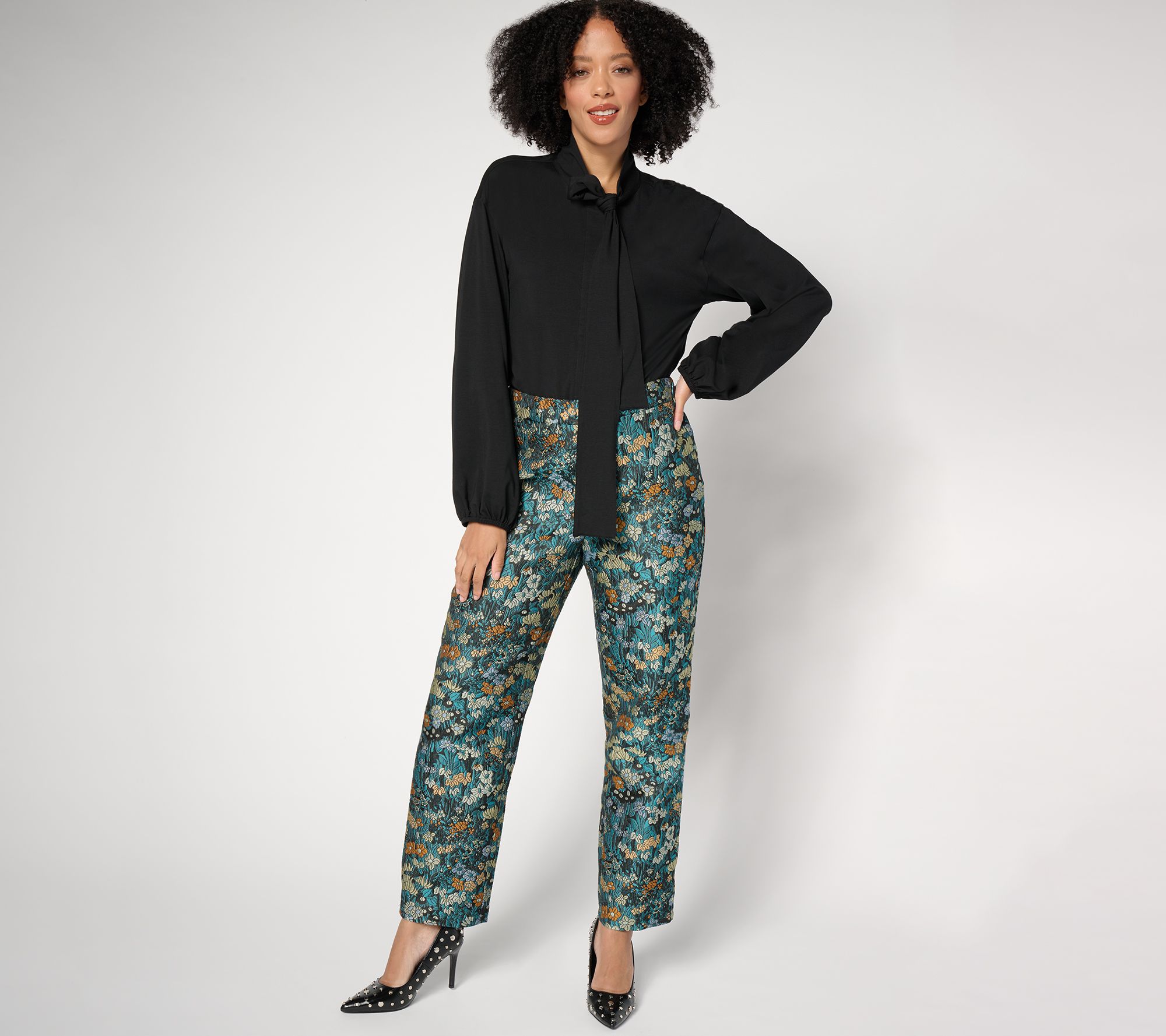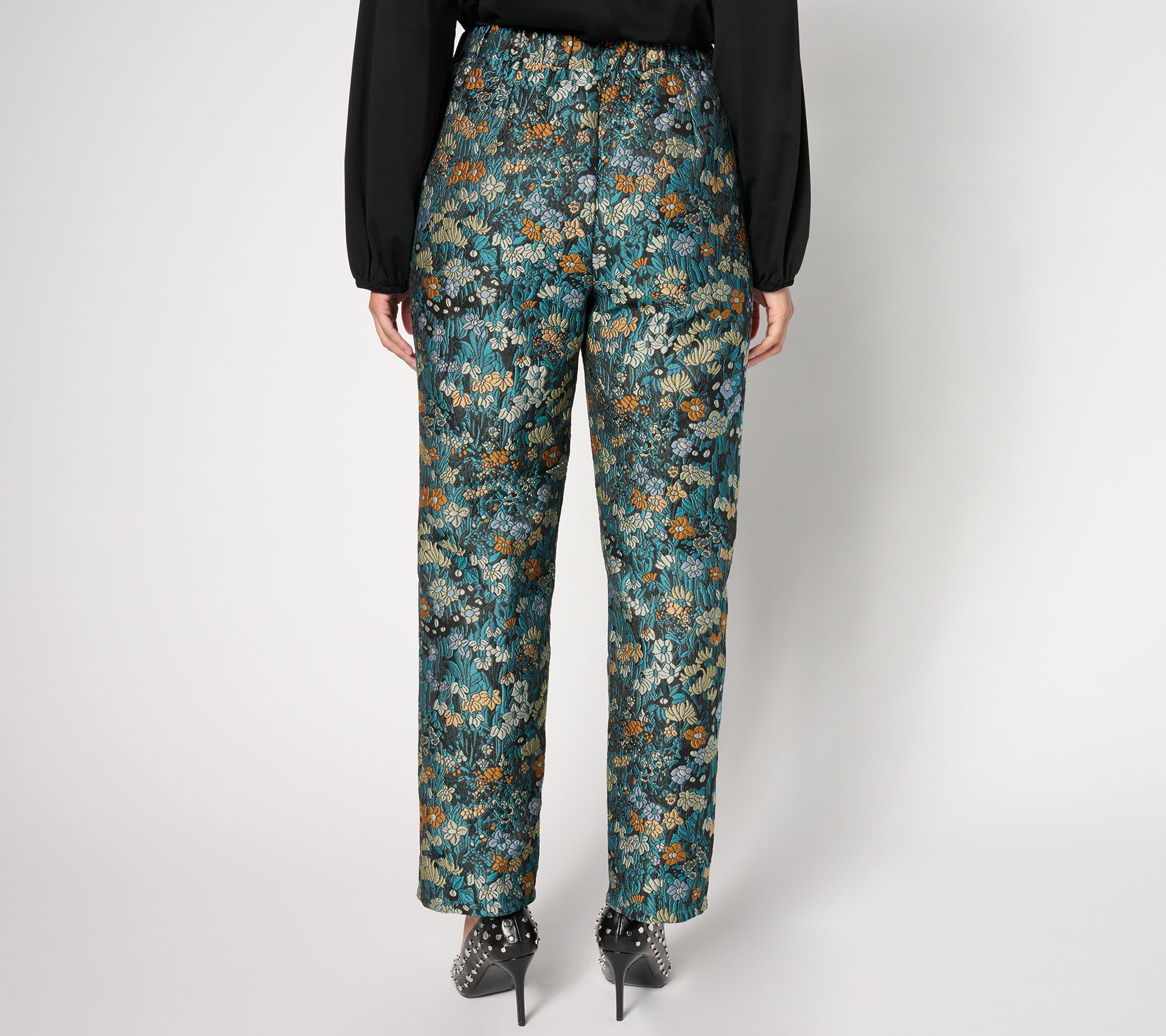 Elevate your wardrobe with these stunning floral brocade pants. A flat-front elasticated waistband and a side zipper make them easy to slip on. Pair them with anything from a blazer and blouse to a cardigan for a look you'll love. From by Stacy London.