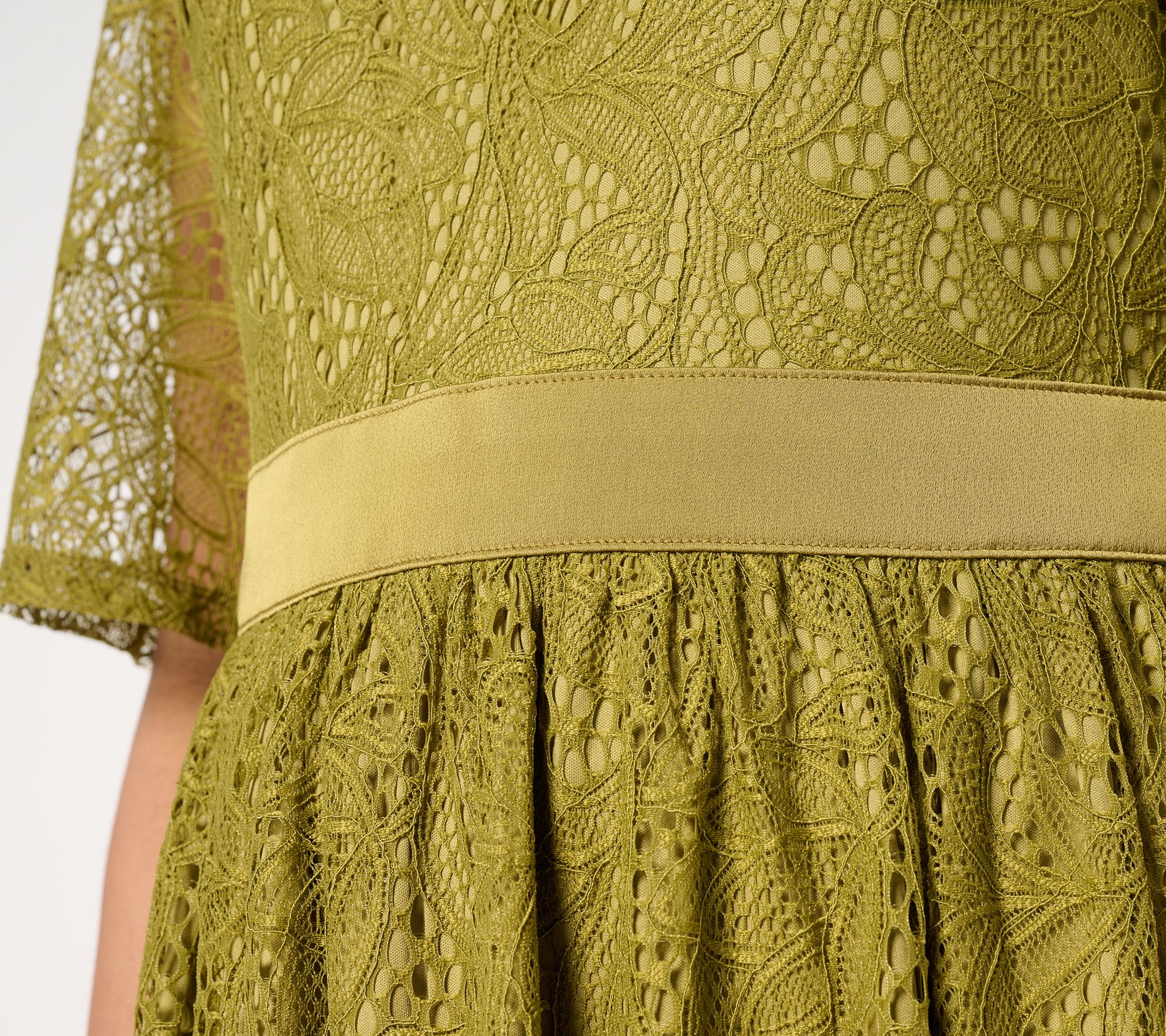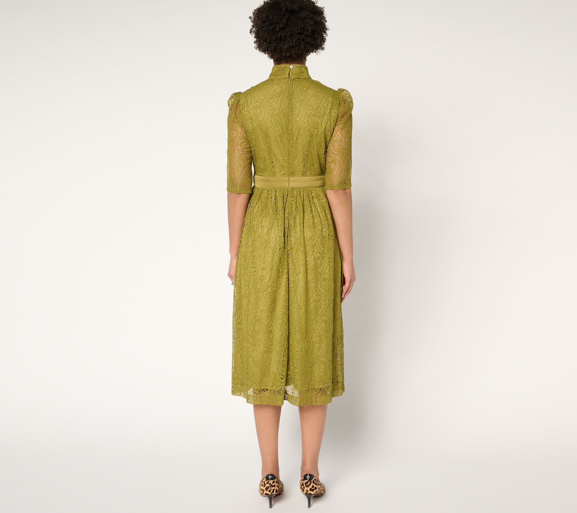 Whether you know everyone at the party or nary a soul, this stretch lace midi makes a confident, sophisticated entrance with a beautifully defined silhouette and coverage-providing neckline (no necklace required!). And when you're ready to take to the dance floor? The comfortably lined bodice and softly draped skirt flatter your every move. From by Stacy London.
