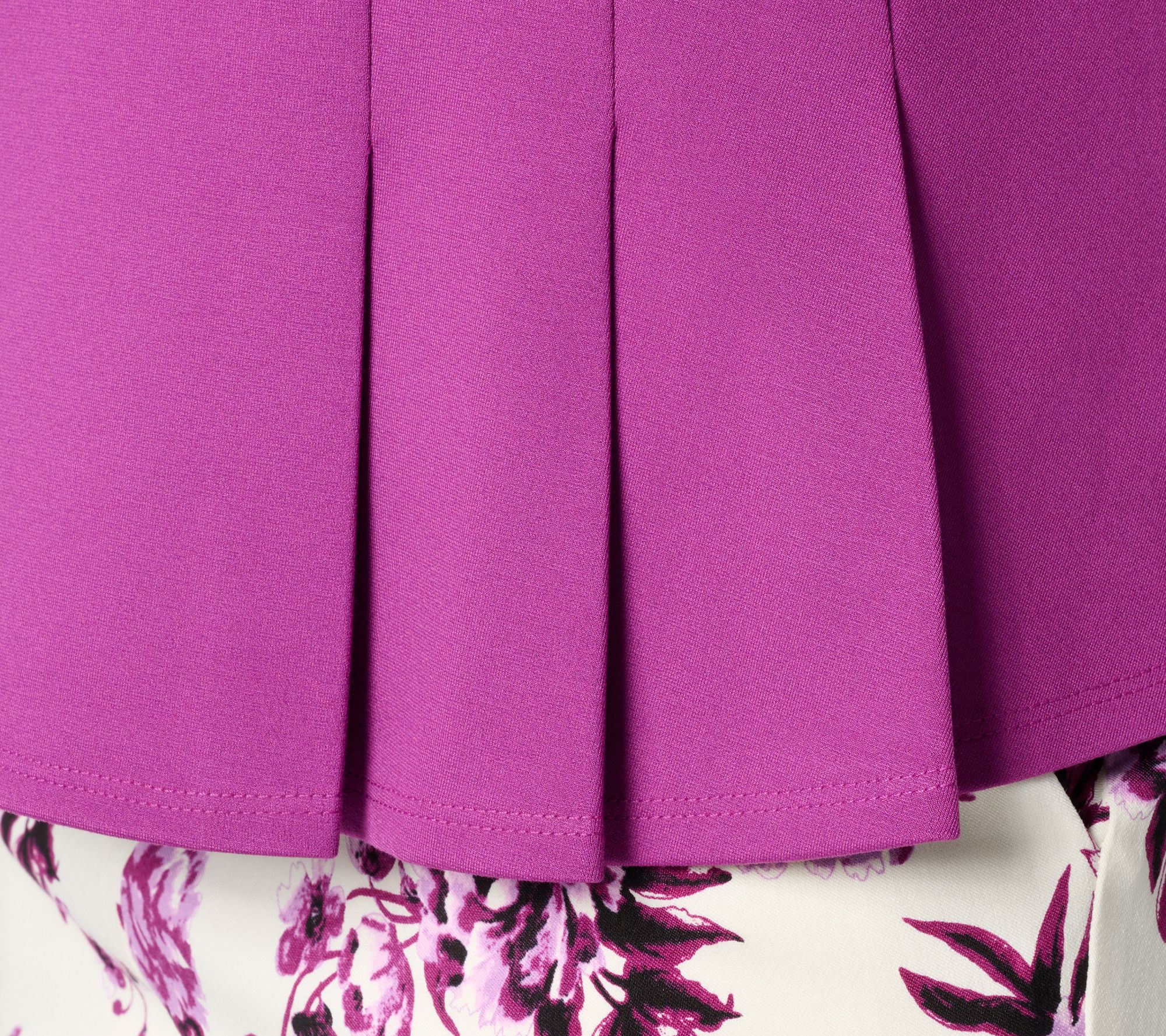 Features: sleeveless, pleated shoulder detail, peplum hem, darts for shaping, turnback hem, self-lined front