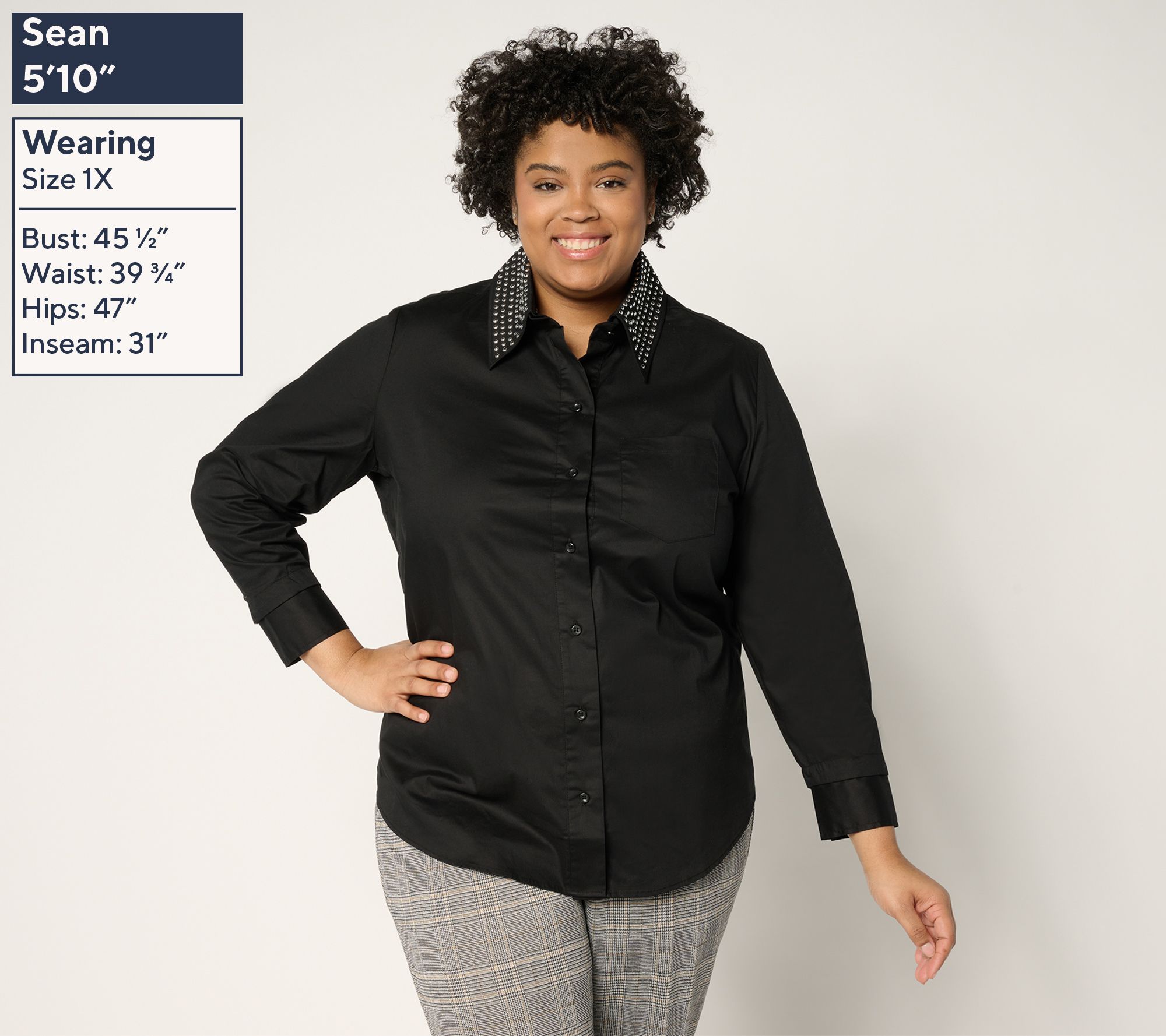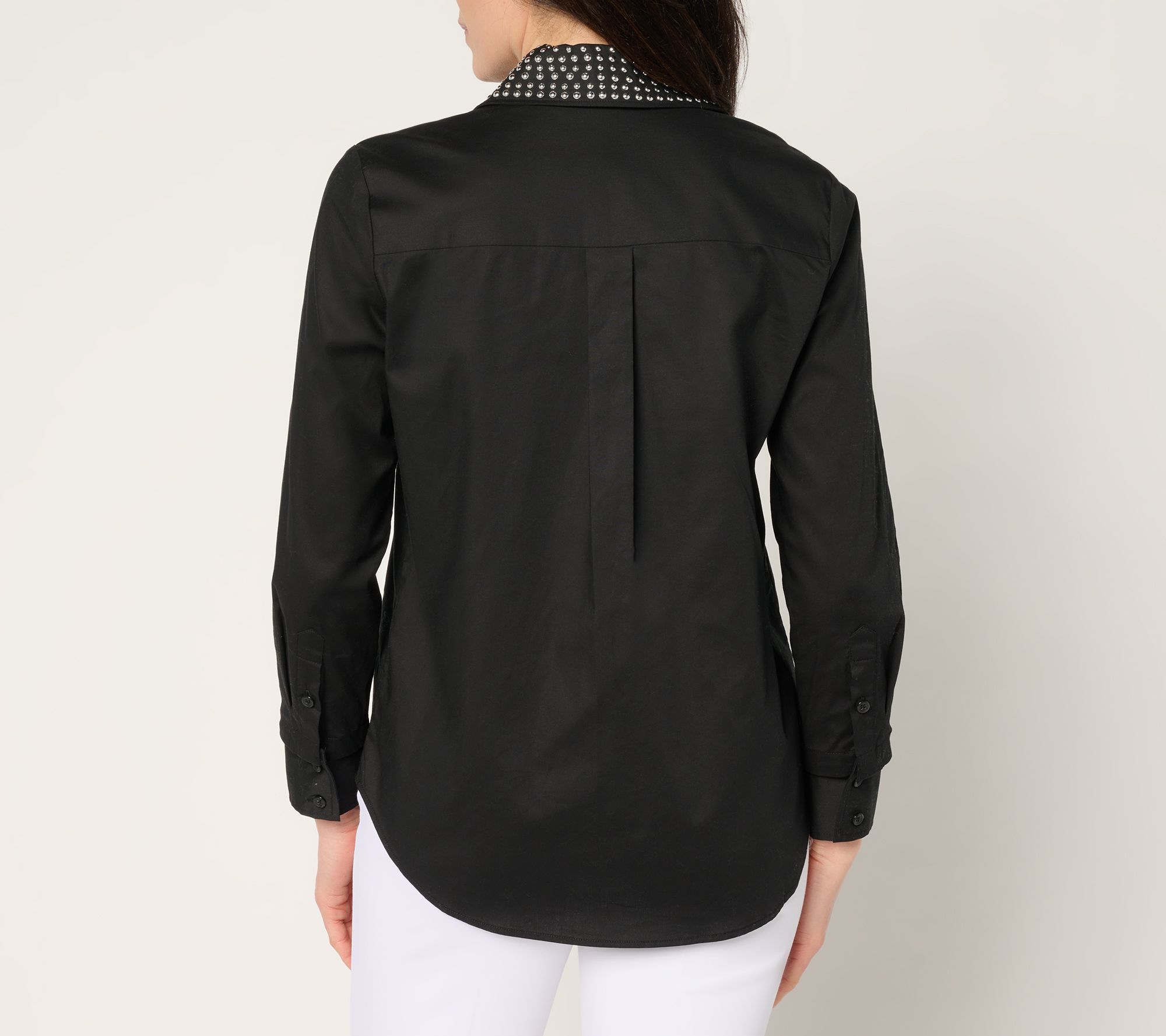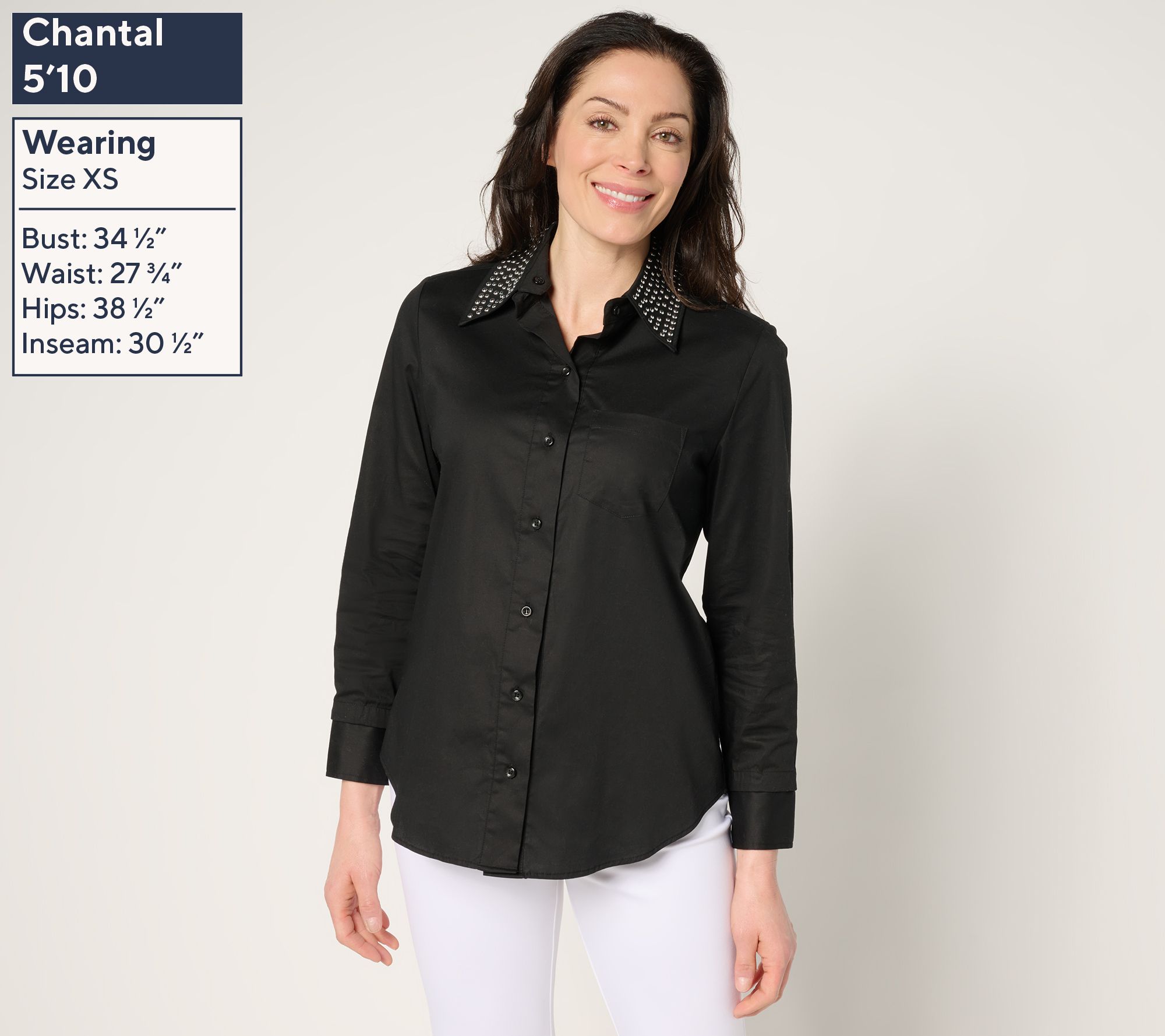 If you love a timeless, put-together style, this poplin foundation shirt deserves a spot in your wardrobe. Its classic style and easy fit make it versatile enough for both office hours and weekend outings. And if you love to personalize your 'fits, simply add a Stacy London addable (not included) to the collar; it's built for it! So effortlessly chic. From by Stacy London.