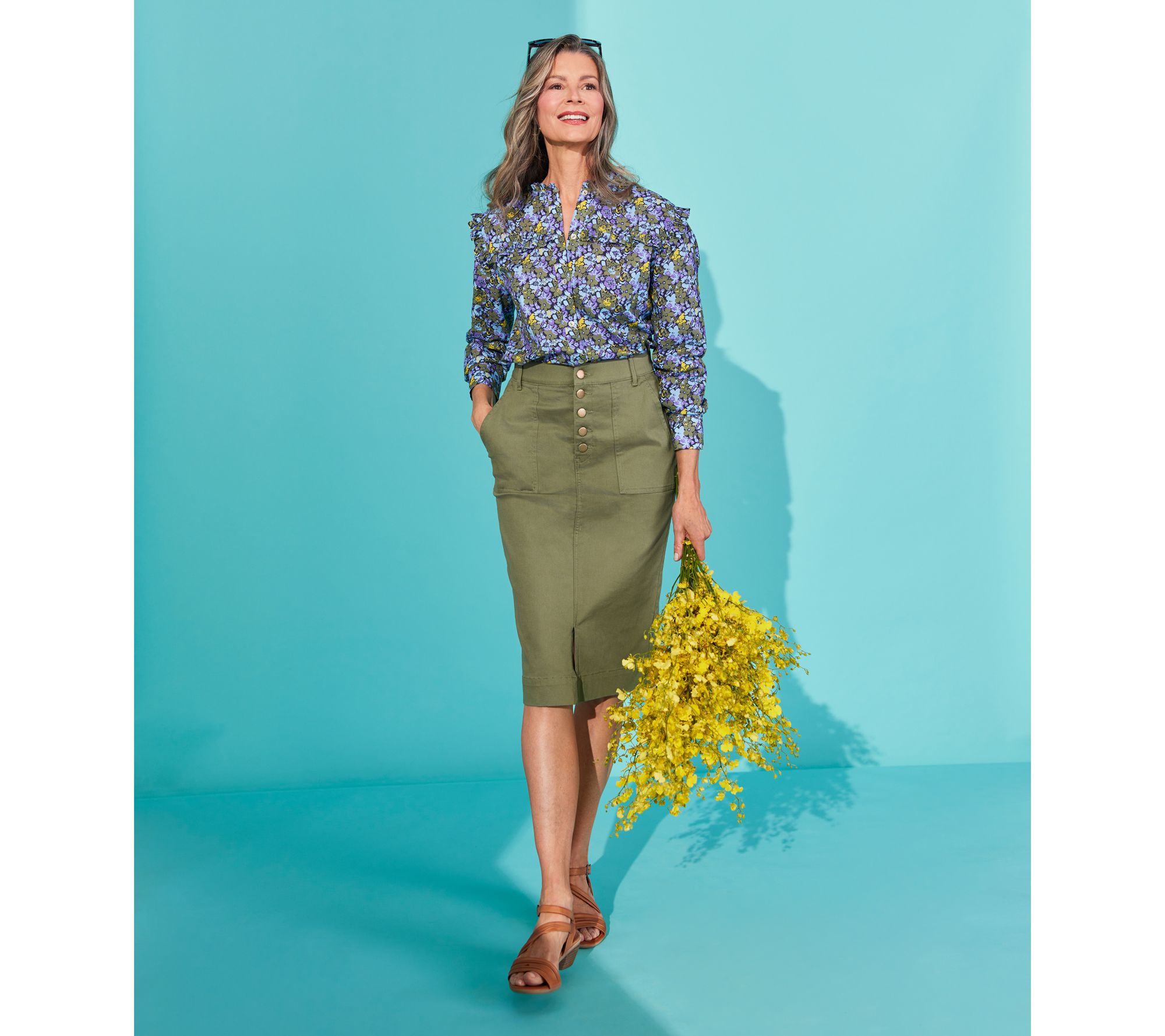 One top, endless opportunities. Ruffle details and a lively print make this long-sleeve shirt a lovely feminine fashion statement, no matter how you wear it. Tuck it into a tailored skirt for the office, pair it with jeans and sneaks for casual weekend outings, or top off twill crops and cute sandals for brunch with the gals. From by Stacy London.