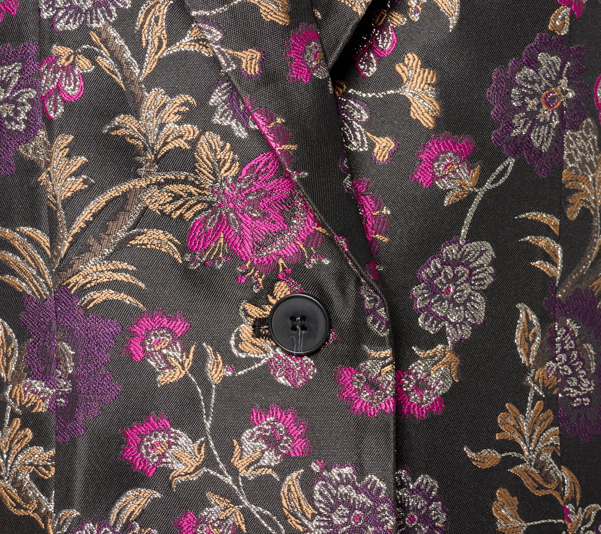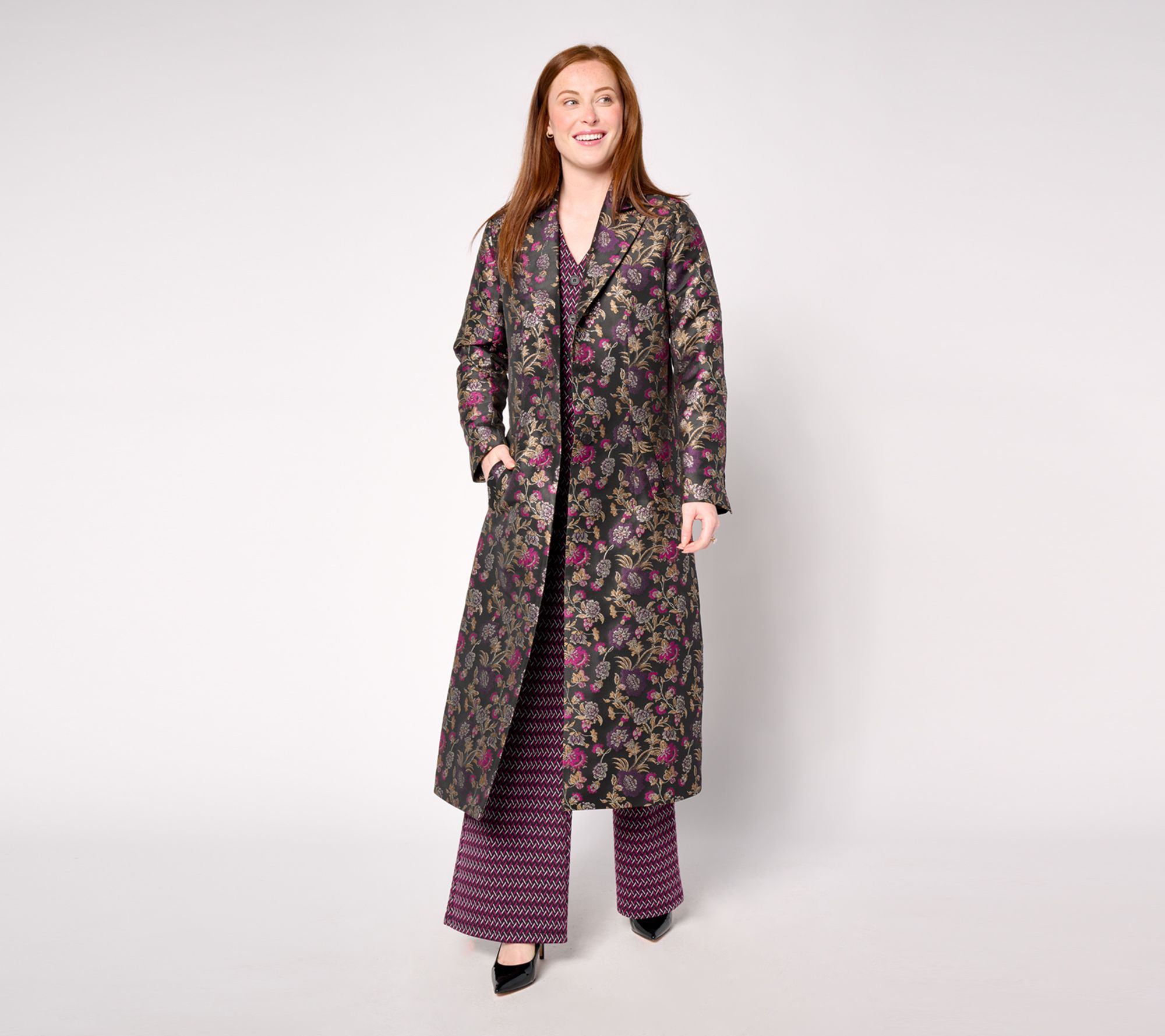 The weather may be cool enough to call for added coverage, but you don't have to forego the springtime feels! Stacy London takes the classic topcoat and gives it feminine flair with a floral brocade. The fully lined layer features a notch collar and lapel, front darts, and functional welt pockets for a sophisticated style. From by Stacy London.