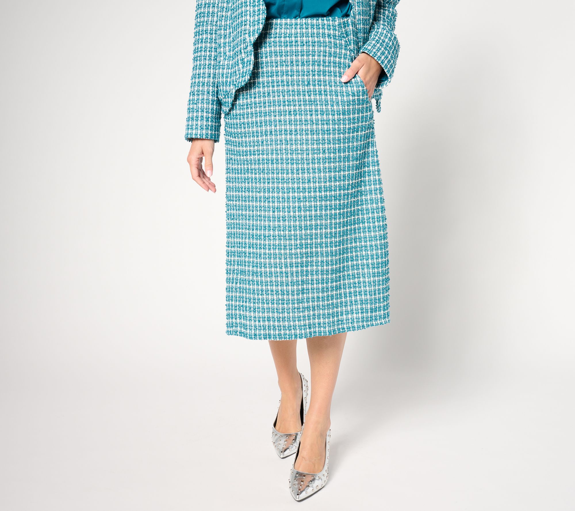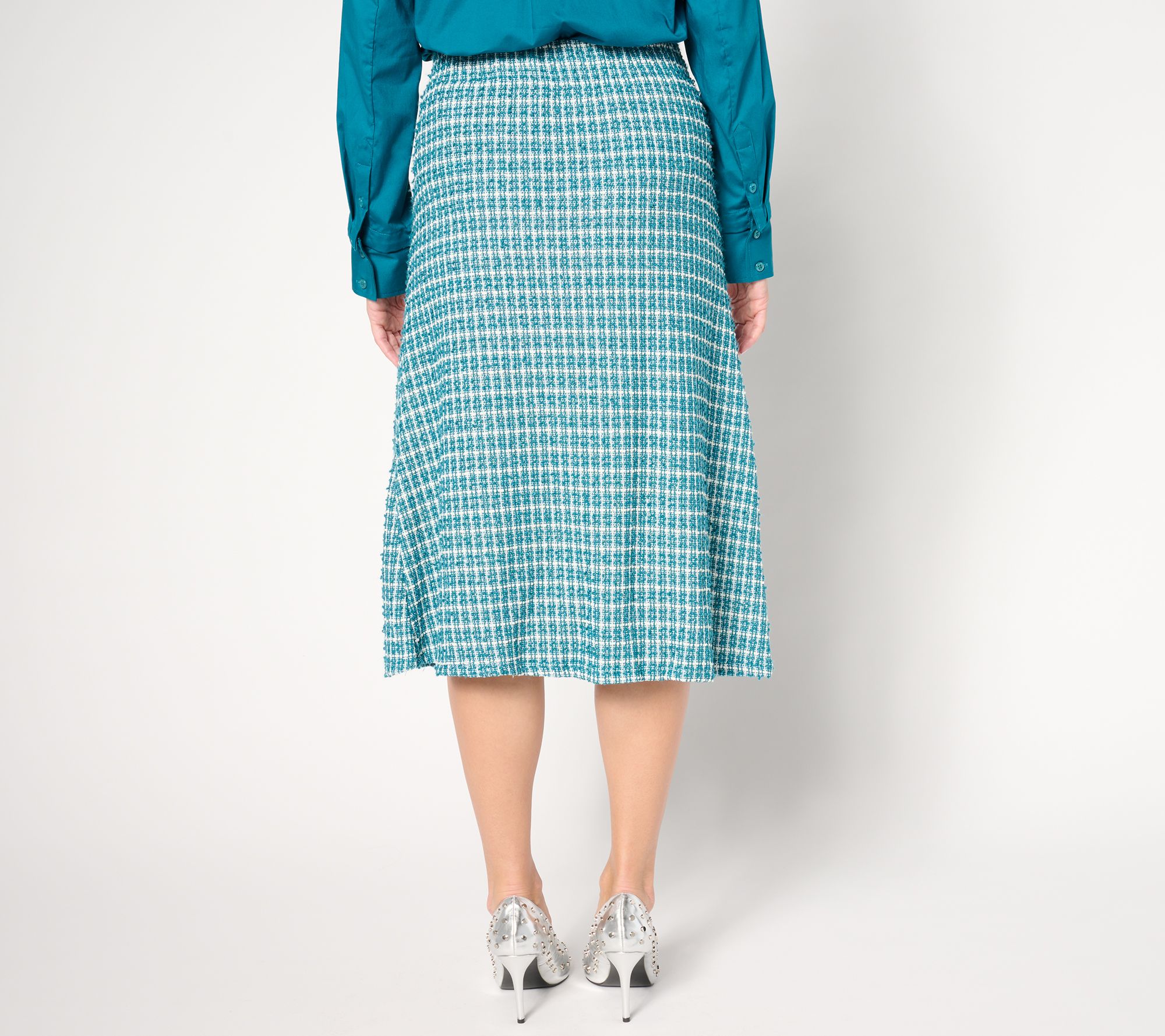 Heading into the office? This knit boucle skirt makes a smart start to your workday outfit, with a classic A-Line design that flatters any figure and an elasticized flat front waistband for all-day comfort -- from morning meetings to afternoon presentations. Pair it with your favorite confidence-building pumps and you'll be ready to tackle the day in chic style. From by Stacy London.