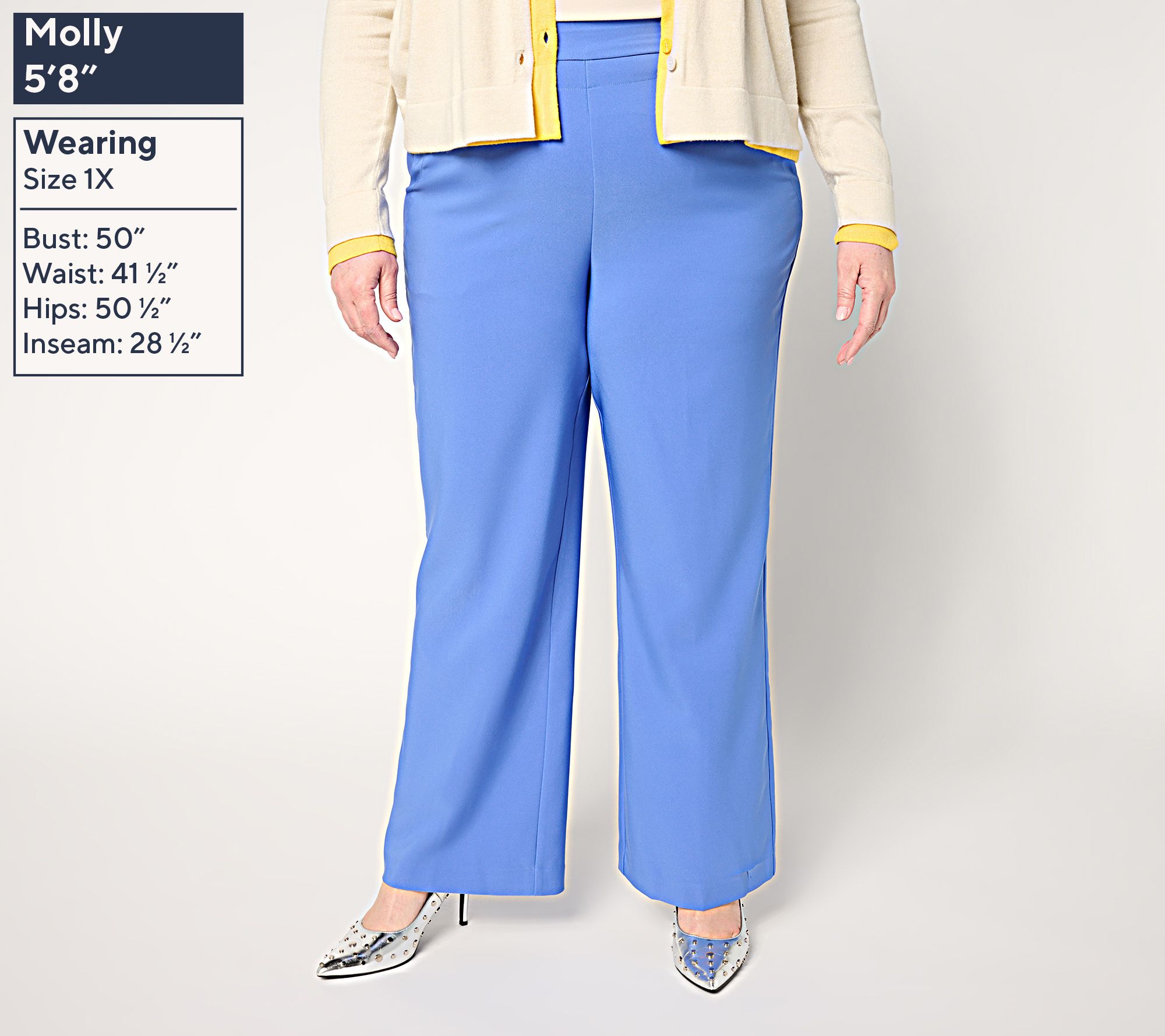 Feel confident and comfortable in these versatile wide-leg pull-on crepe pants. Perfect for a day at the office or a night out, these pants feature a flat front with an elasticated waistband and side pockets for added convenience. From Stacy London.