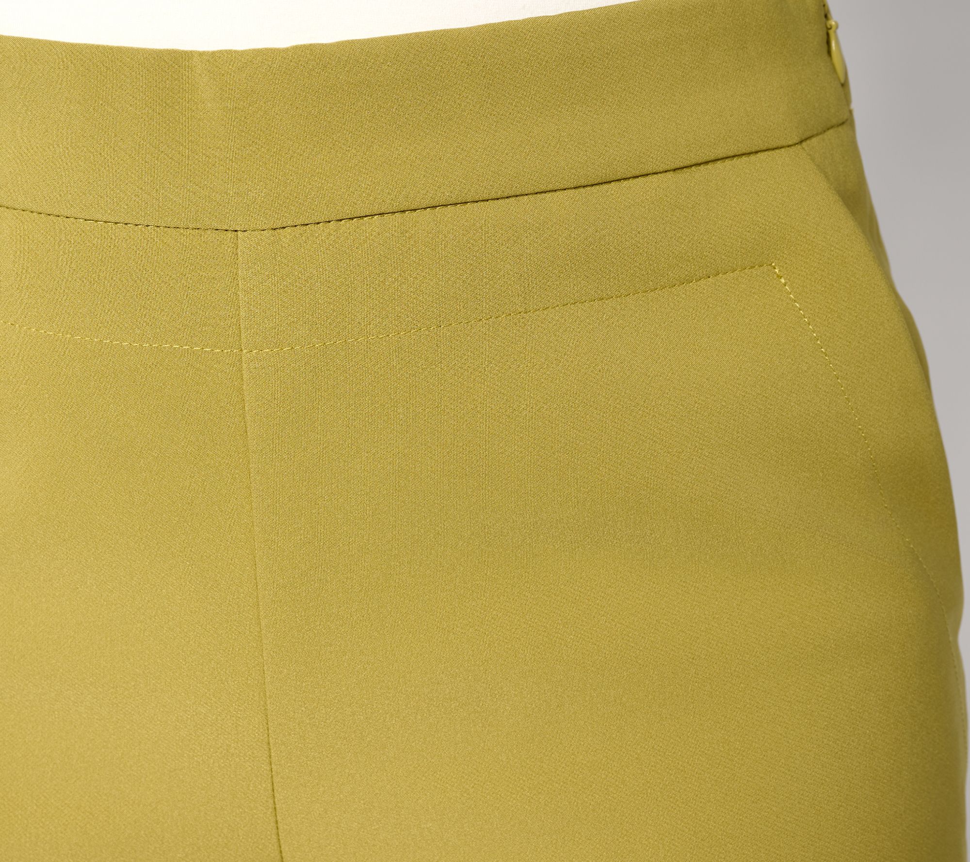 Features: flat front, elasticated waistband with gathering at the back, side pockets, single-needle top stitch detail, back darts, invisible side zipper, blind hem