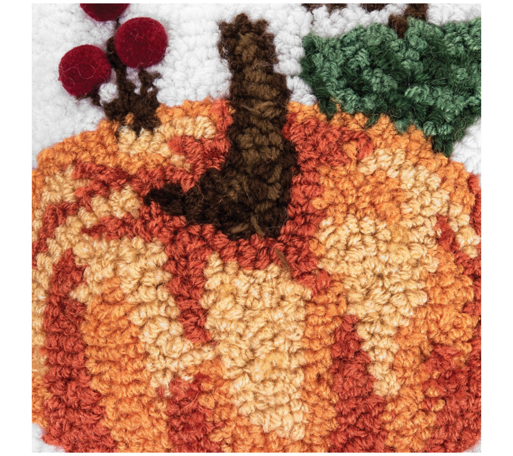 Fresh picked from the coziest of patches, this fun hooked pillow features a plump pumpkin and festive fall colors. From C&F Home.