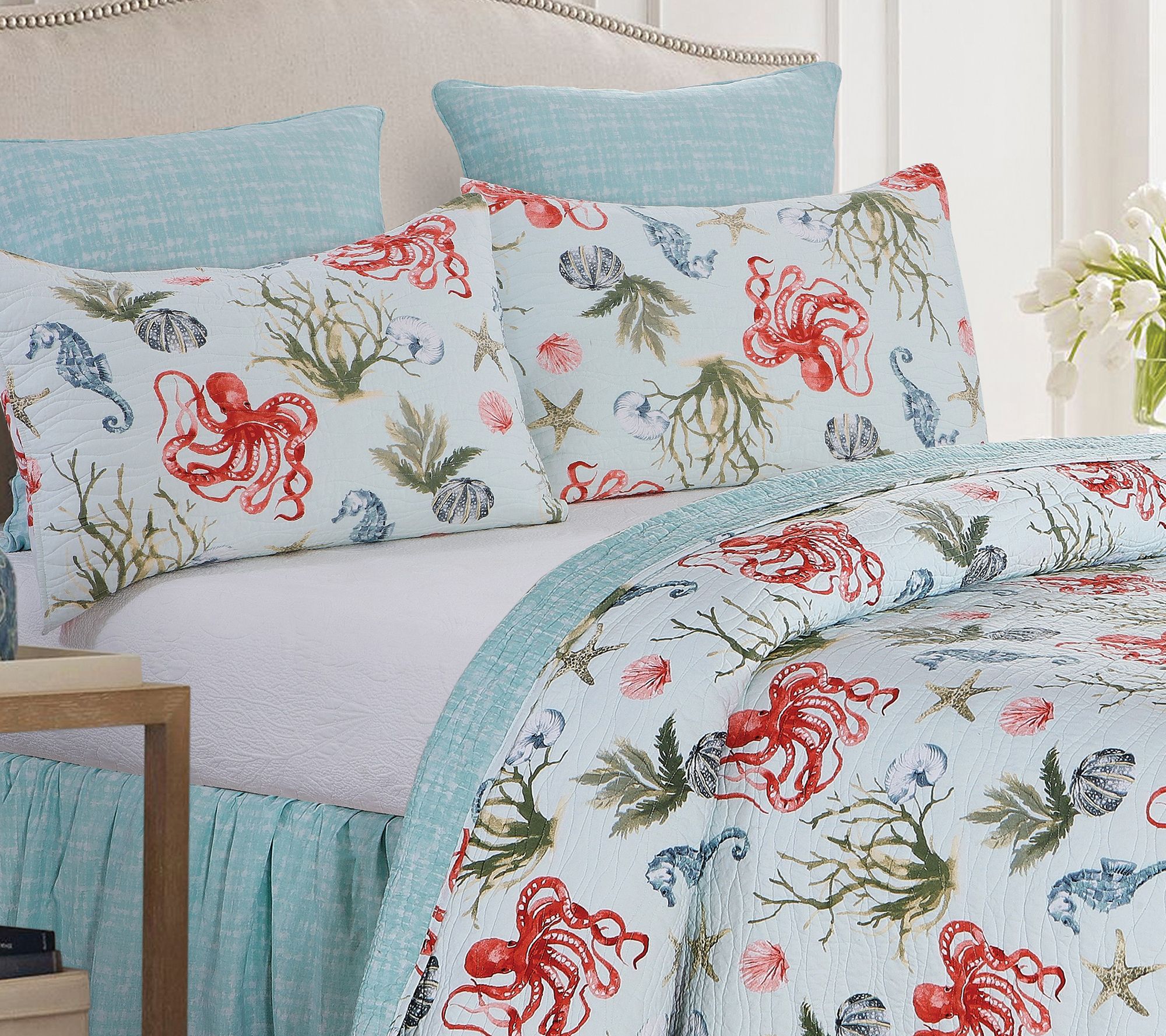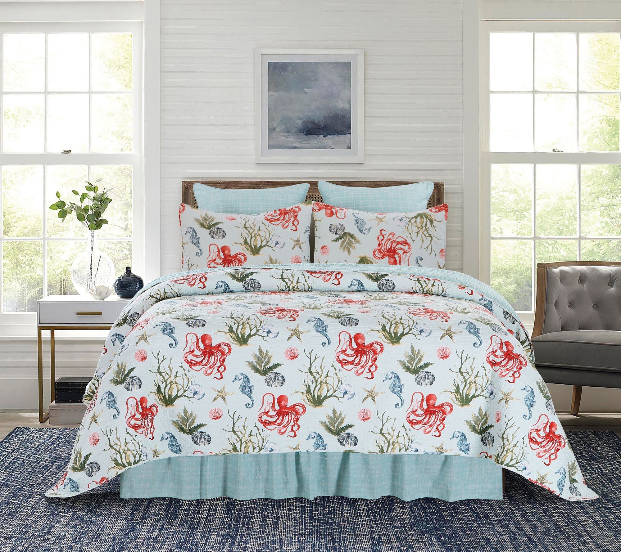Colorful, yet sophisticated, this Behari quilt set turns any bedroom into a seaside retreat. Boasting a pattern of hand-drawn sea life, it adds oceanic charm to your space. It's finished with soft wave stitching and reverses to an abstract pattern for versatile styling options. From C&F Home.