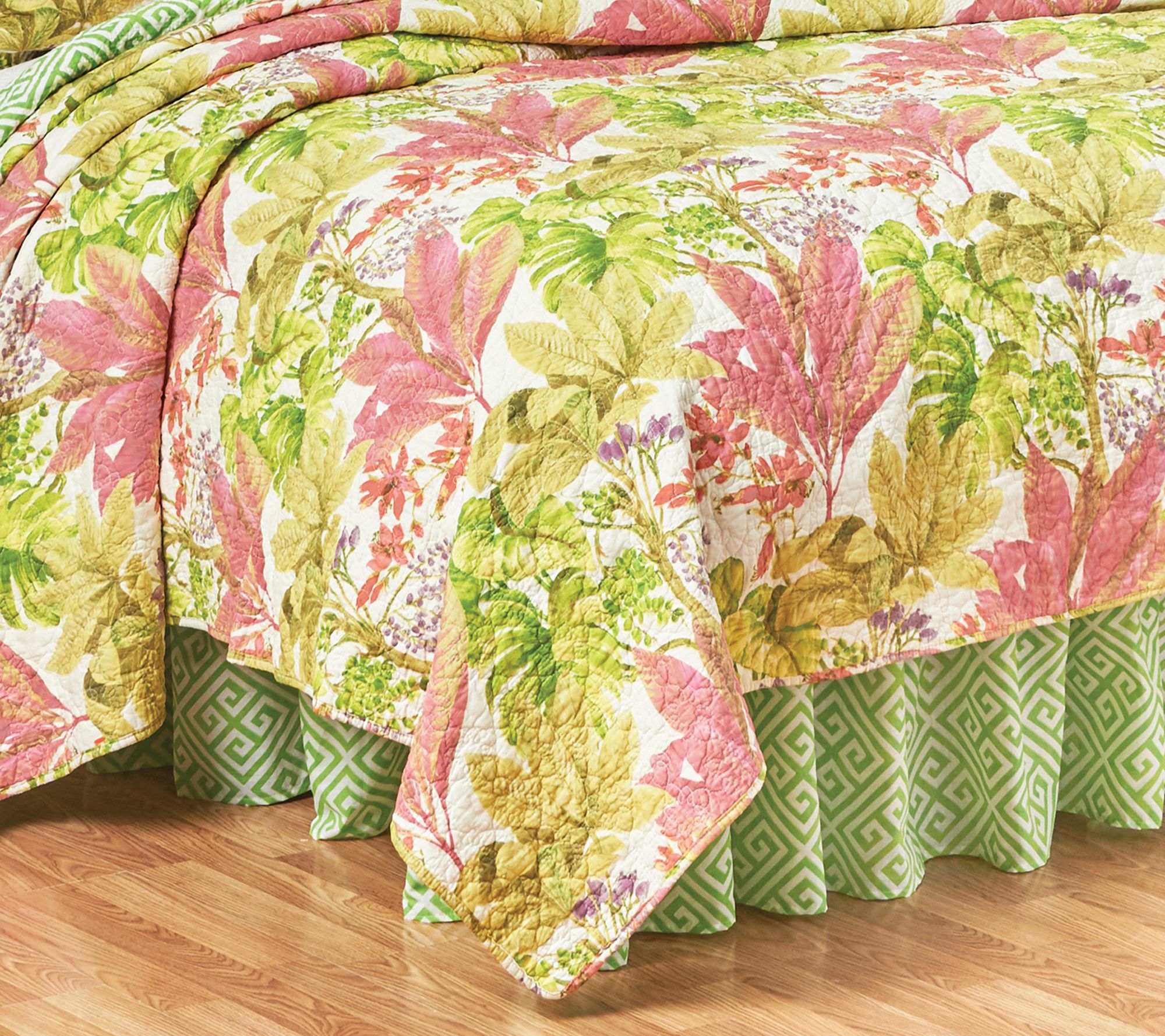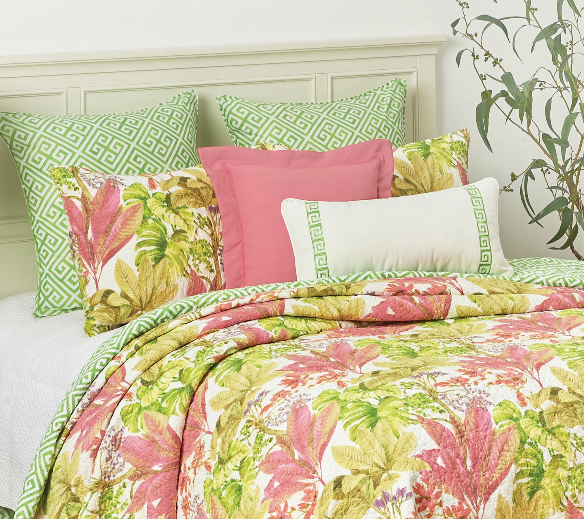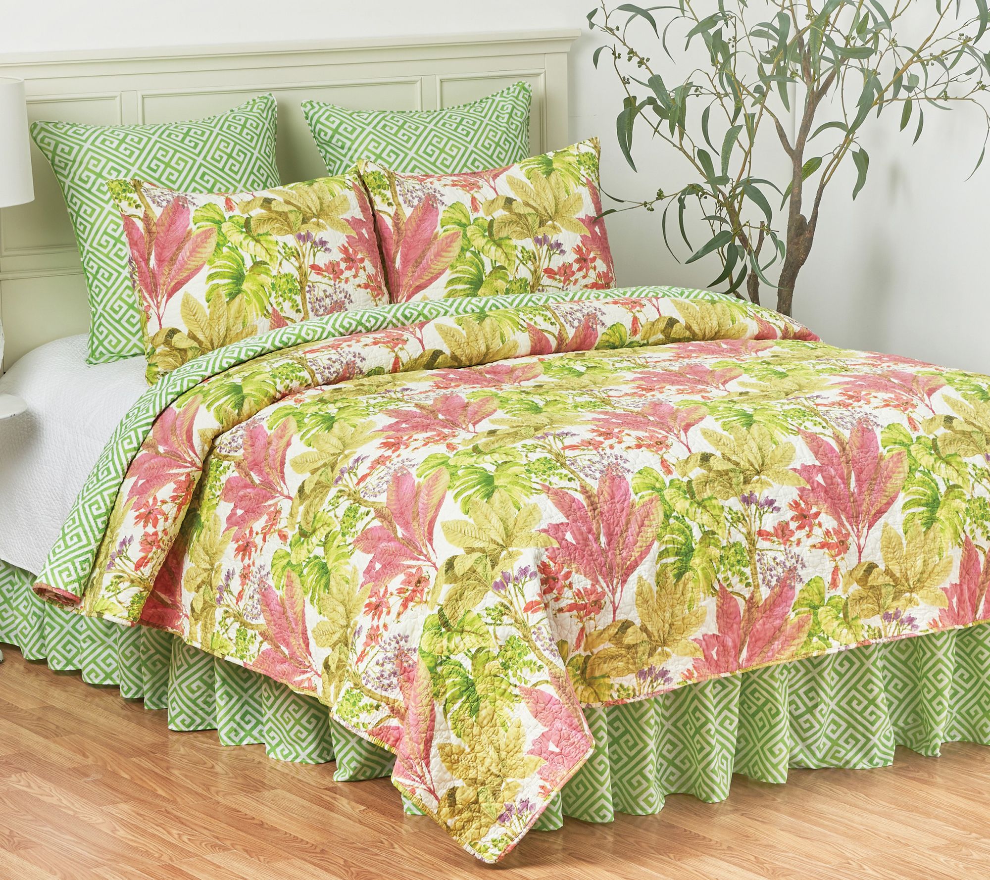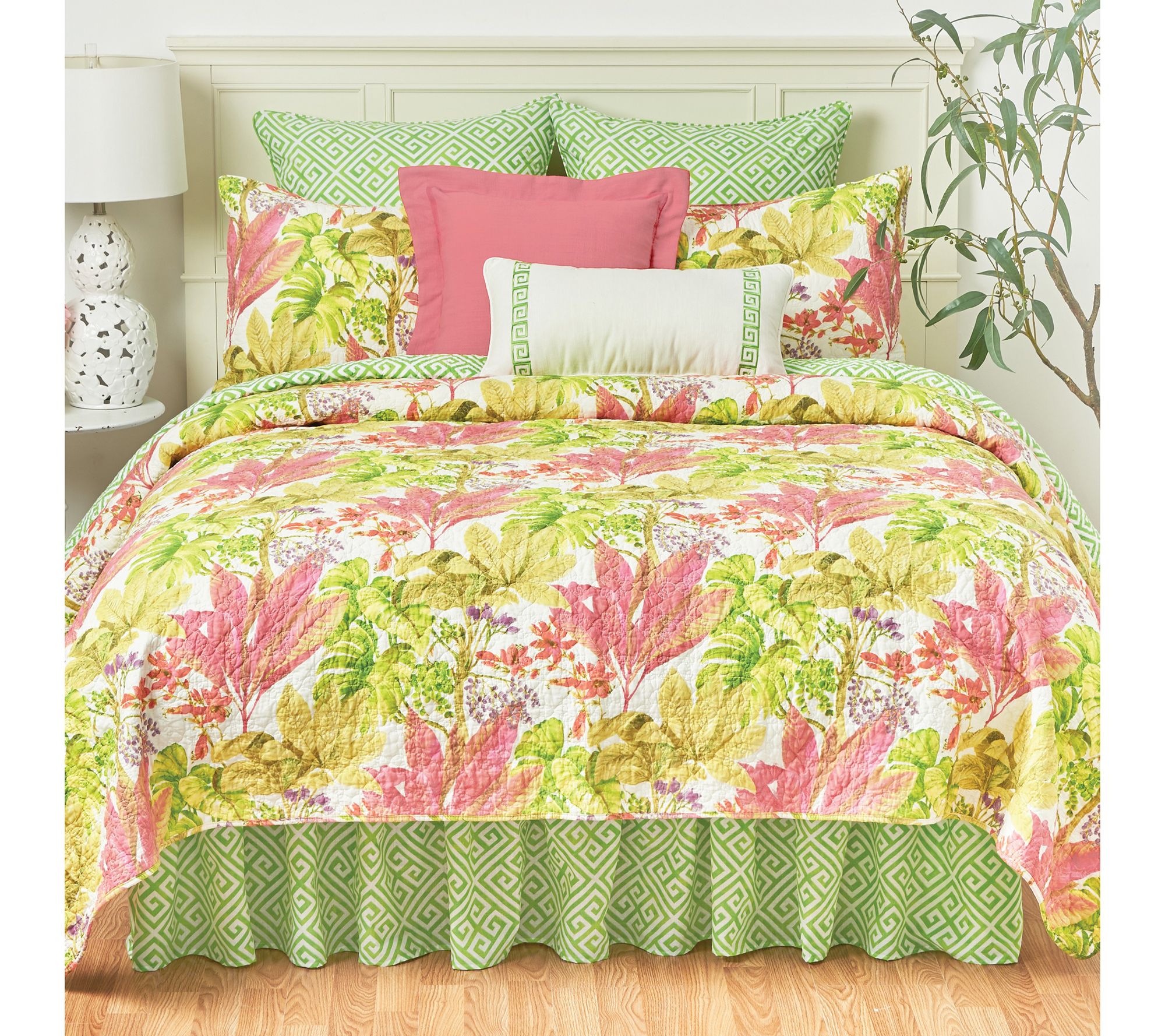 Enliven the look of any bedroom with this Moana quilt set. Boasting a floral pattern of pinks, greens, and purples, it invites bright charm into your space. It's finished with floral medallion stitching and reverses to a Greek key pattern for versatile styling options. From C&F Home.