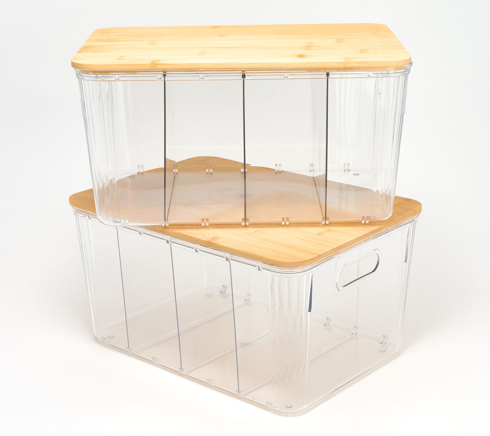 Clear the clutter with this set of covered baskets. Perfect for home organization, each has three removable dividers and is made of translucent plastic so you can easily view its contents. From CellaTM.