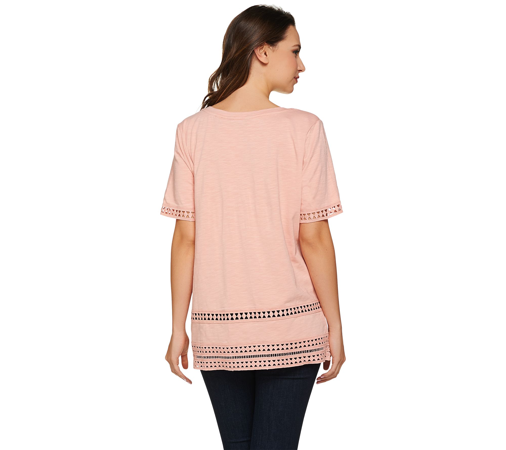 C. Wonder's collection has a way of creating styles that reflect your personality. Like you, this knit V-neck is both fashionable and fun--and its lace detail along the hemline and short sleeves really stand out! Is it any wonder you're loving your new wardrobe? From C. Wonder.