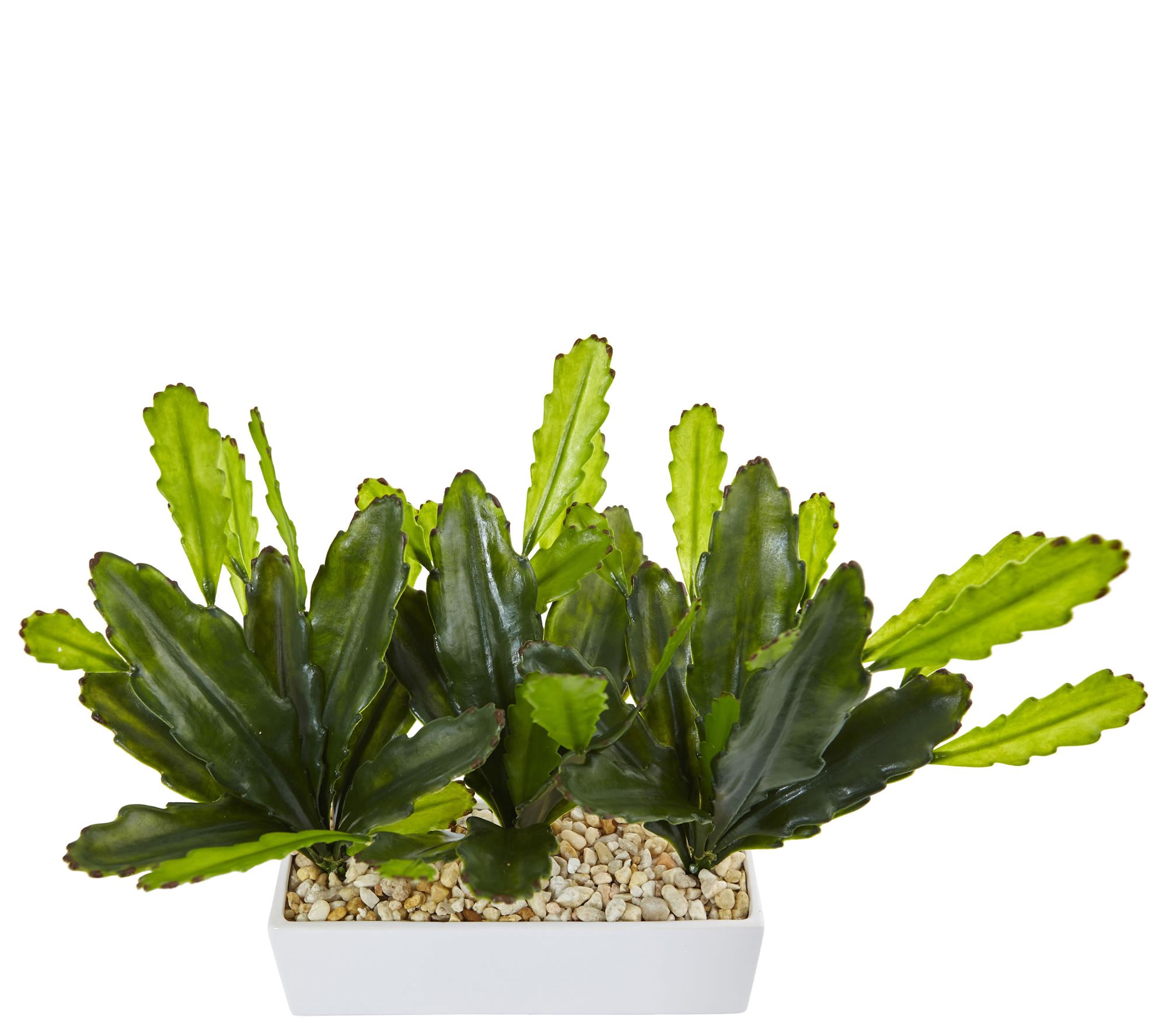 • Three lifelike cactus plants sprout from white planter with river rock filler