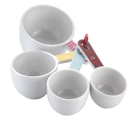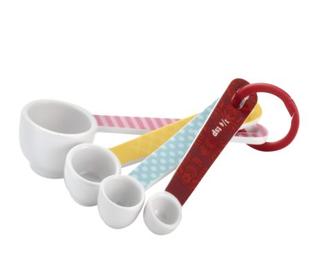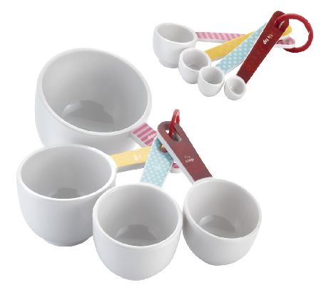 Measured success. Prepare the right portions when mixing and baking with this sturdy, retro-inspired set of melamine measuring cups and spoons. Including a full array of tools for portioning everything from cake flour to milk, each cup and spoon features a different design to make it easier to spot while you work. From Cake Boss.