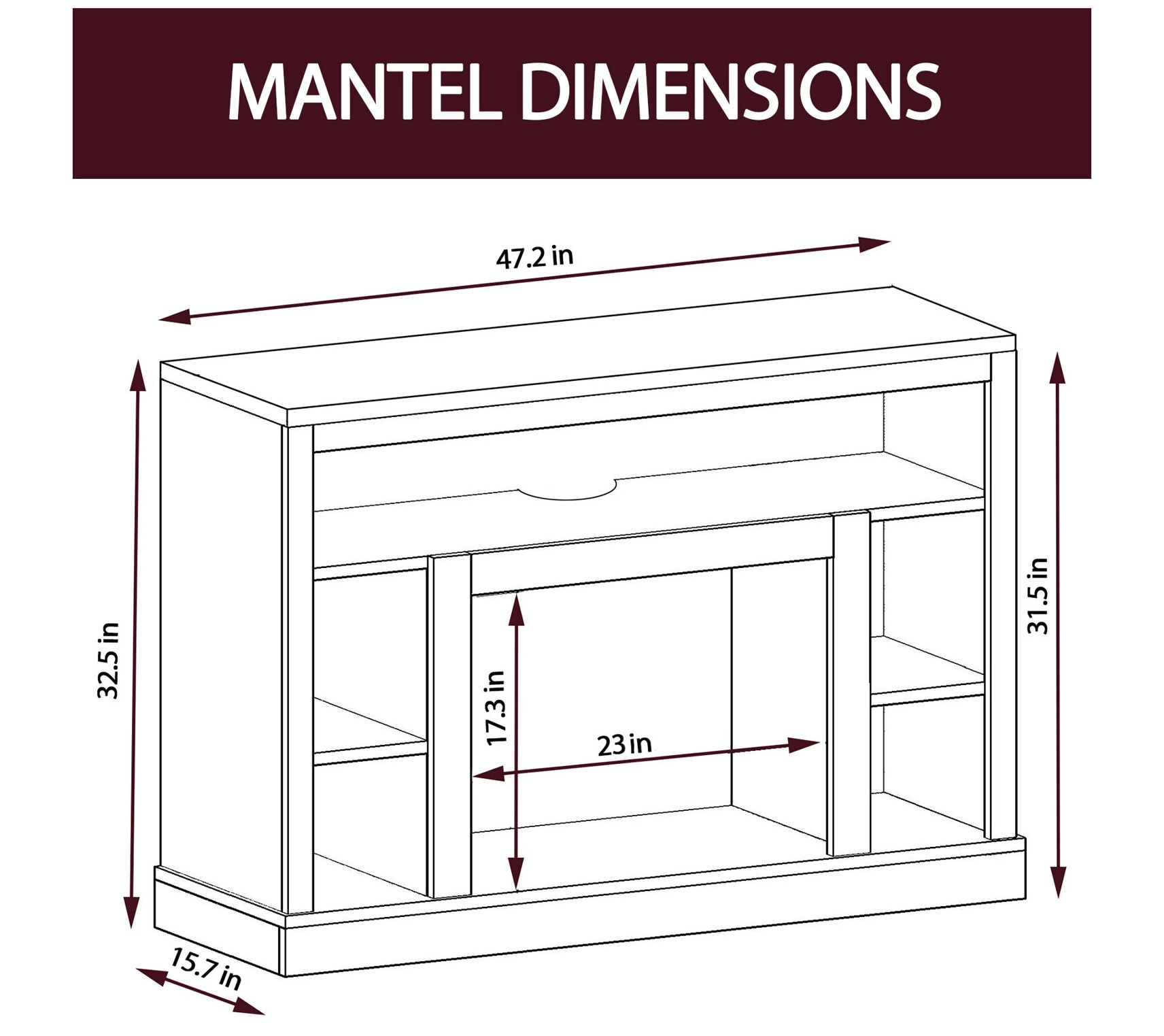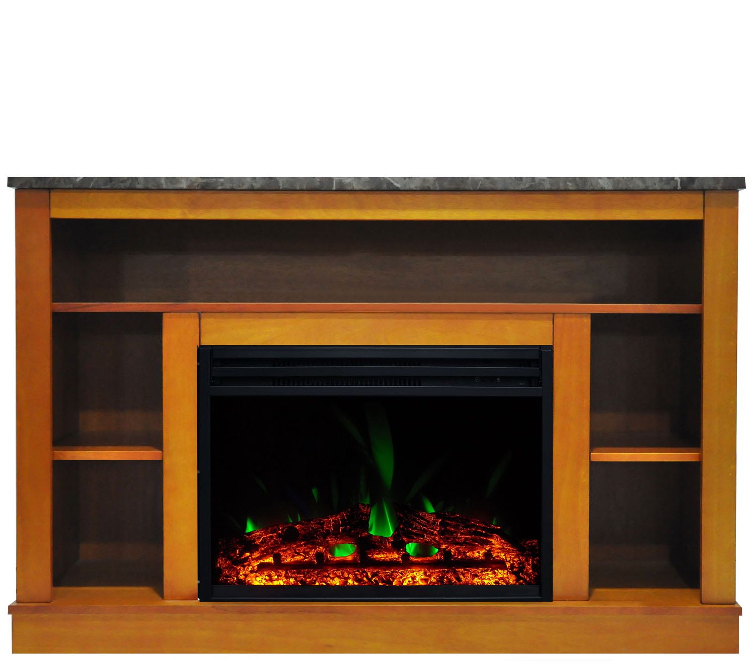 • Four storage shelves, wide A/V shelf, faux-marble 47" mantel