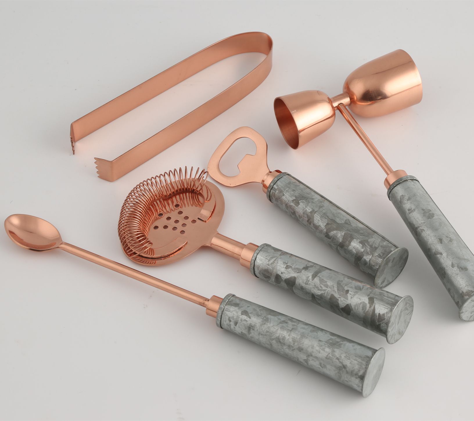 • Includes bottle opener, ice tongs, jigger, bar spoon, and springed strainer