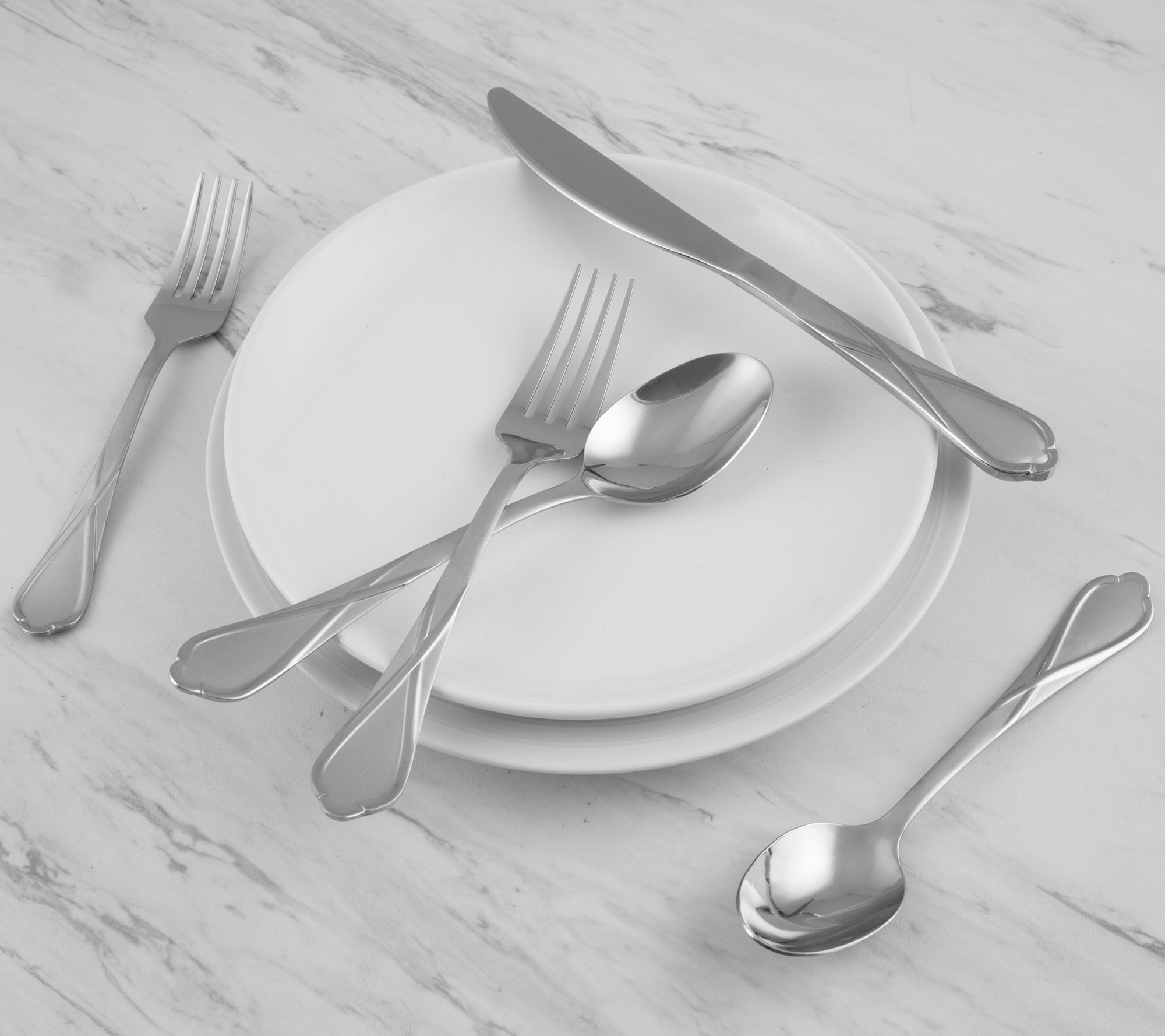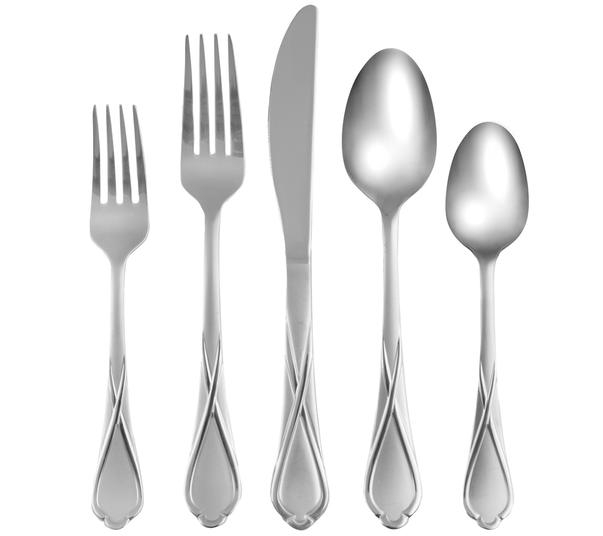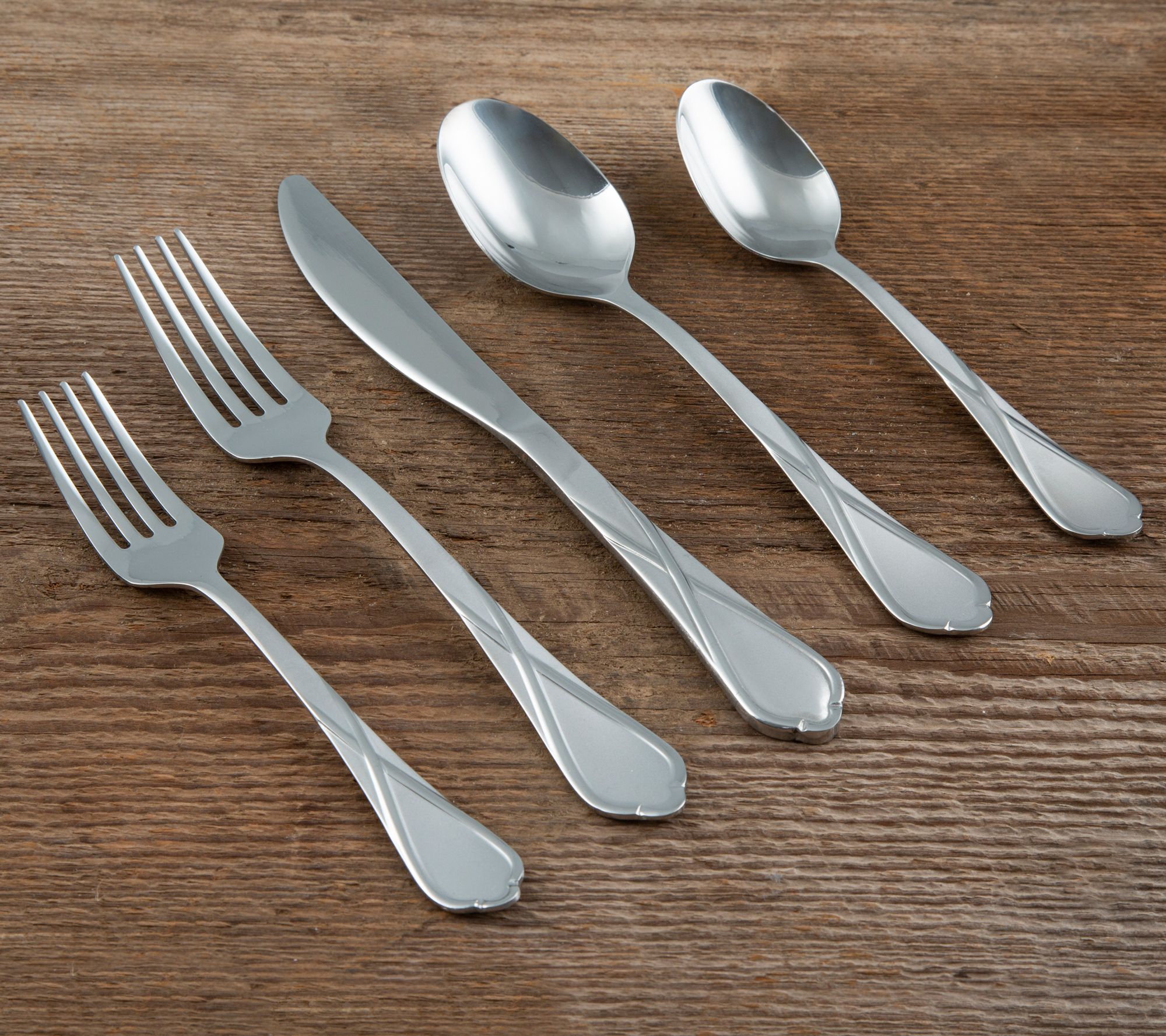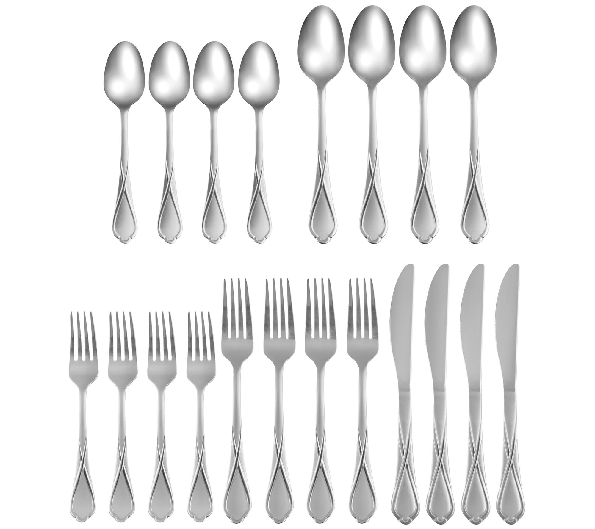 • 20-pc set includes four of each: salad forks, dinner forks, dinner knives, dinner spoons, and teaspoons