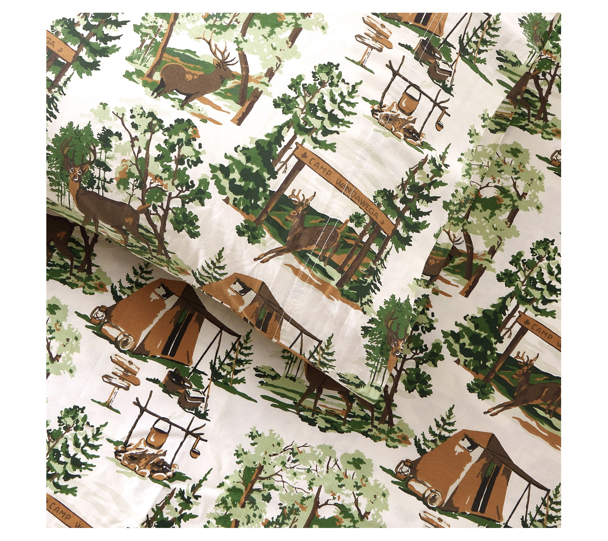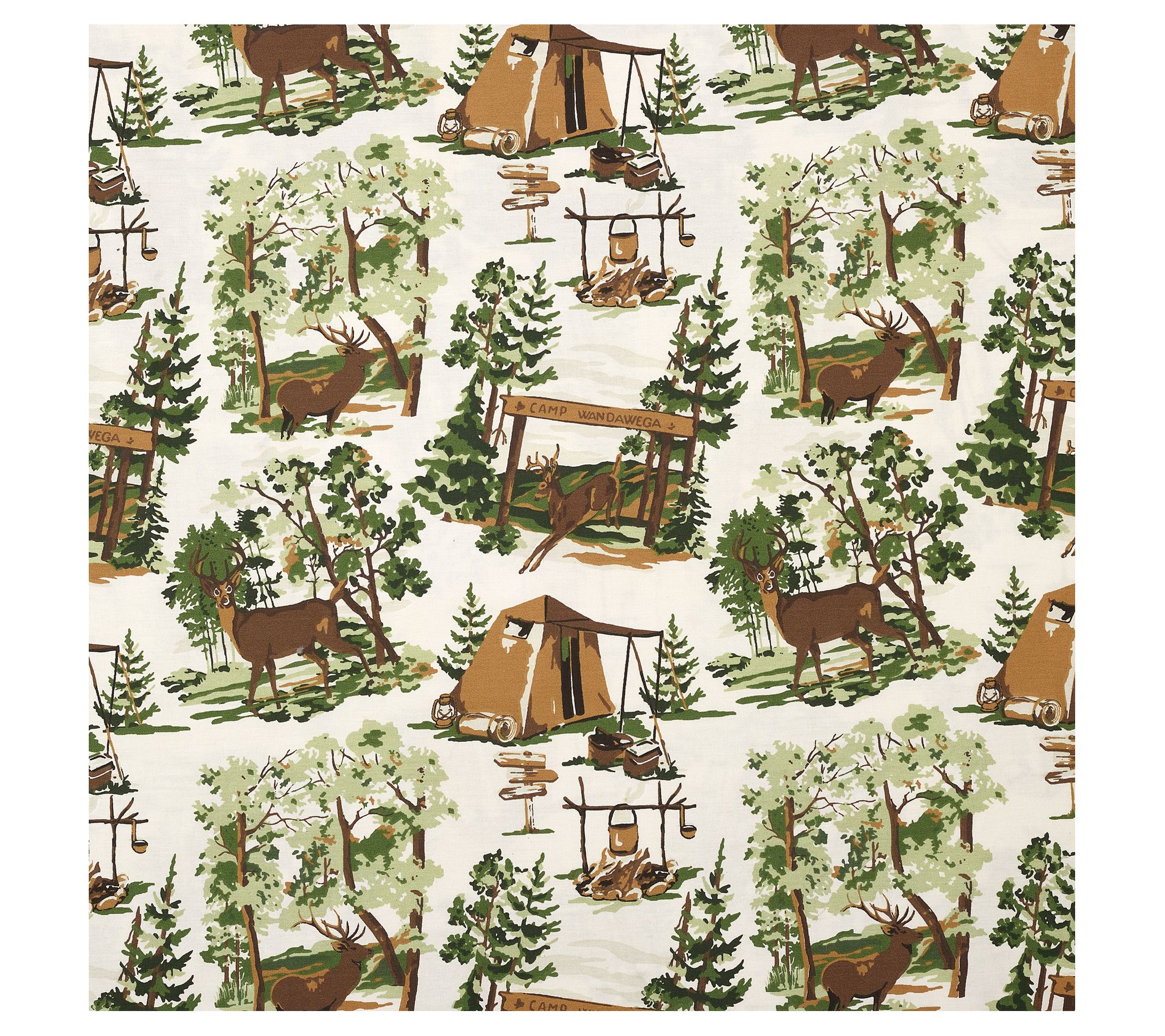 Bring the nostalgic charm of the great outdoors into your bedroom with the Camp Wandawega full sheet set. Inspired by vintage barkcloth designs, these 100% cotton percale sheets feature scenes reminiscent of 1960s and '70s camping adventures. From Makers Collective.