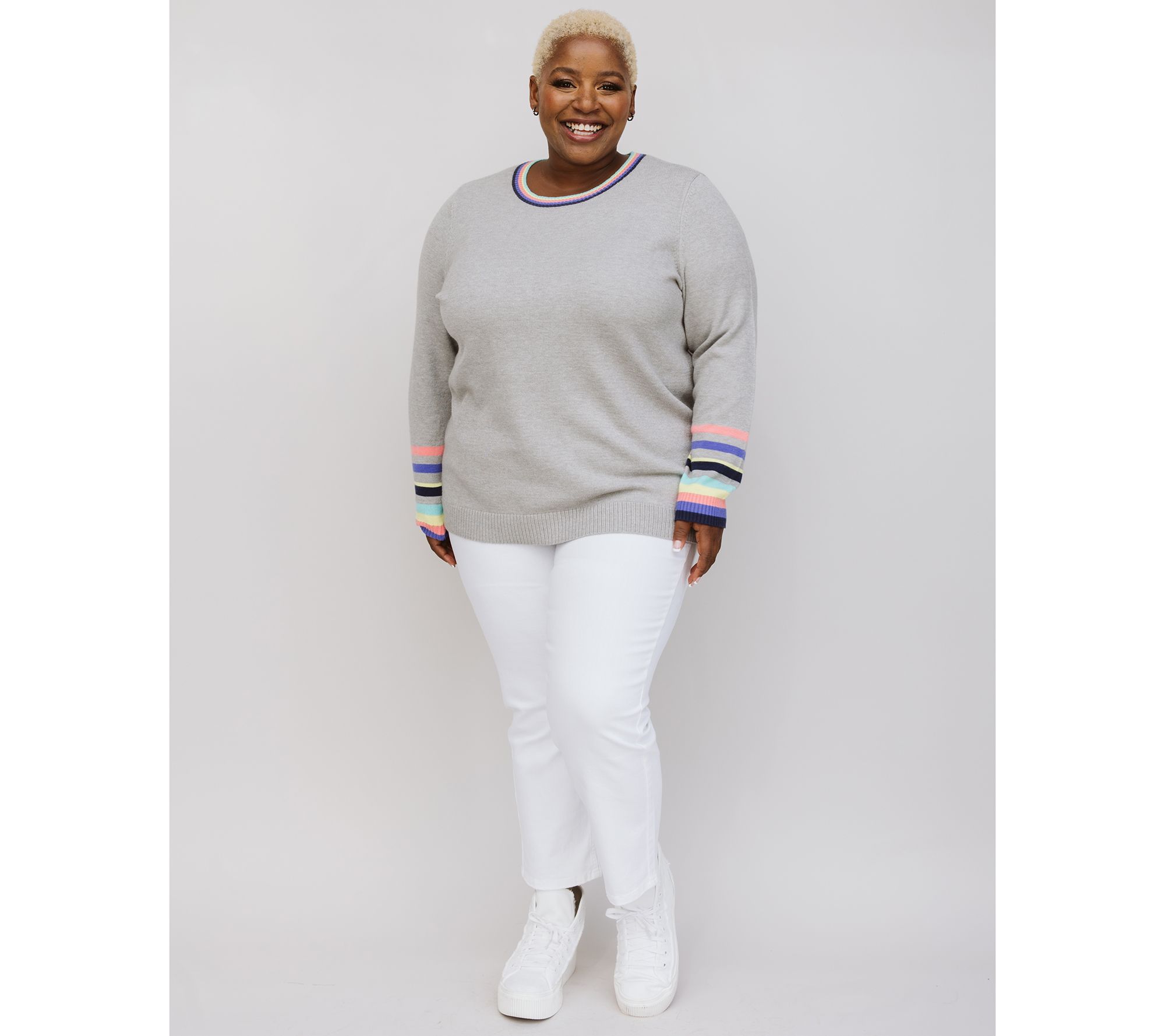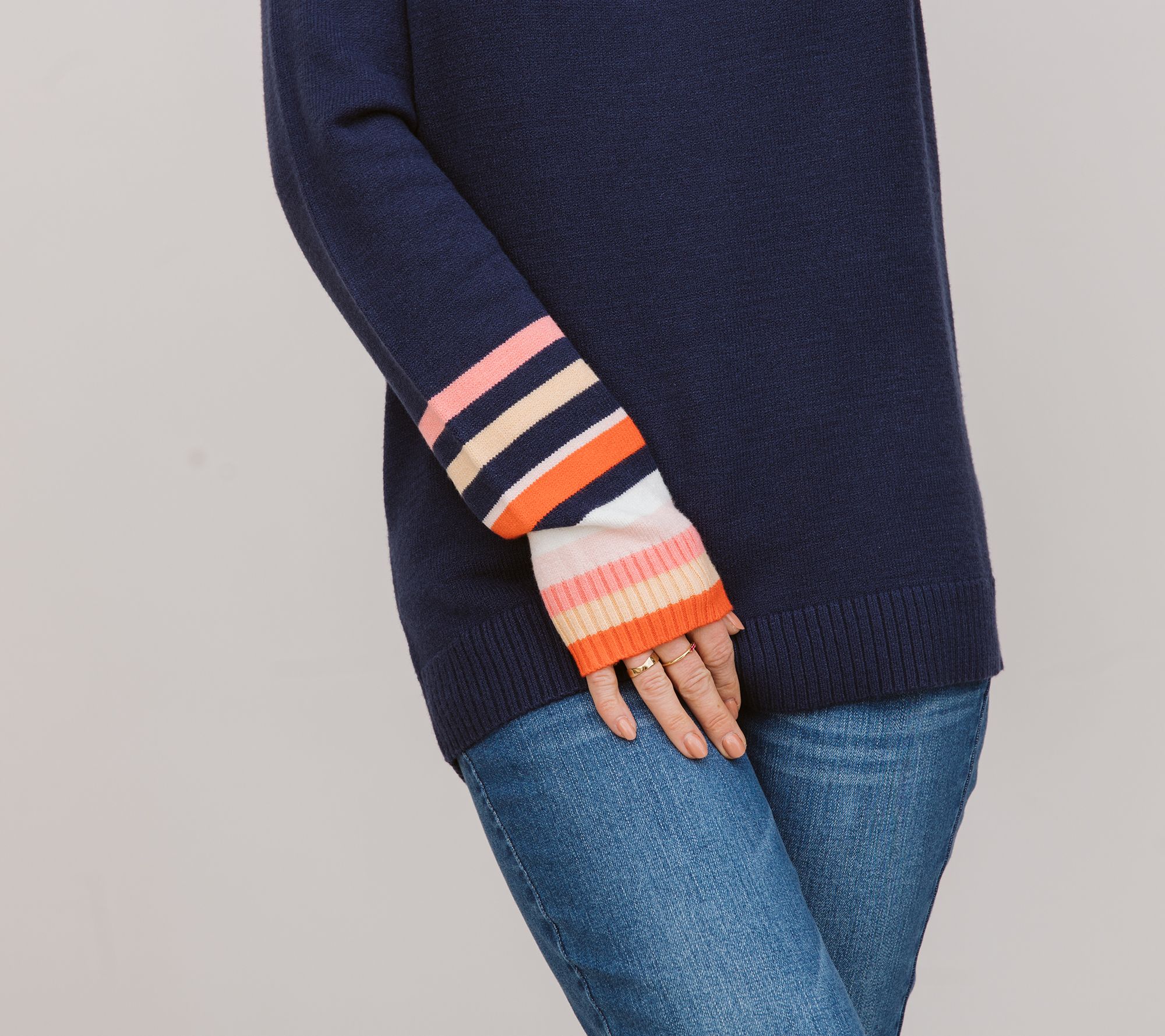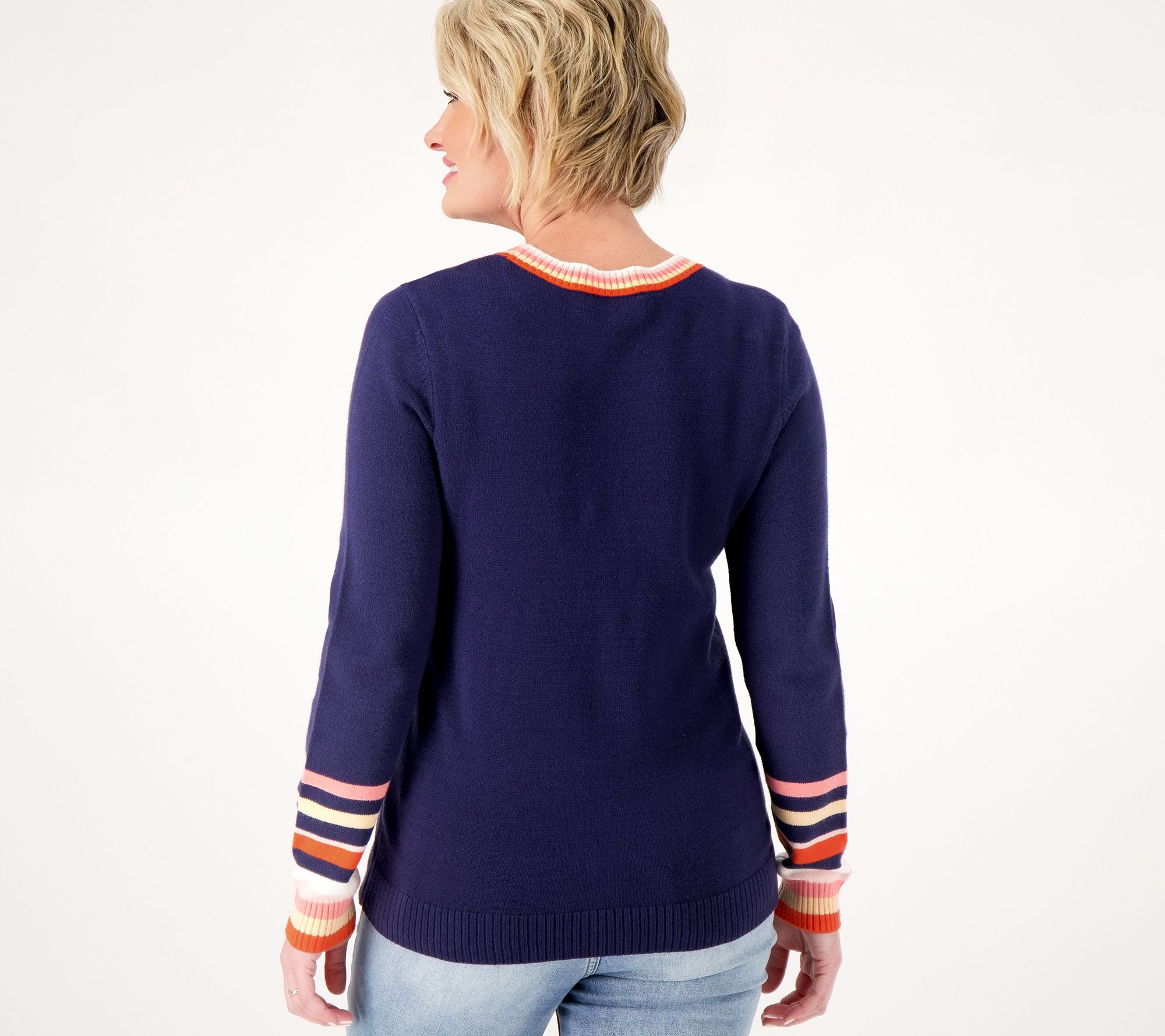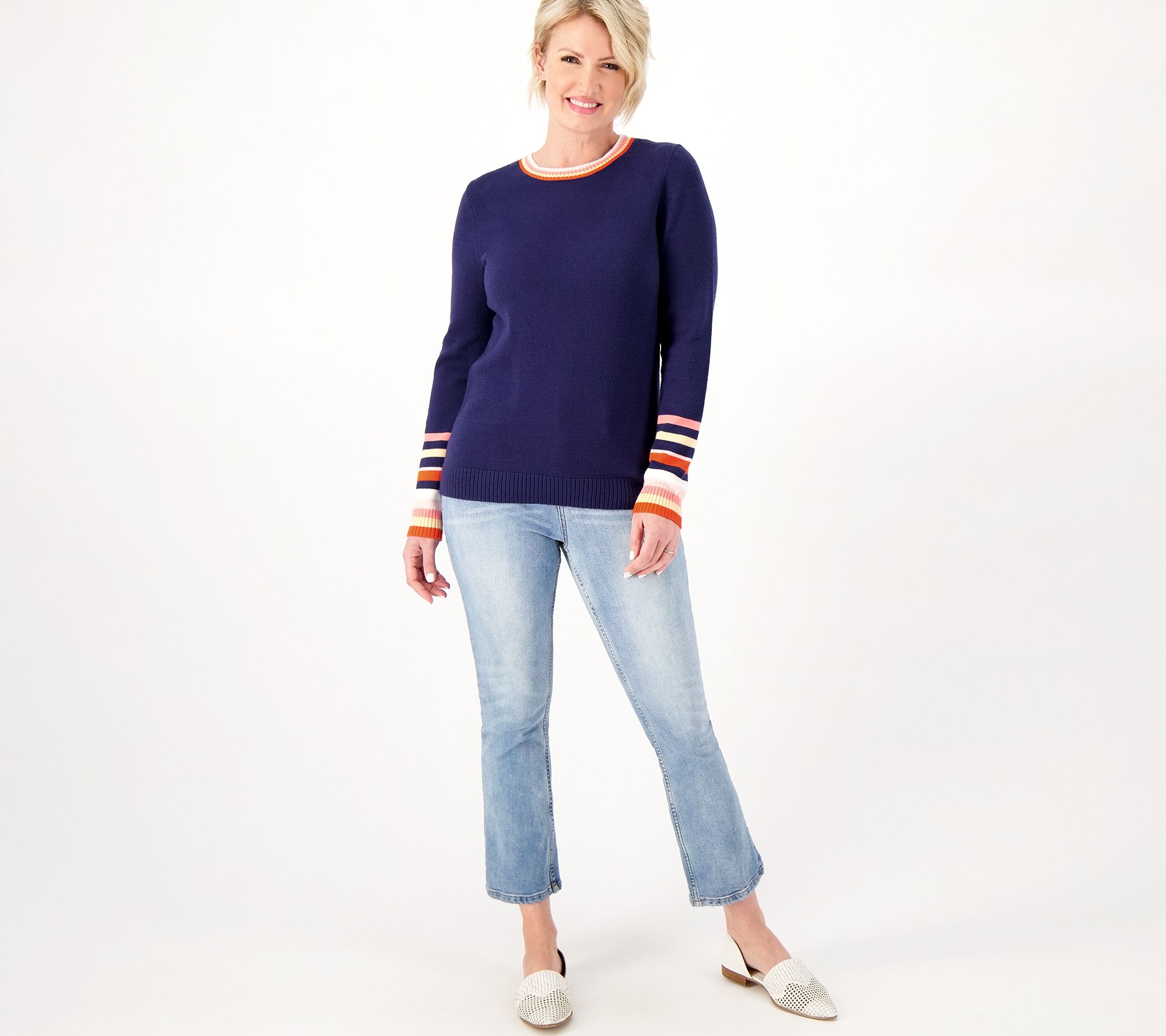 Flattering, comfy, and oh-so-stylish this multi-stripe cuff sweater is your new favorite throw-it-on-and-go find! From Candace Cameron Bure.