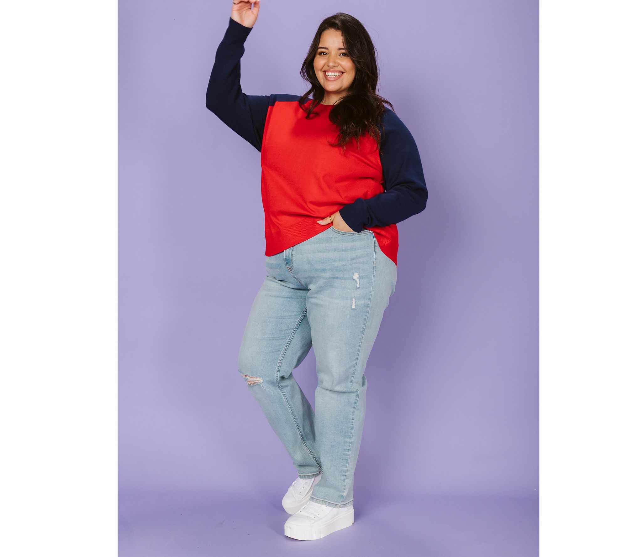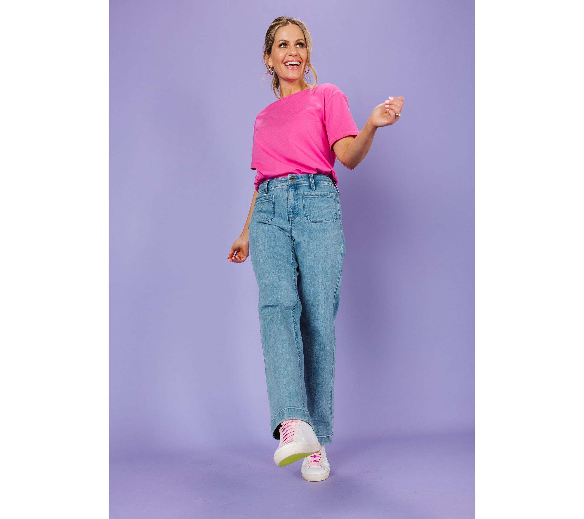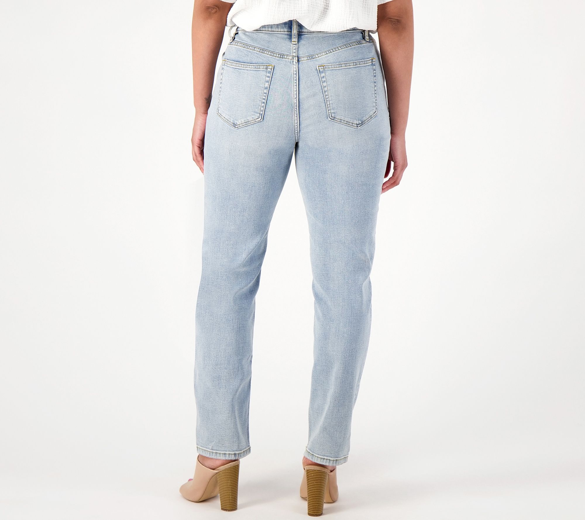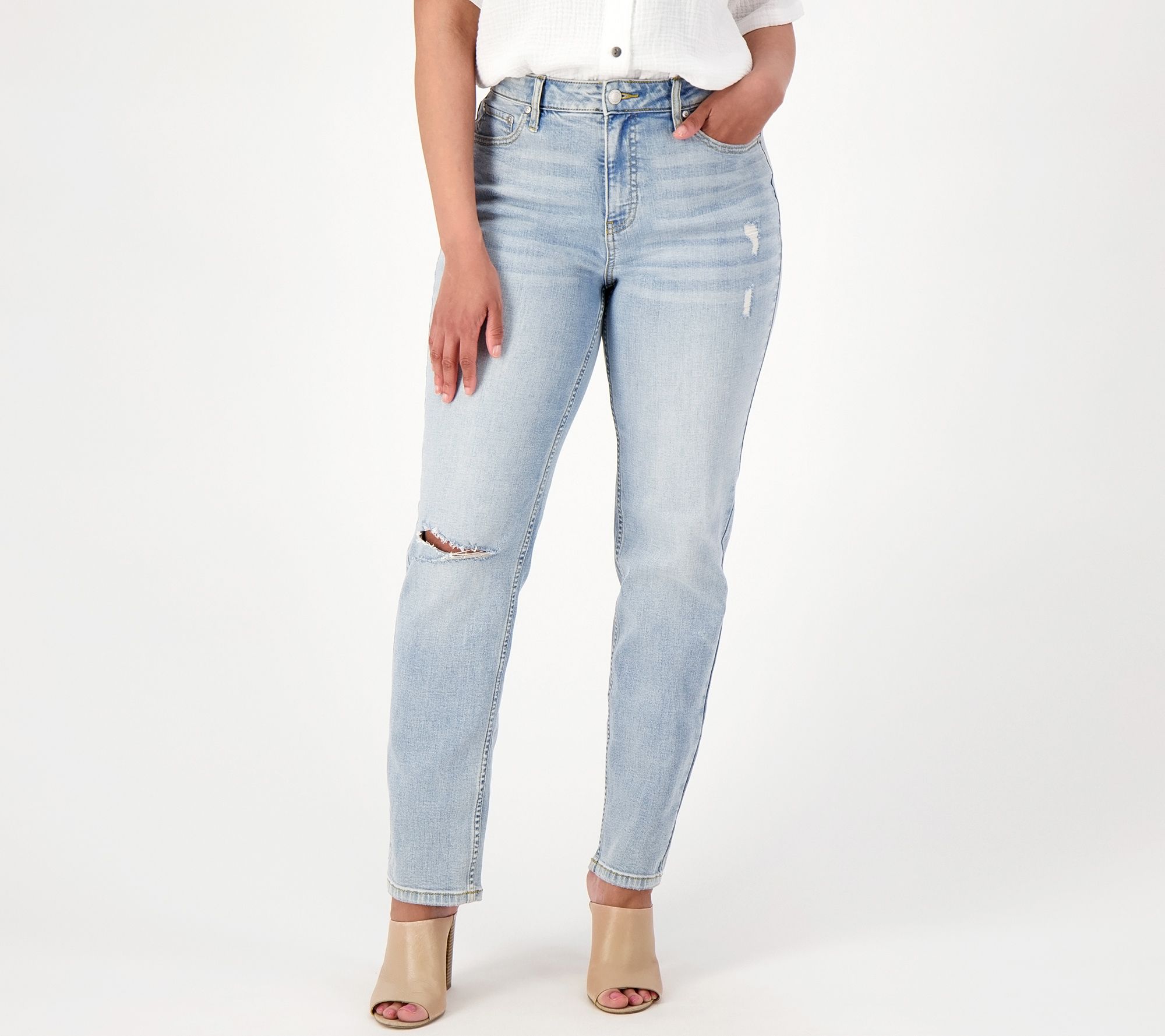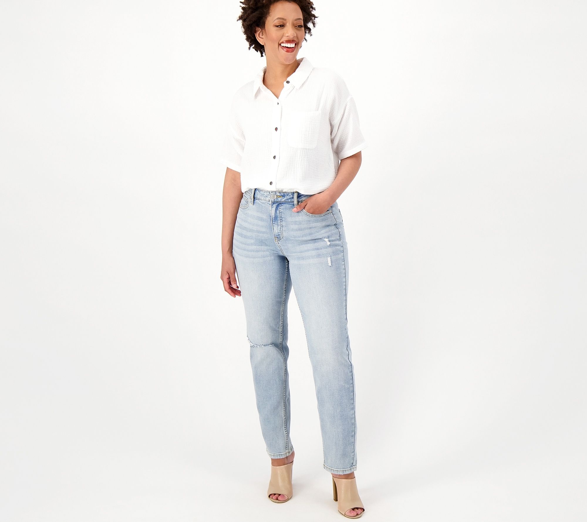 Distressed details add a laid-back, cool-girl vibe to this straight-leg denim. Dress it up with heels and a button-front blouse or dress it down with sneakers and a graphic-print tee. From Candace Cameron Bure.