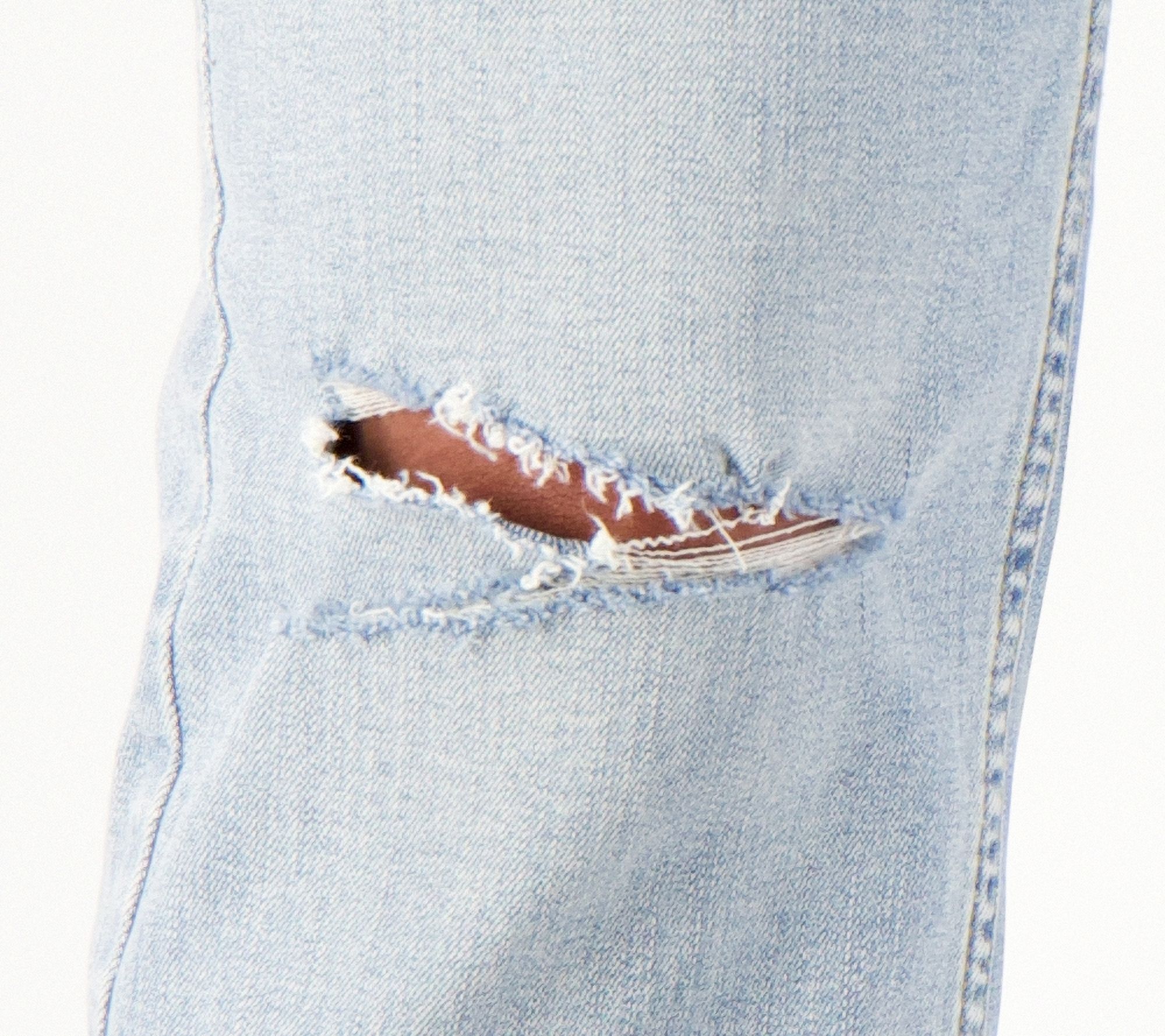 Features: contour waist, rivet at coin and front scoop pockets, back patch pocket, destruction details, knicking at hem