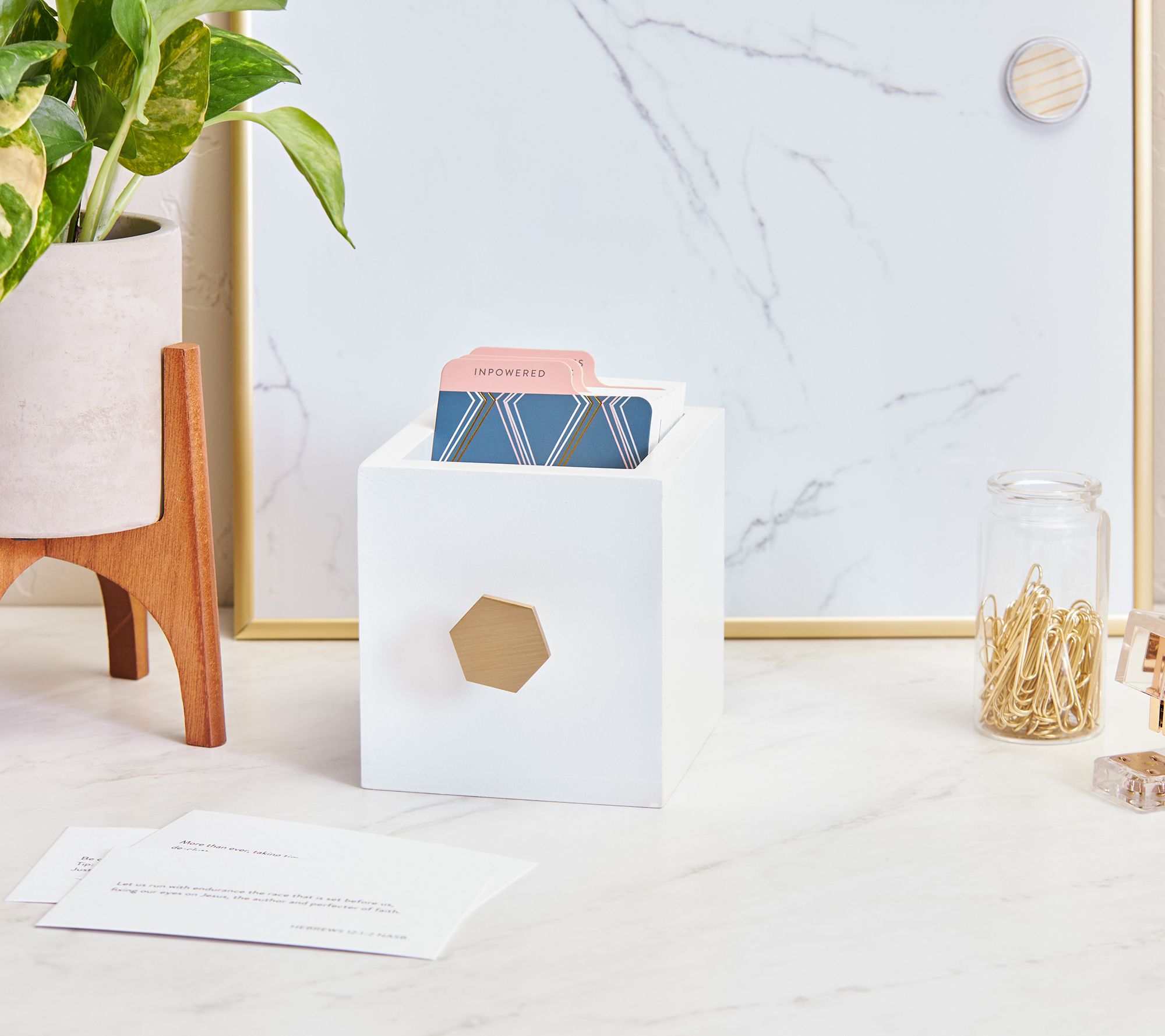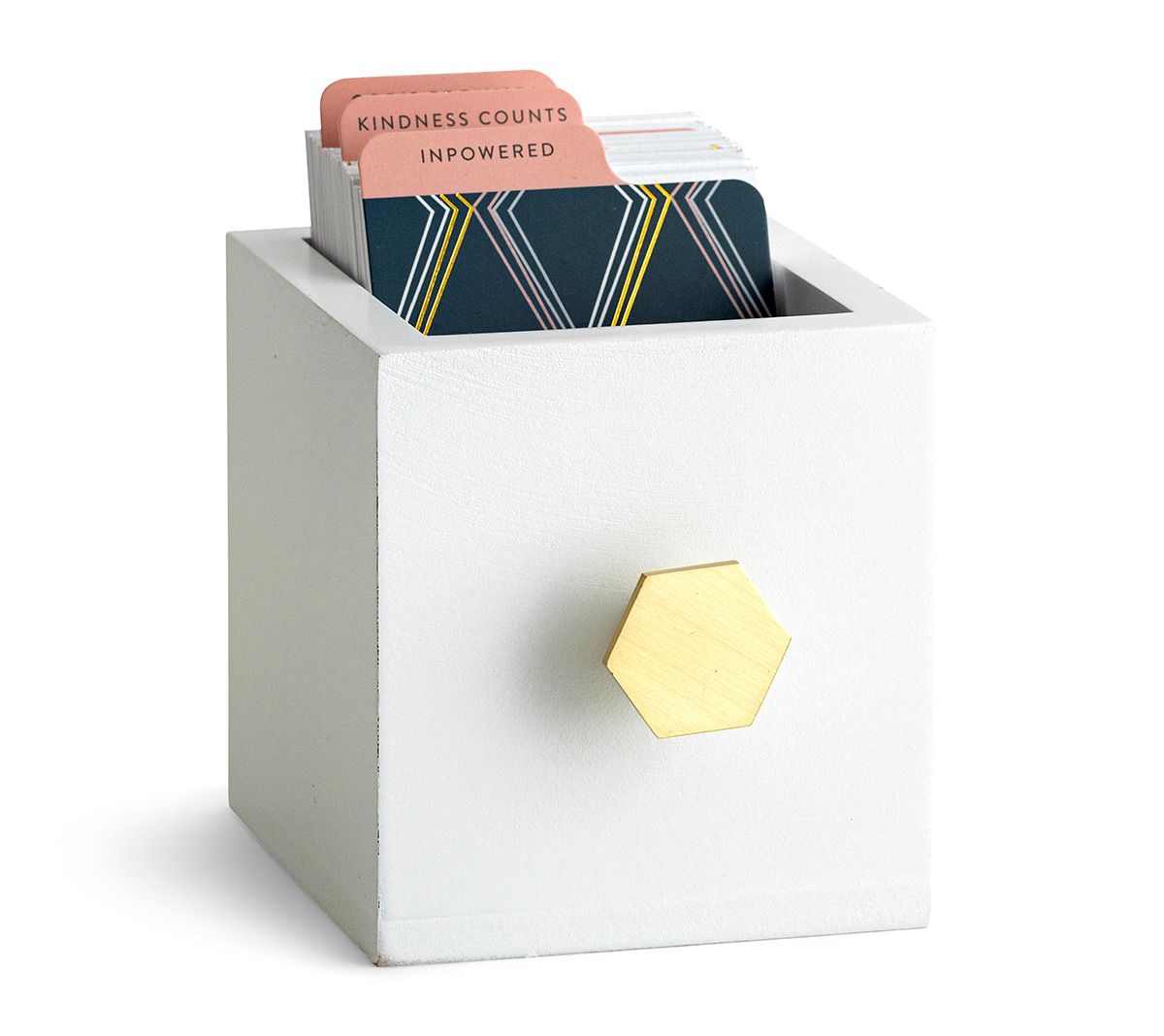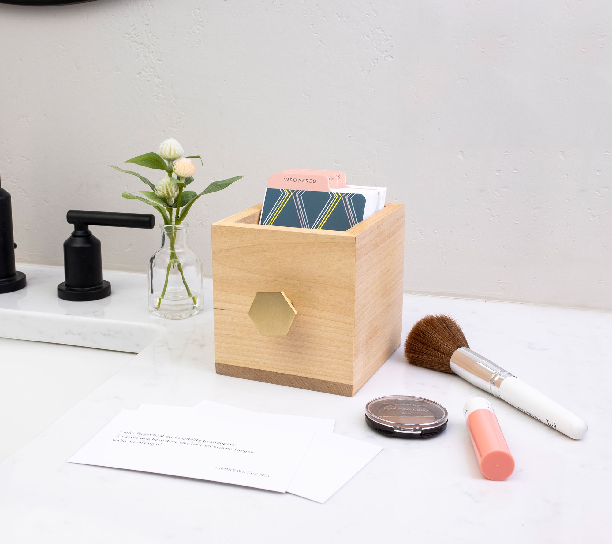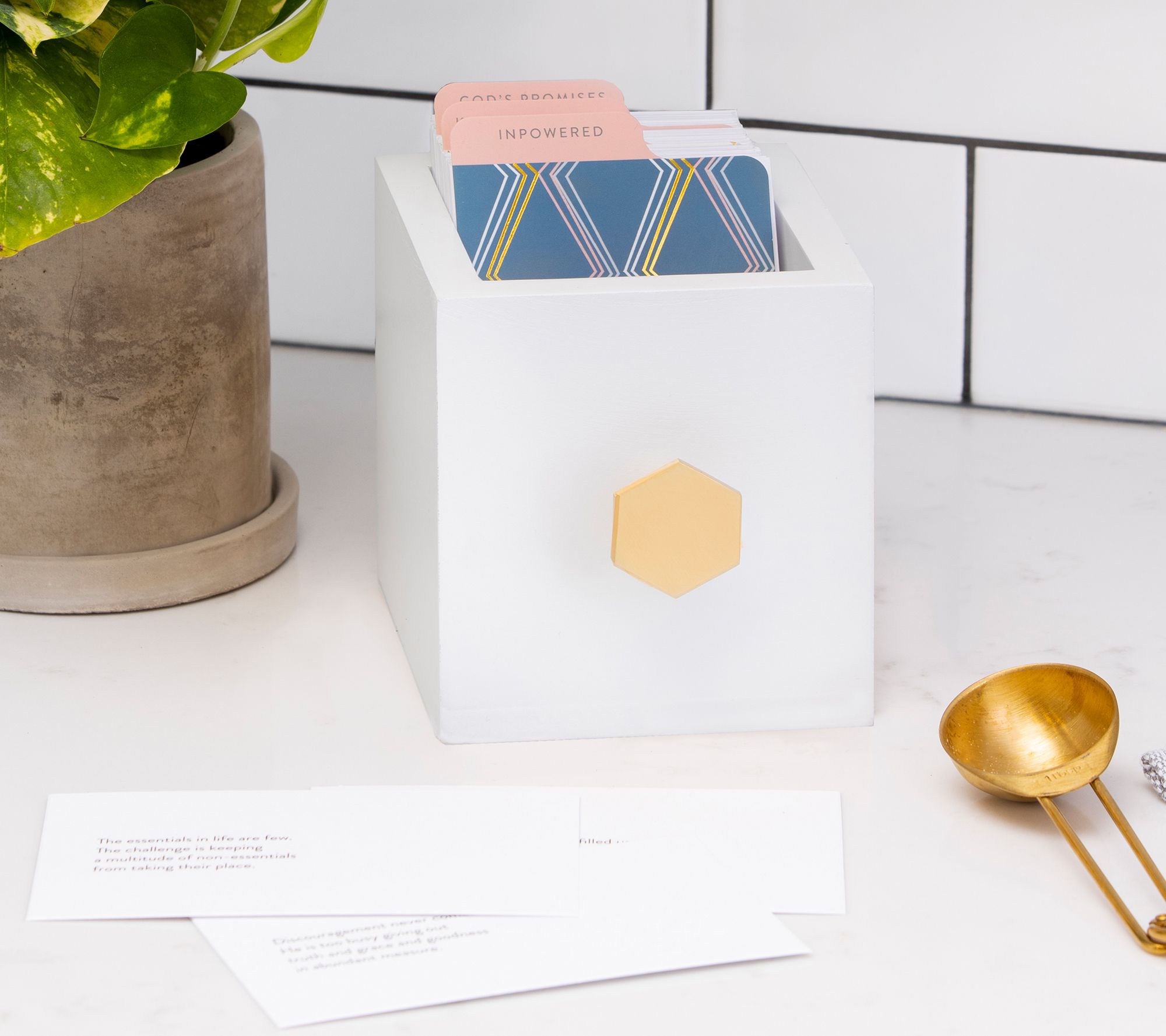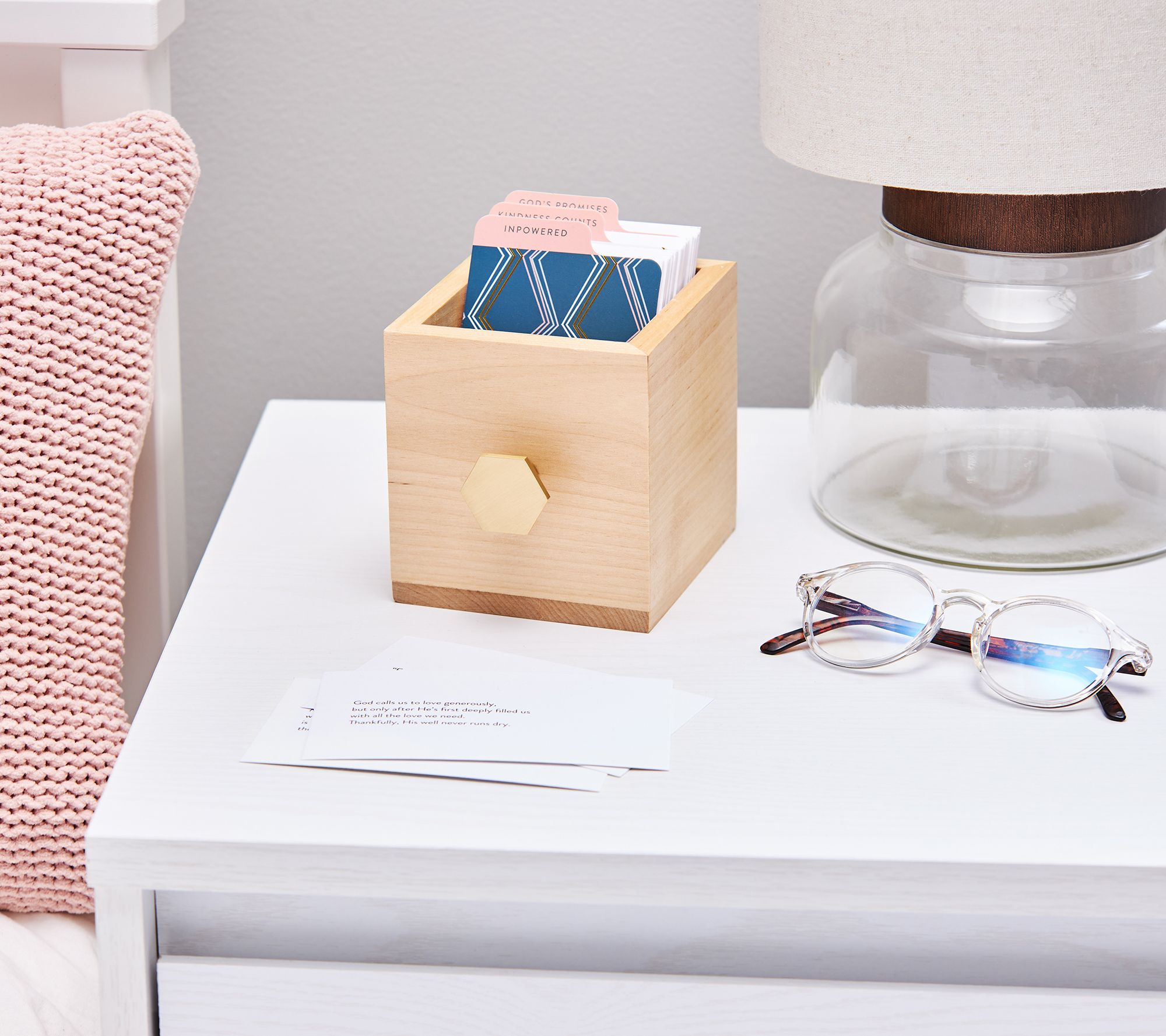 • Includes wooden box with decorative metal handle; 90 cards with encouraging themes that includes promises, empowerment, and kindness; and dividing tabs
