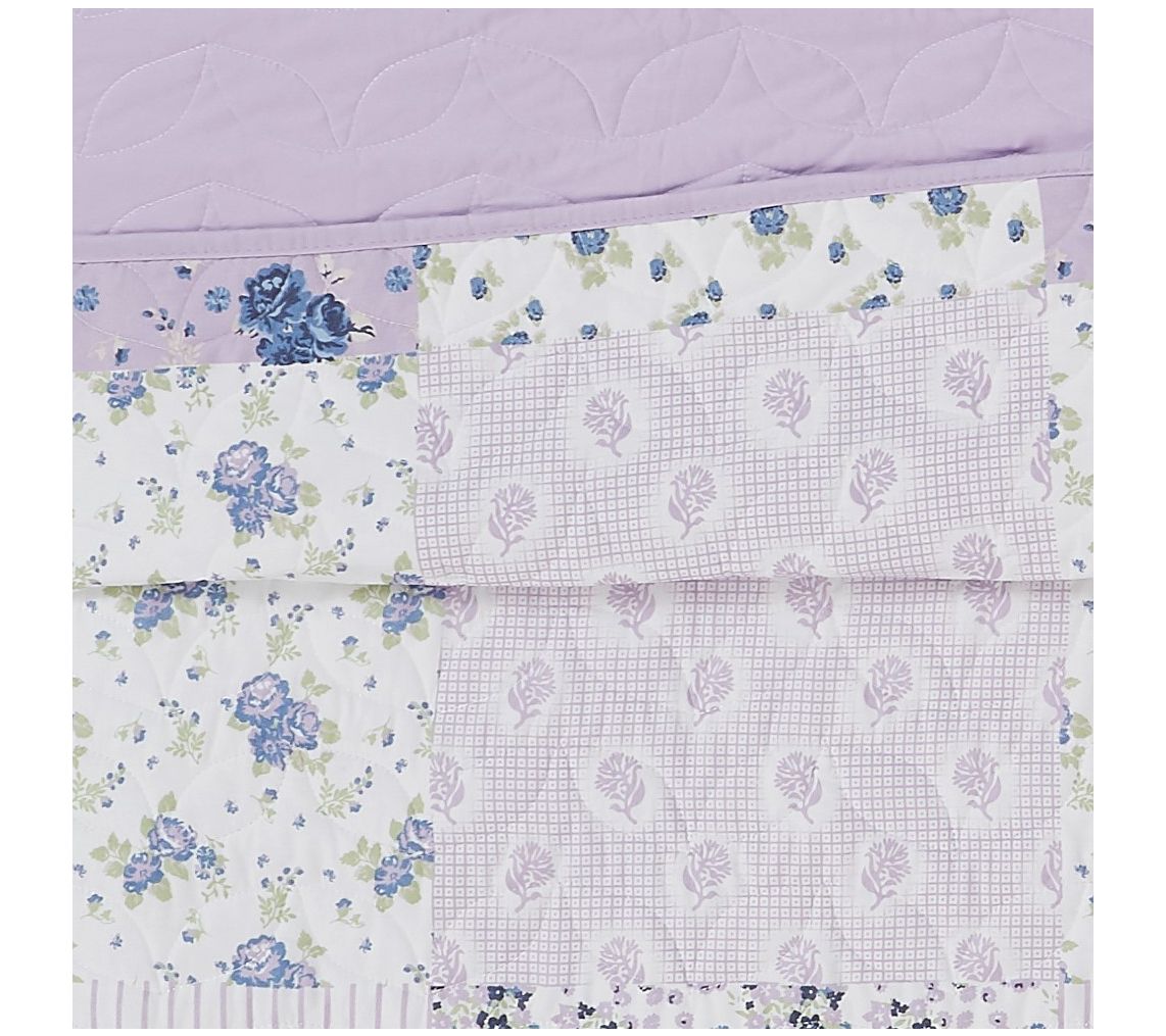 Cannon's Elissa Patchwork quilt set is a new twist on a classic style. This bedding set features a leaf quilt stitch and a variety of printed patchwork designs with soft watercolor blue and purple florals, reversing to a solid light purple. From Cannon.