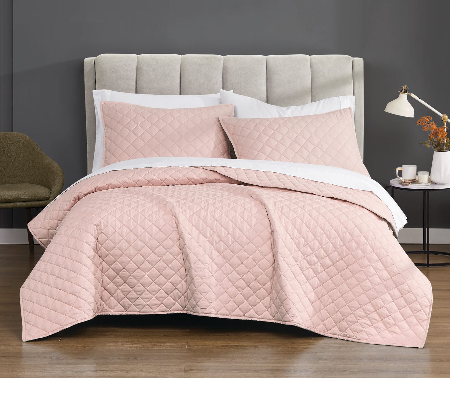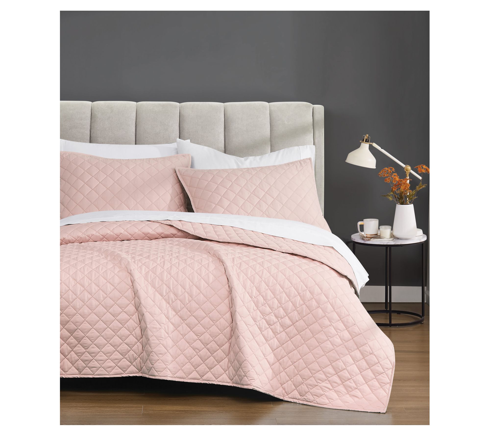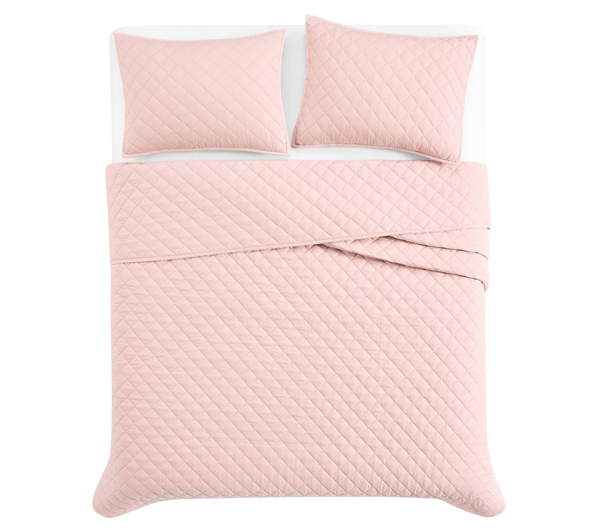 Transform your bedroom into a serene escape with this cotton quilt set. Its luxurious percale weave and breathable threads offer a soft, smooth touch, complemented by a chic diamond stitching and a generous flange for added elegance. From Cannon.