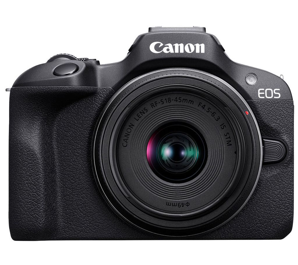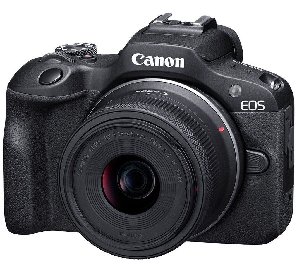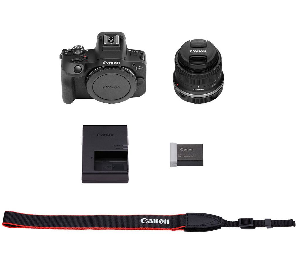 Includes EOS R100 mirrorless digital camera with lithium-ion battery pack, battery charger, camera cover, neck strap, battery pack cover, RF-S 18-45mm f/4.5-6.3 IS STM lens, lens cap, and dust cap